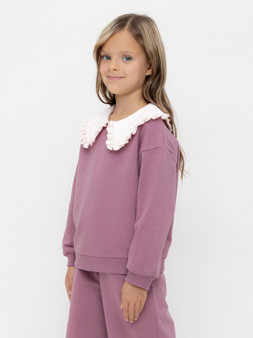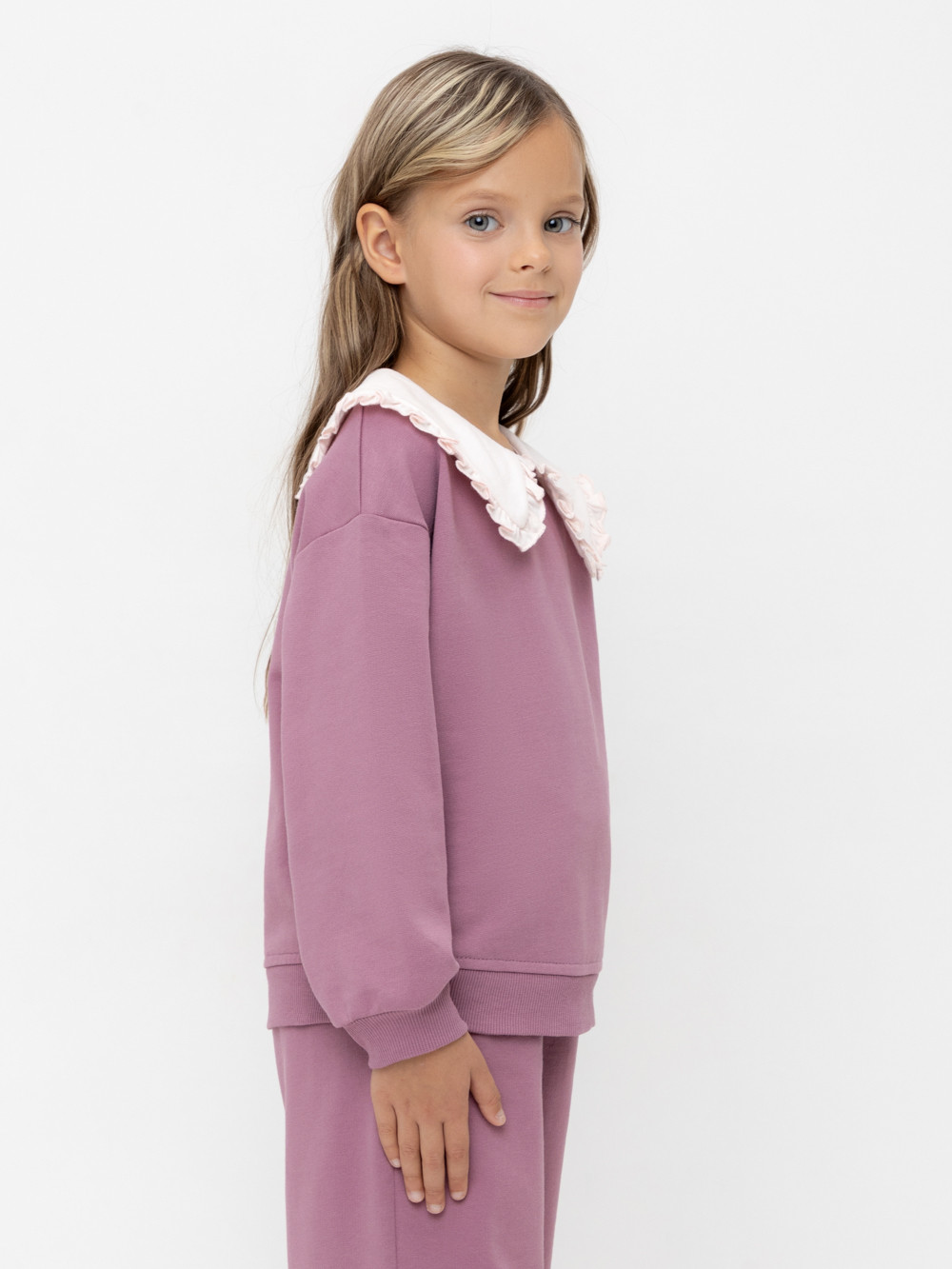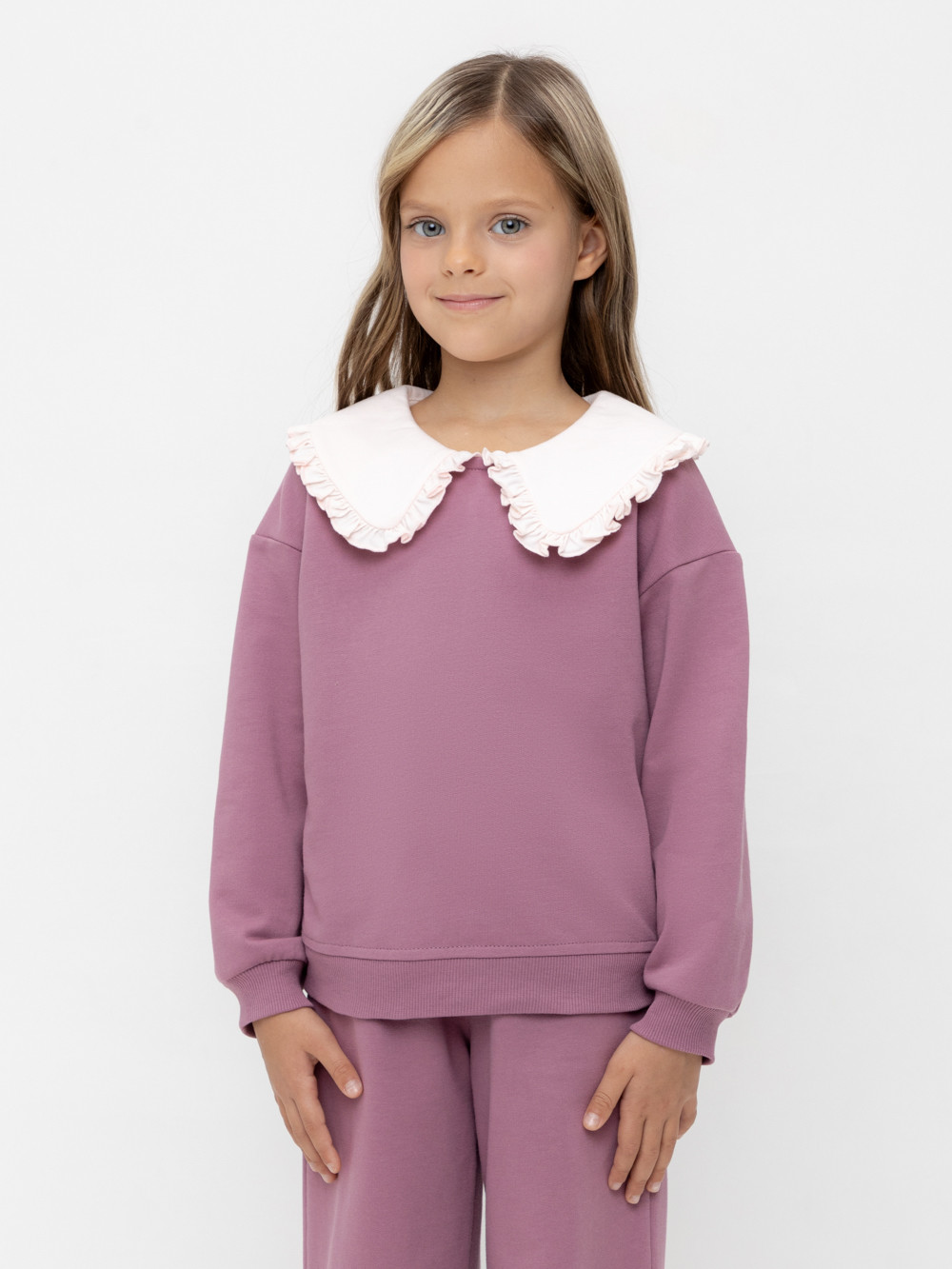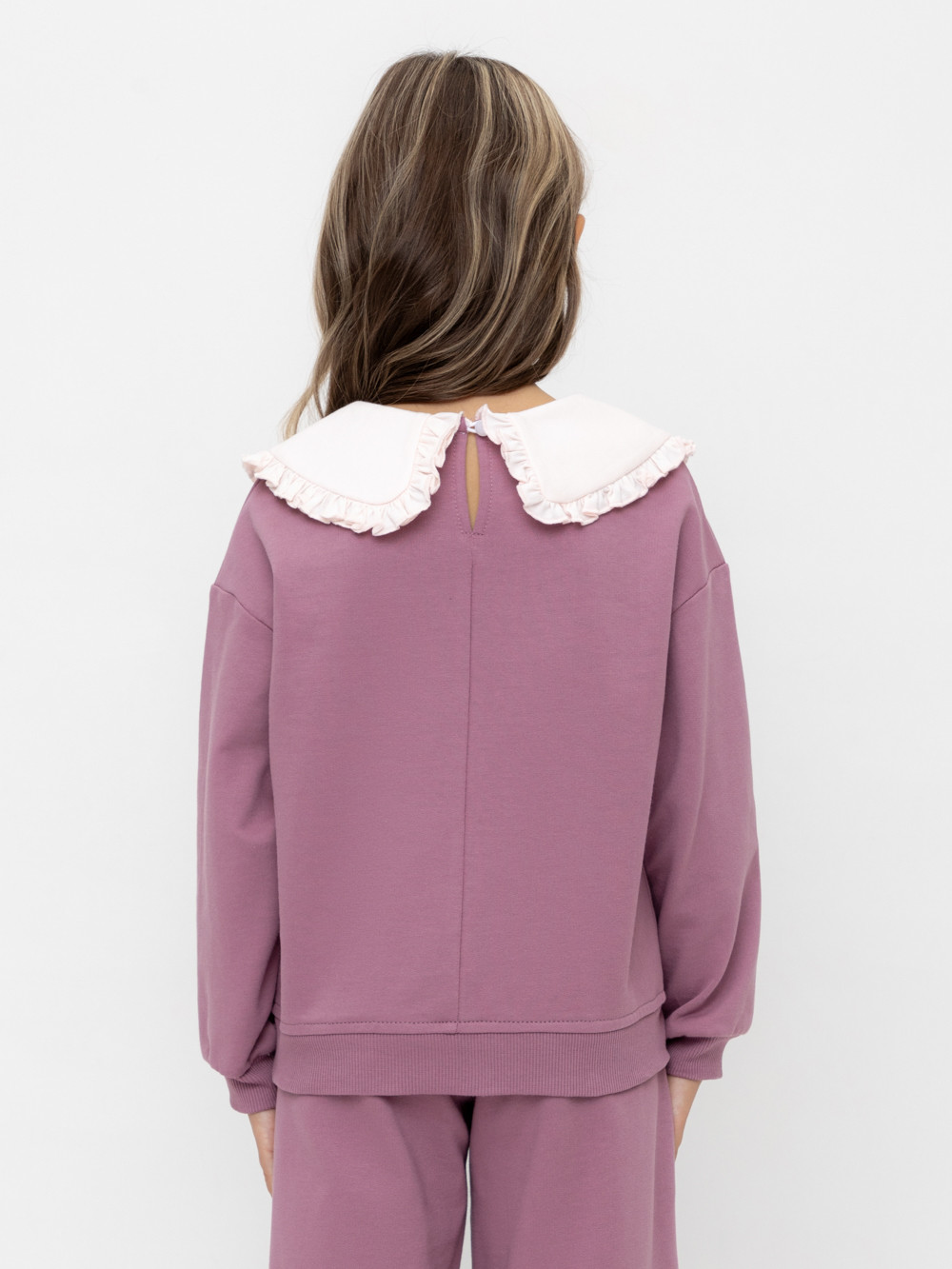Свитшот с воротником для девочки из высококачественного трикотажафутера петли. Застёгивается на спинке с помощью пуговицы. Пояс и рукава выполнены из эластичного трикотажа. Изделие сохраняет цвет и форму после многократных стирок.