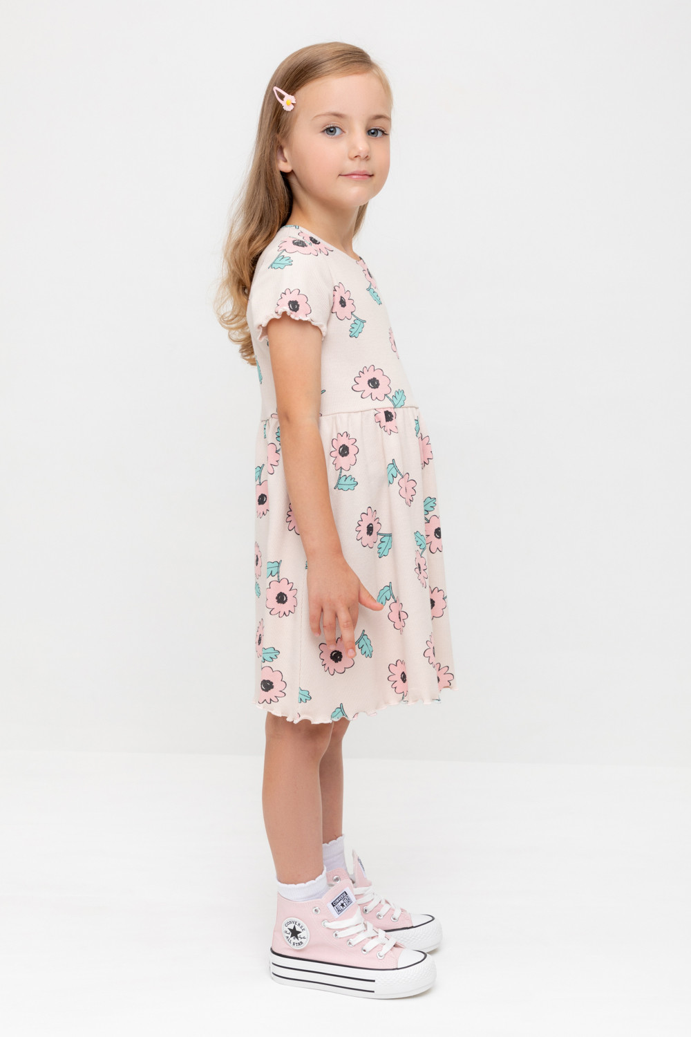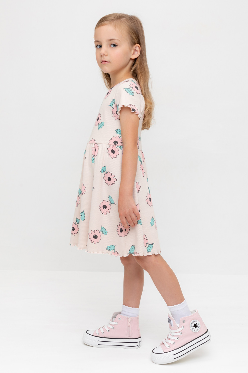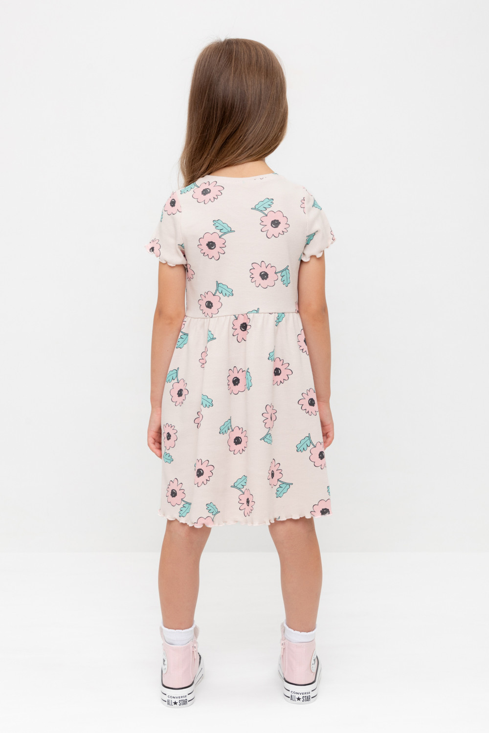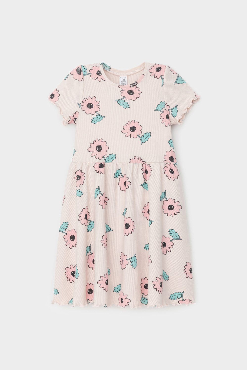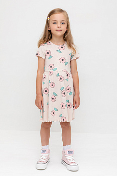 Летнее платье для девочки из эластичного трикотажа в рубчик. Оригинальная набивка выполнена из стойких текстильных гипоаллергенных красителей.
