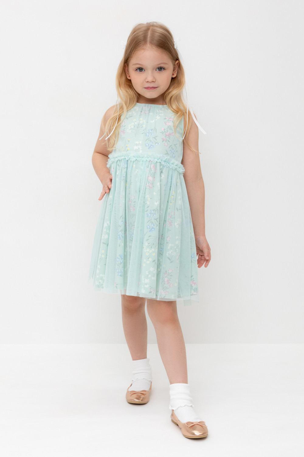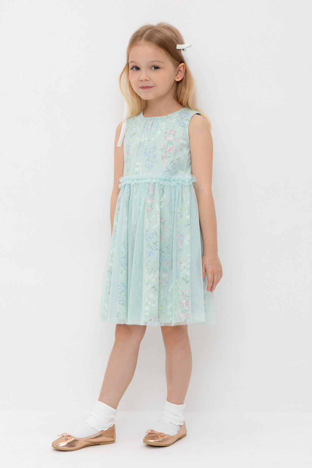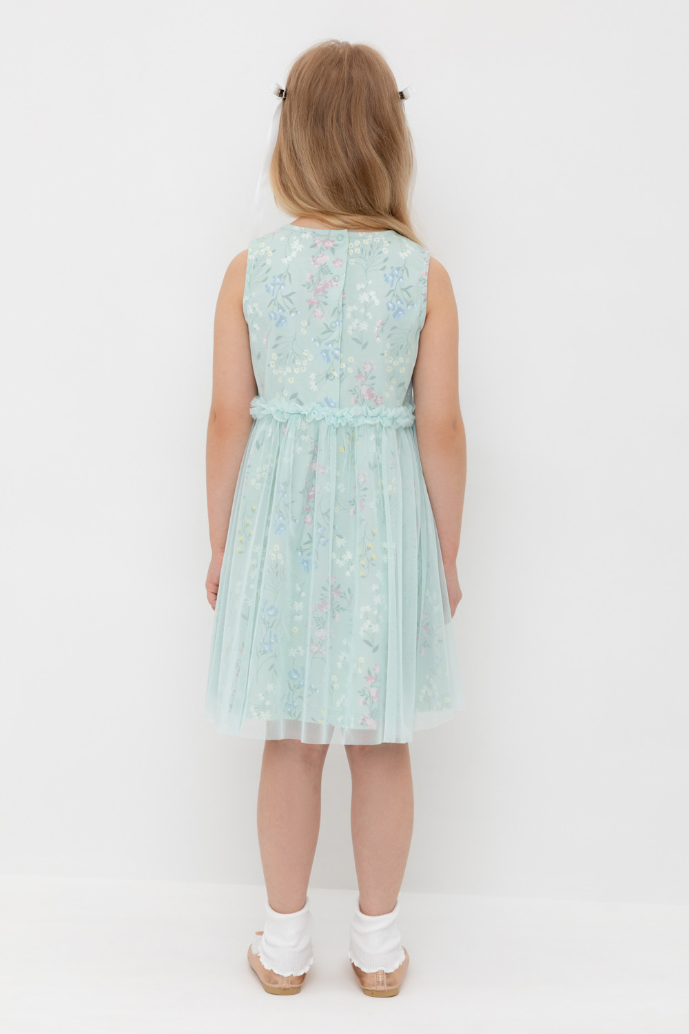 Легкое нарядное платье для девочки из высококачественного трикотажа, верхний слой - из сетки. Застёгивается на спинке с помощью кнопок. Оригинальная набивка выполнена из стойких текстильных гипоаллергенных красителей. Изделие сохраняет цвет и форму после многократных стирок.
