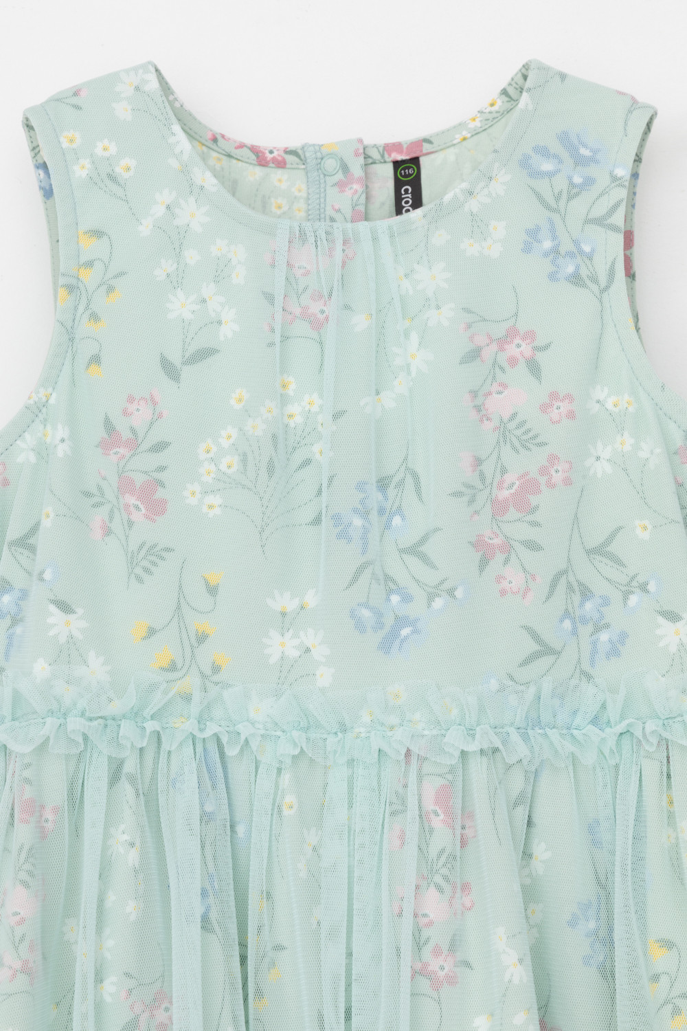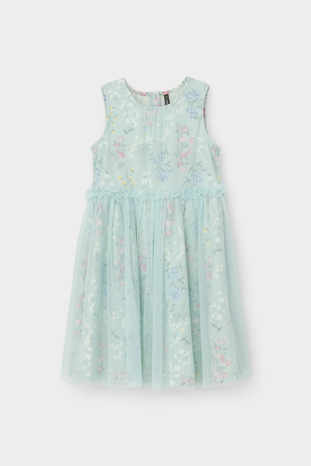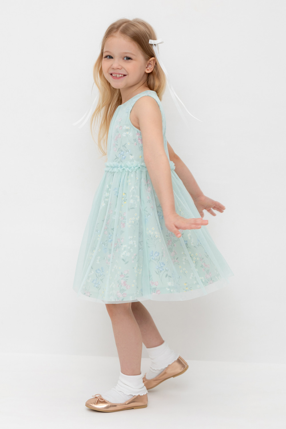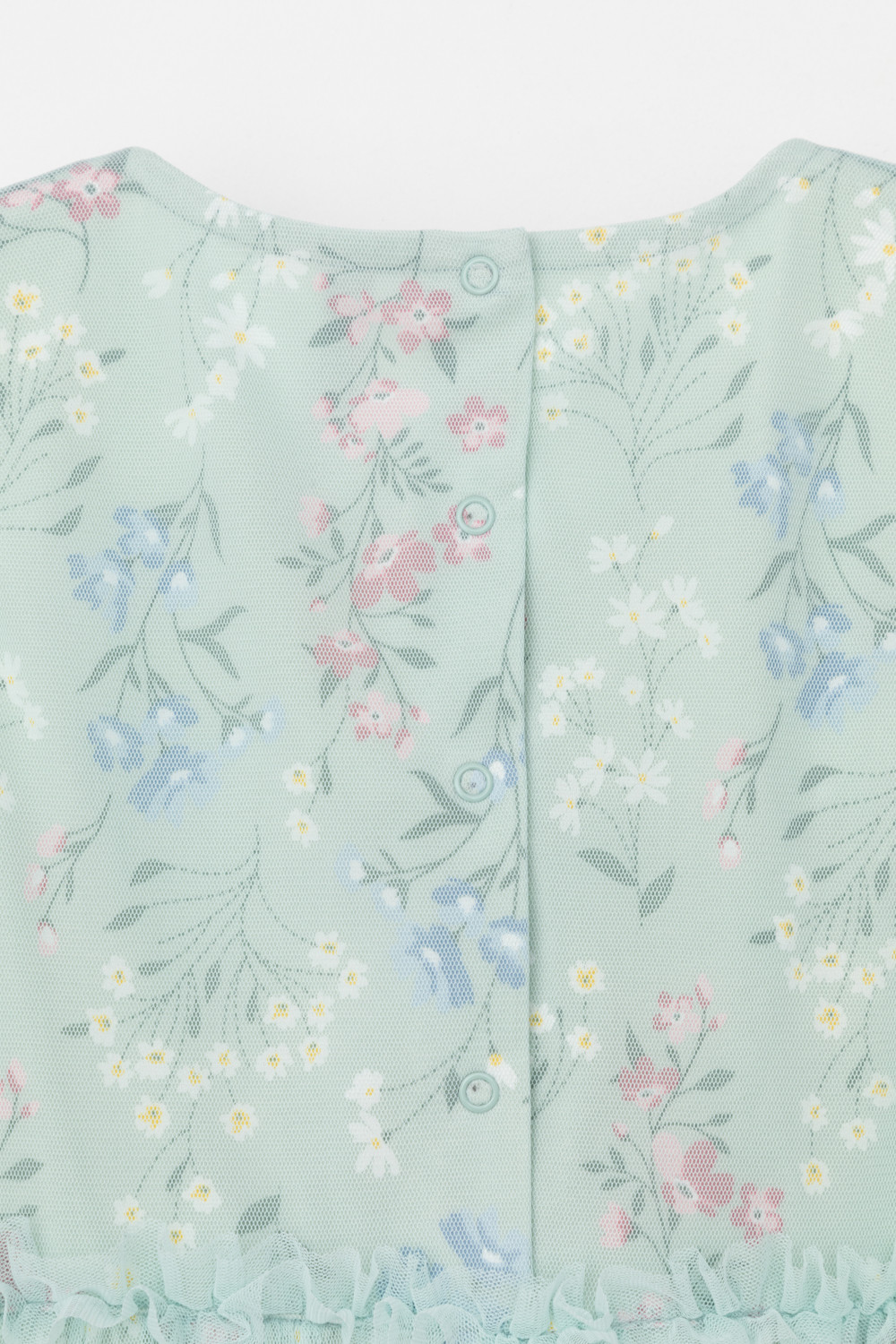 Легкое нарядное платье для девочки из высококачественного трикотажа, верхний слой - из сетки. Застёгивается на спинке с помощью кнопок. Оригинальная набивка выполнена из стойких текстильных гипоаллергенных красителей. Изделие сохраняет цвет и форму после многократных стирок.