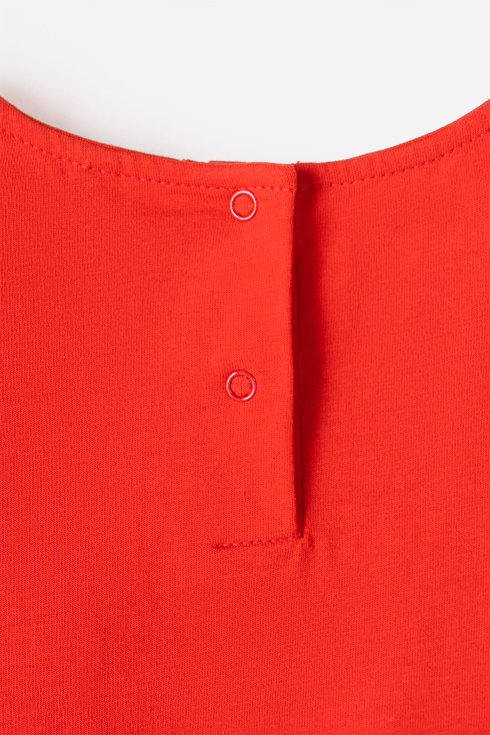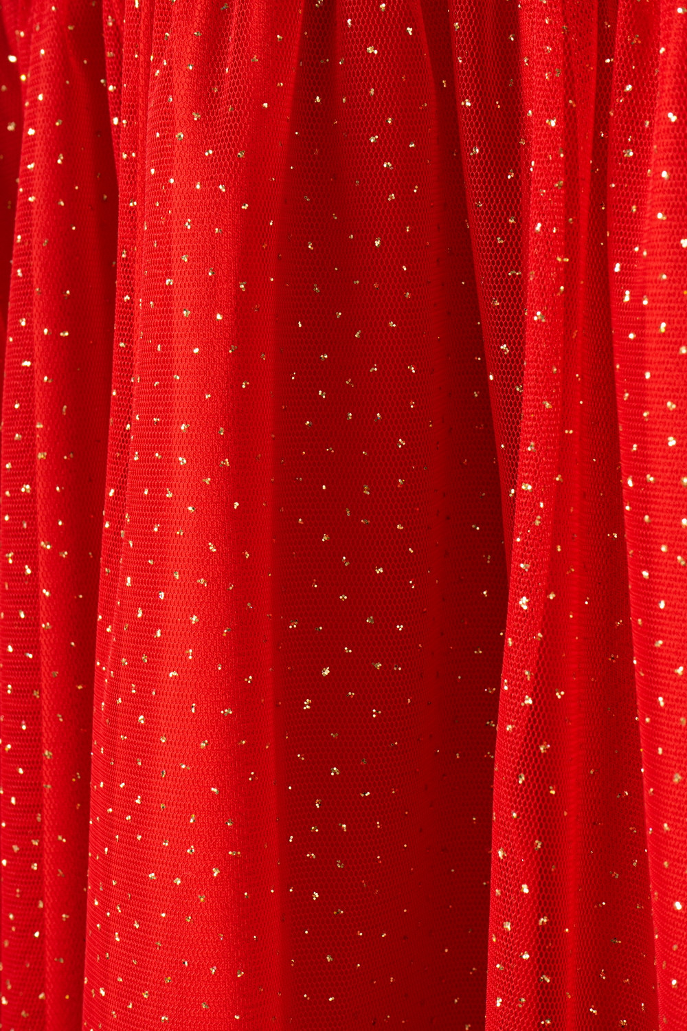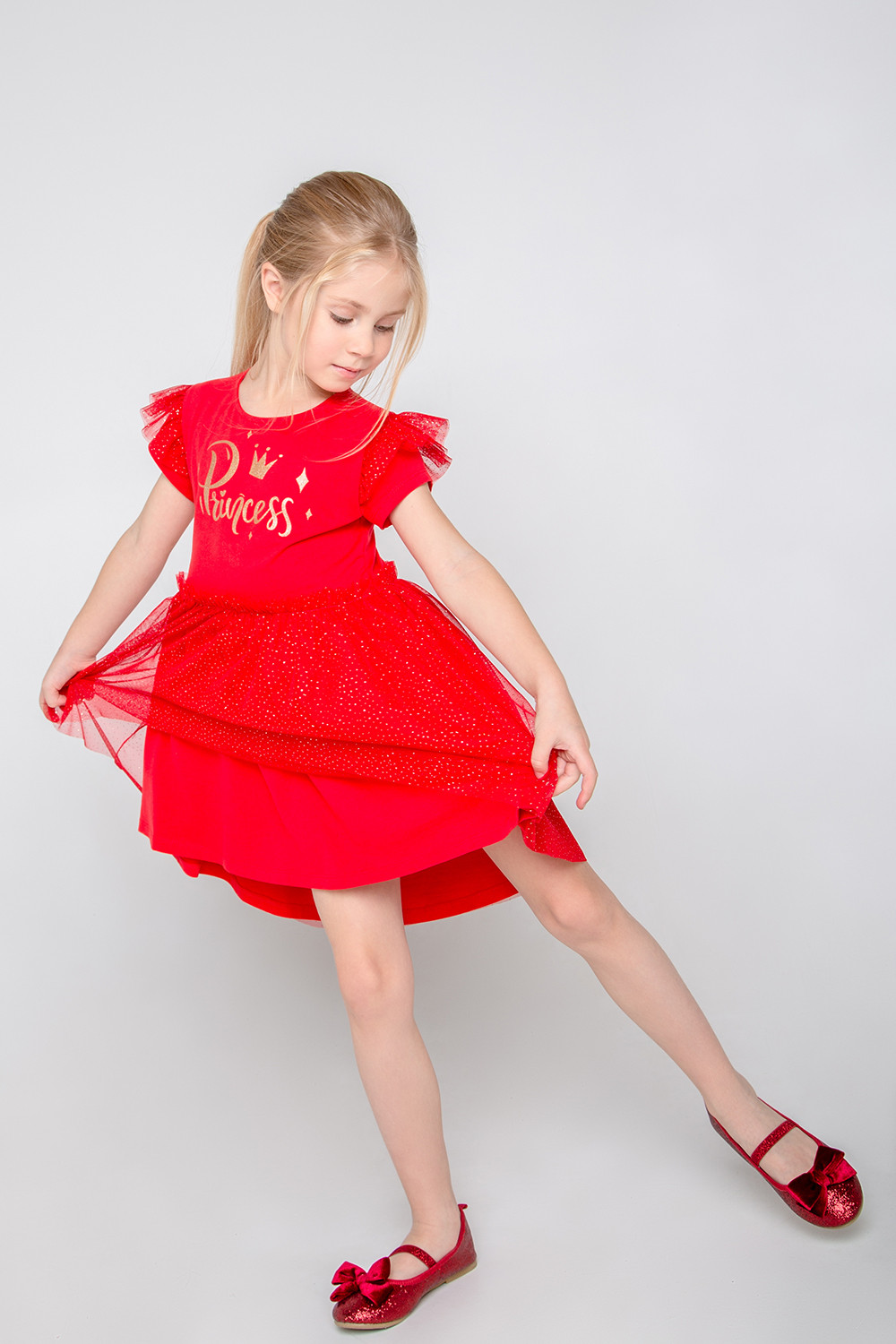 Нарядное красное платье. Лиф из супрема украшен принтом. Верхний слой юбки сделан из сетки с золотыми блёстками, на талии красивая сборка. На рукавах оборка из сетки. До 98 размера для удобства при одевании застёгивается на спинке с помощью кнопок.