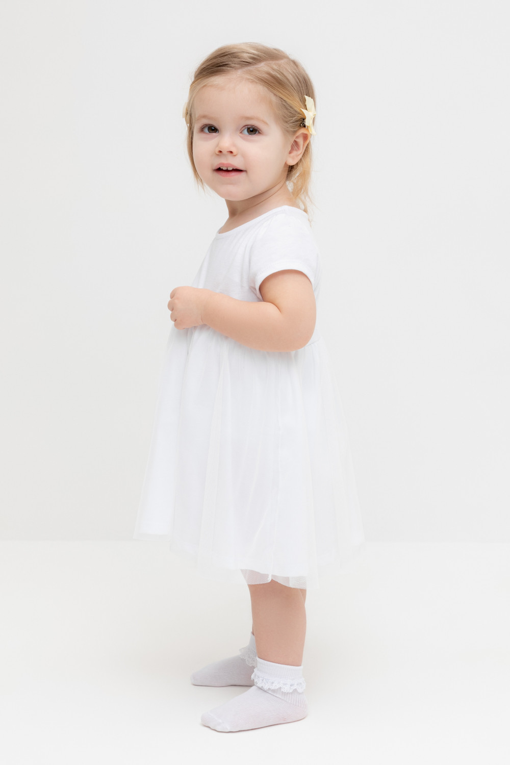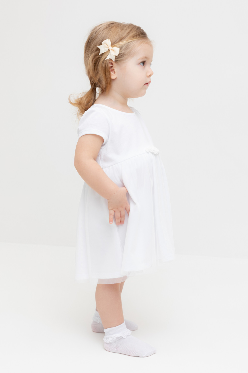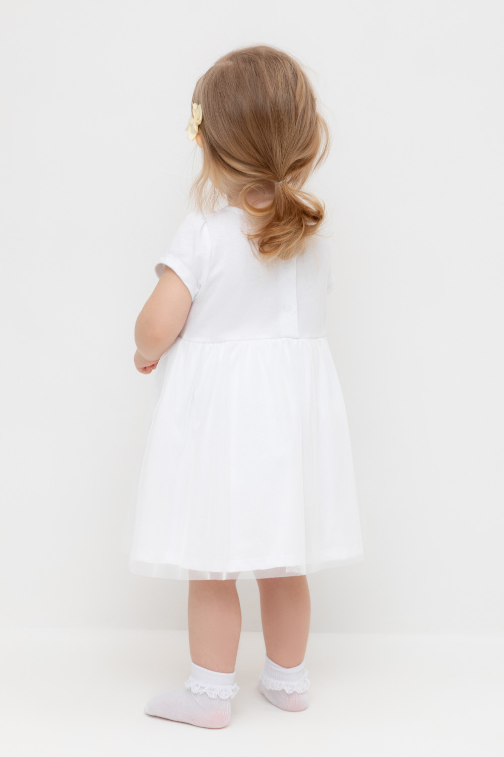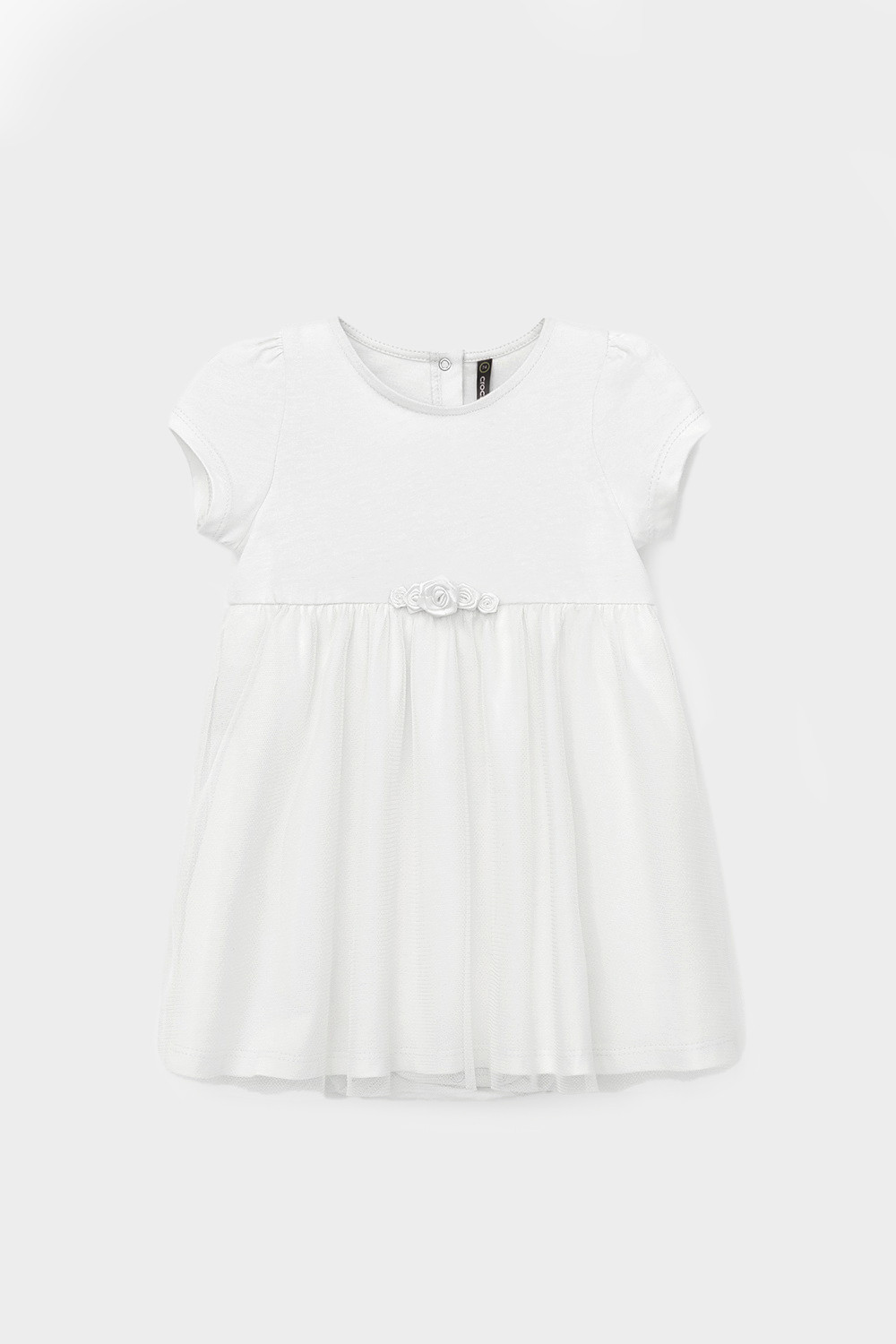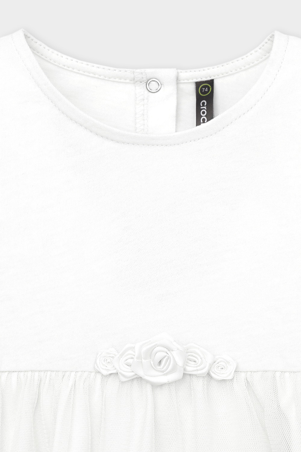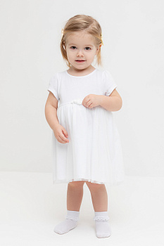 Нарядное платье с боди для девочки. Изготовлено из высококачественного хлопкового трикотажа супрем. Поверх юбки лёгкая сетка. Удобные застёжки расположены на спинке и по низу изделия. Спереди украшено декоративными розочками. Изделие сохраняет цвет и форму после многократных стирок.