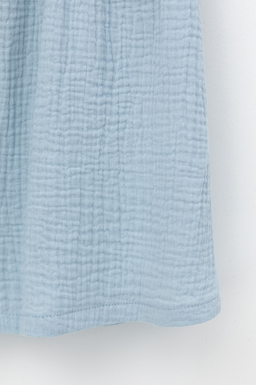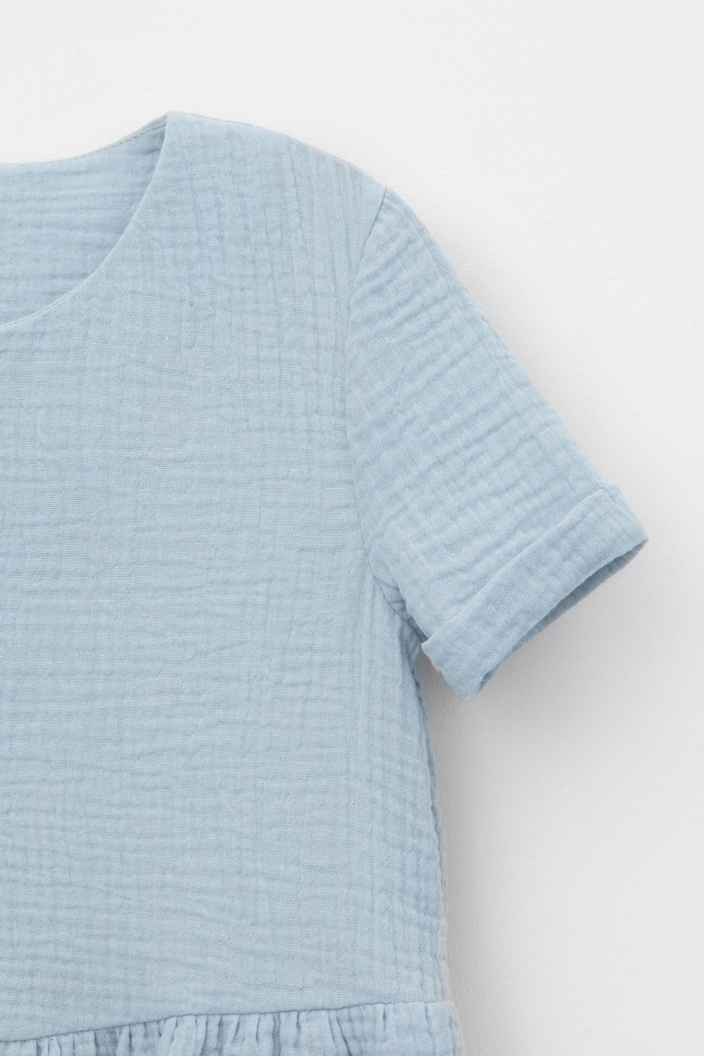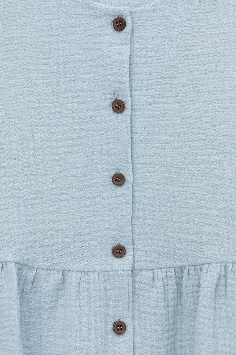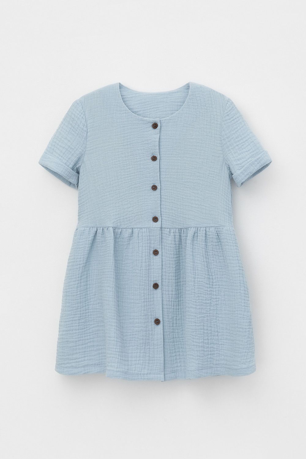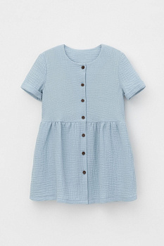 Легкое платье для девочки из мягкого хлопокового муслина со спущенной линией талии, сборкой и застежкой на пуговицы. Изделие сохраняет цвет, форму и фактуру жатости после многократных стирок.