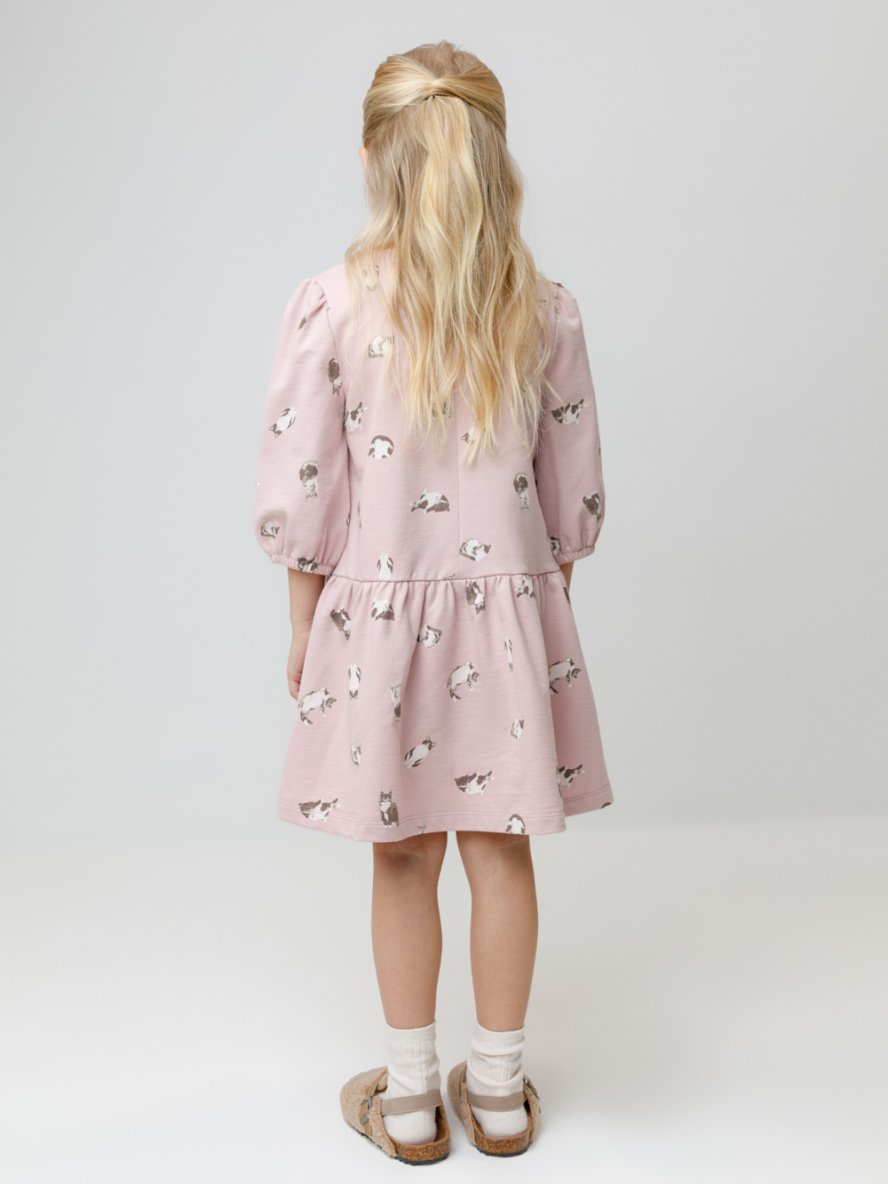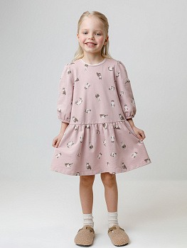 Платье для девочки с короткими рукавами из мягкого петельчатого трикотажа. Для удобства одевания платье на спинке застёгивается на пуговицу. Платье сохраняет форму и стойкий цвет после многочисленных стирок и идеально подходит на каждый день. Все трикотажные полотна производятся в соответствии с нормами швейцарского сертификата ЭкоТекс.