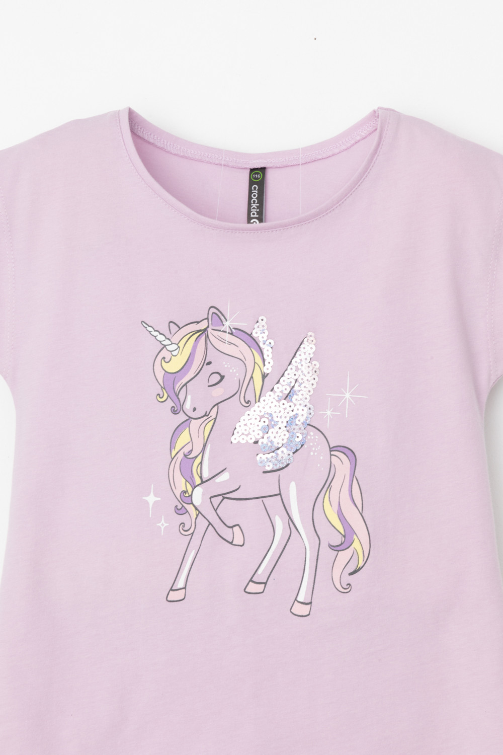 Туника для девочки из высококачественного трикотажного полотна. Оригинальные принт и набивка выполнены из стойких текстильных гипоаллергенных красителей. Для удобства одевания на плече в размерах 92 и 98 есть застежка на кнопки.