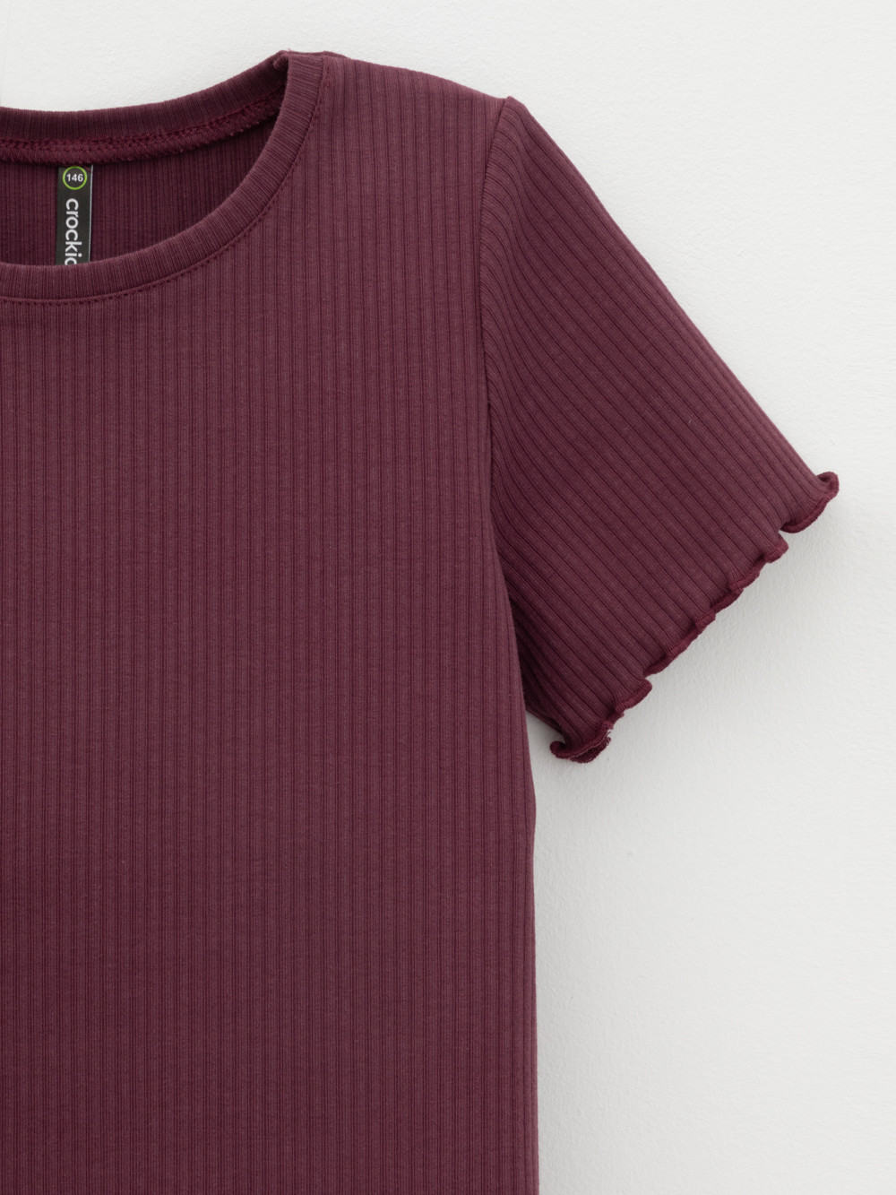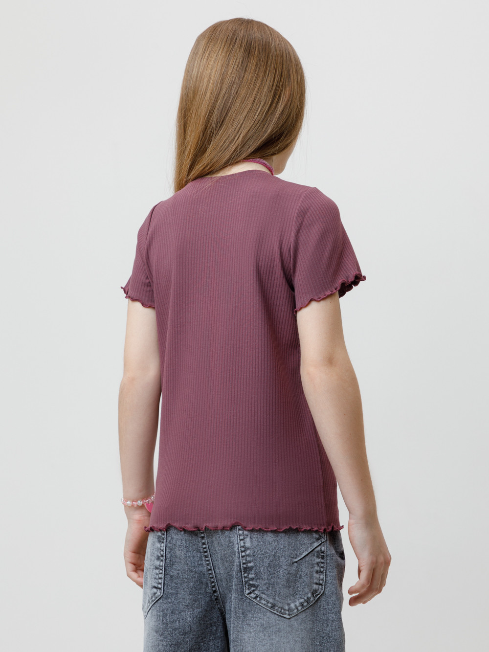 Футболка для девочки из эластичного трикотажа в рубчик. Изделие сохраняет цвет и форму после многократных стирок. Все трикотажные полотна производятся в соответствии с нормами швейцарского сертификата ЭкоТекс.