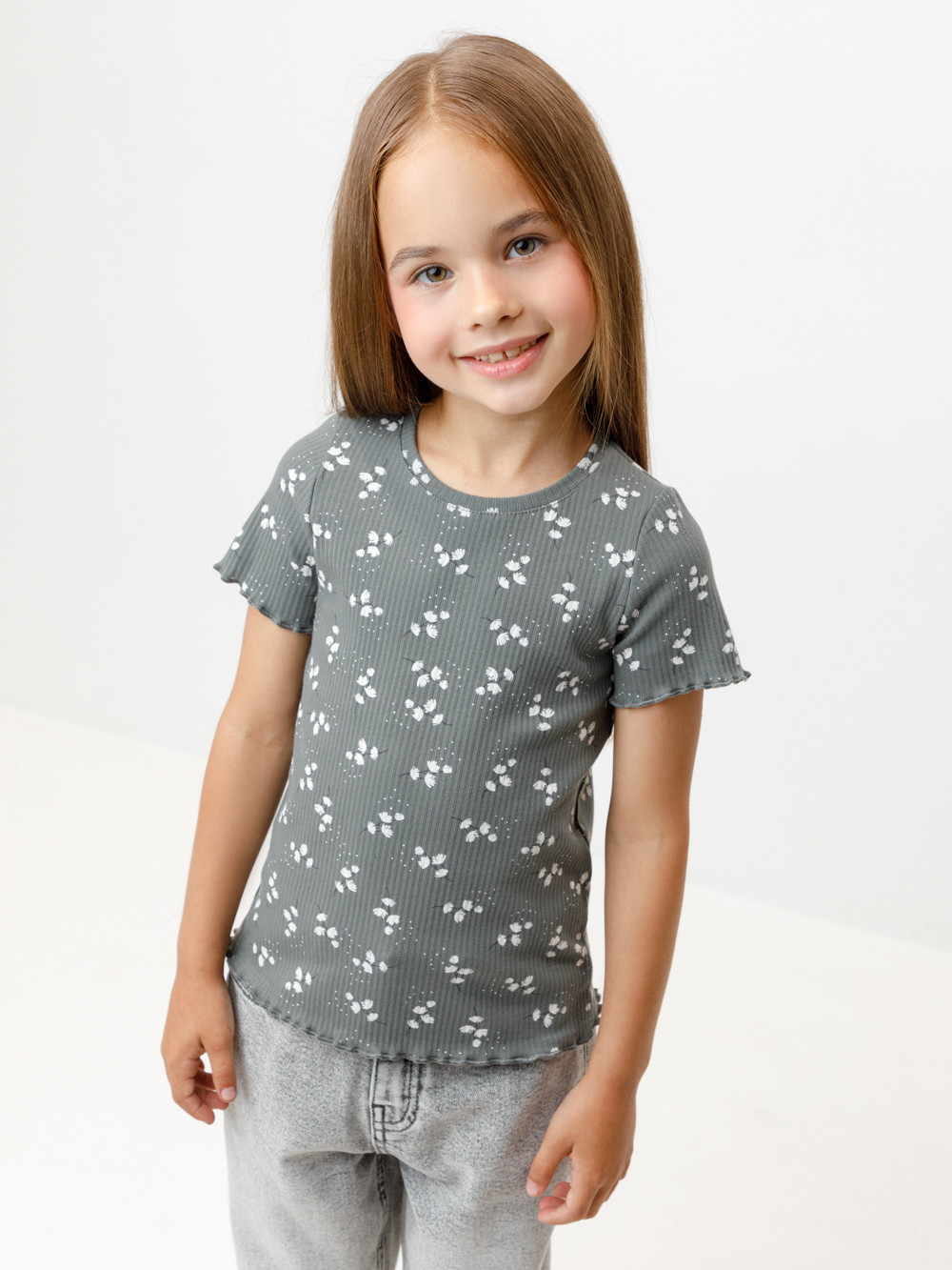 Футболка для девочки из эластичного трикотажа в рубчик. Оригинальный рисунок выполнен из стойких текстильных гипоаллергенных красителей. Изделие сохраняет цвет и форму после многократных стирок. Все трикотажные полотна производятся в соответствии с нормами швейцарского сертификата ЭкоТекс.