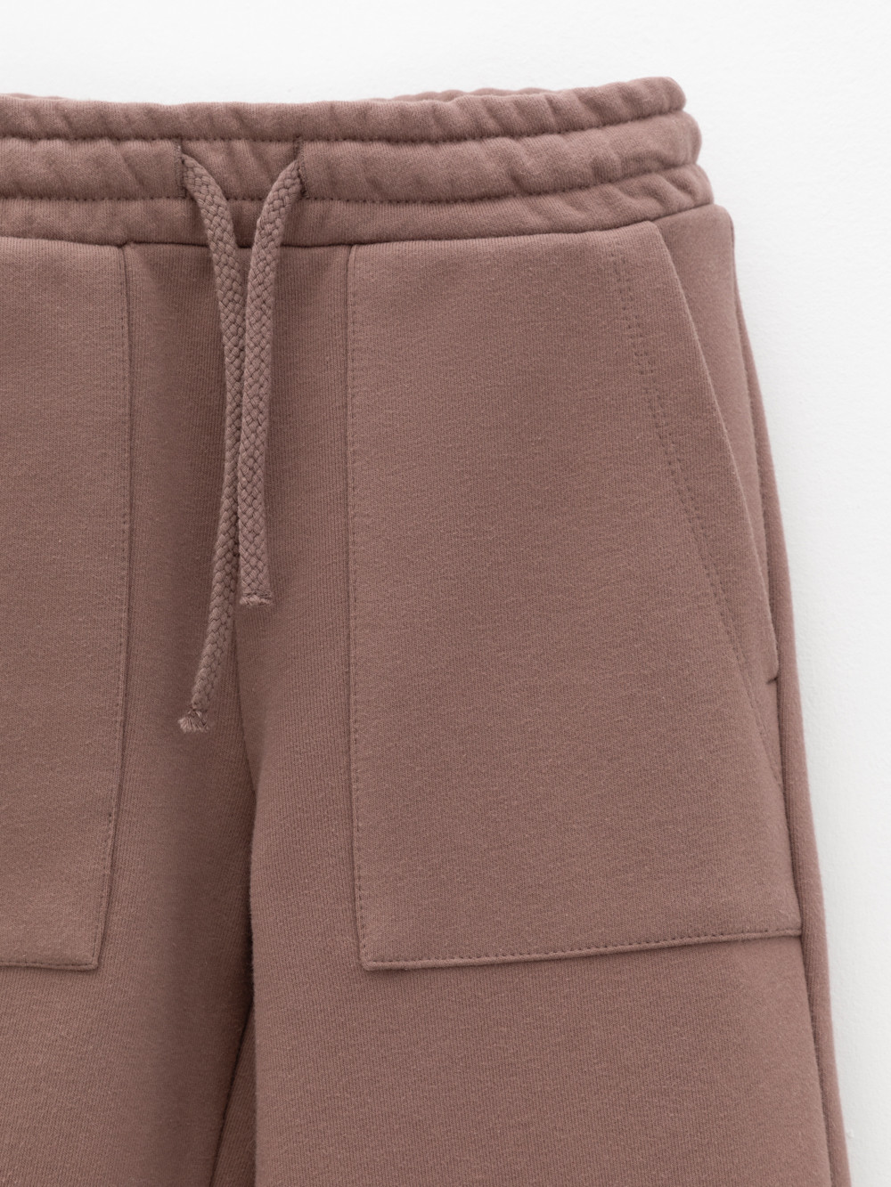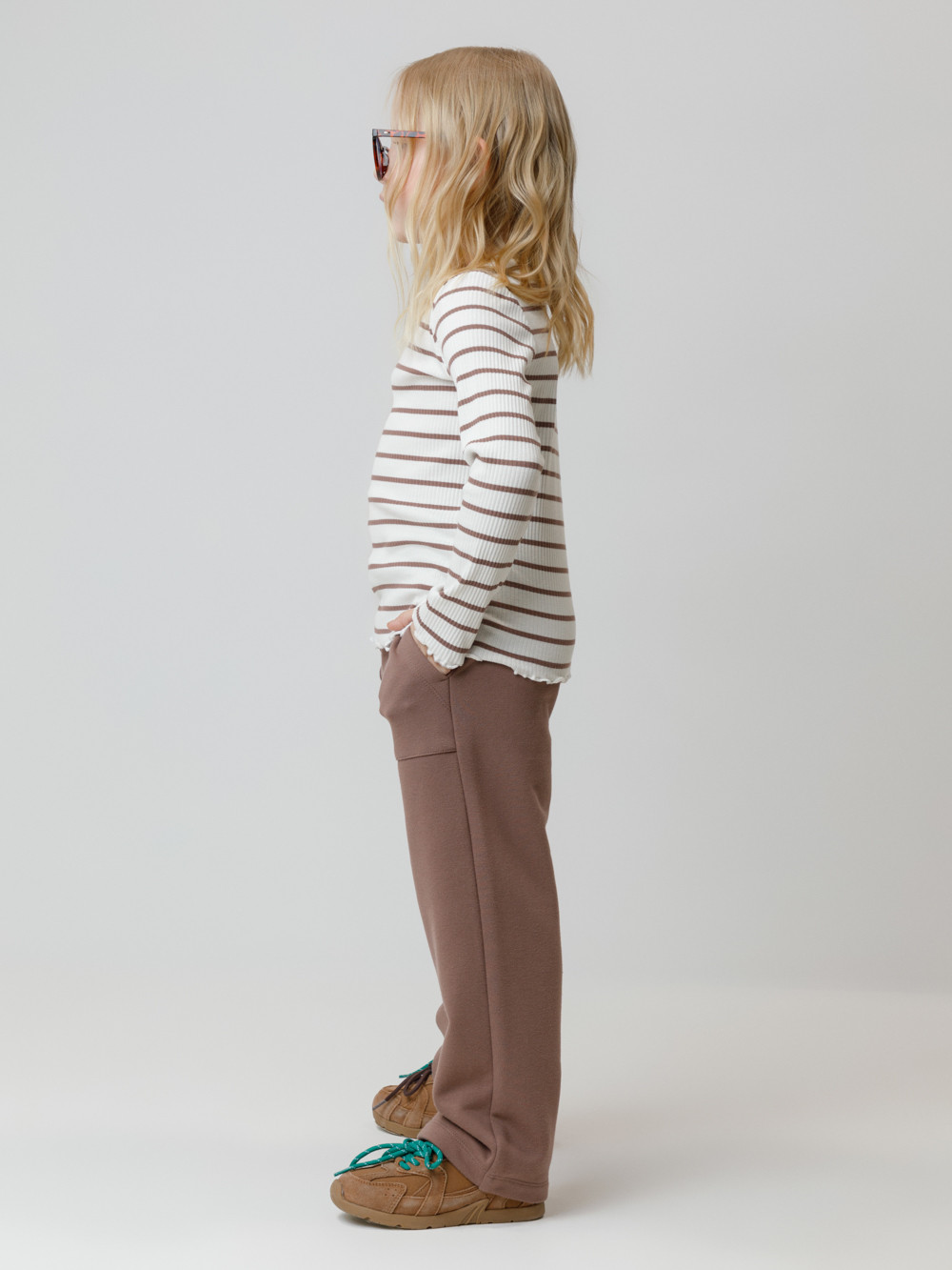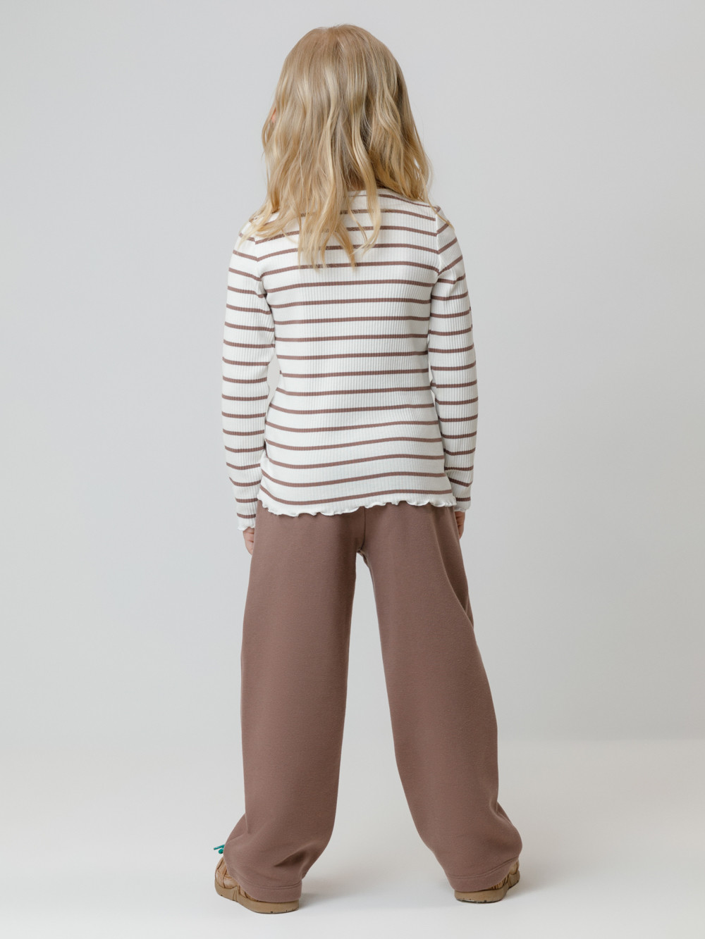 Прямые брюки для девочки из мягкого петельчатого трикотажа. Эластичный пояс на резинке регулируется по ширине с помощью шнурка. По бокам два удобных накладных кармана. Изделие сохраняет цвет и форму после многократных стирок. Все трикотажные полотна производятся в соответствии с нормами швейцарского сертификата ЭкоТекс.