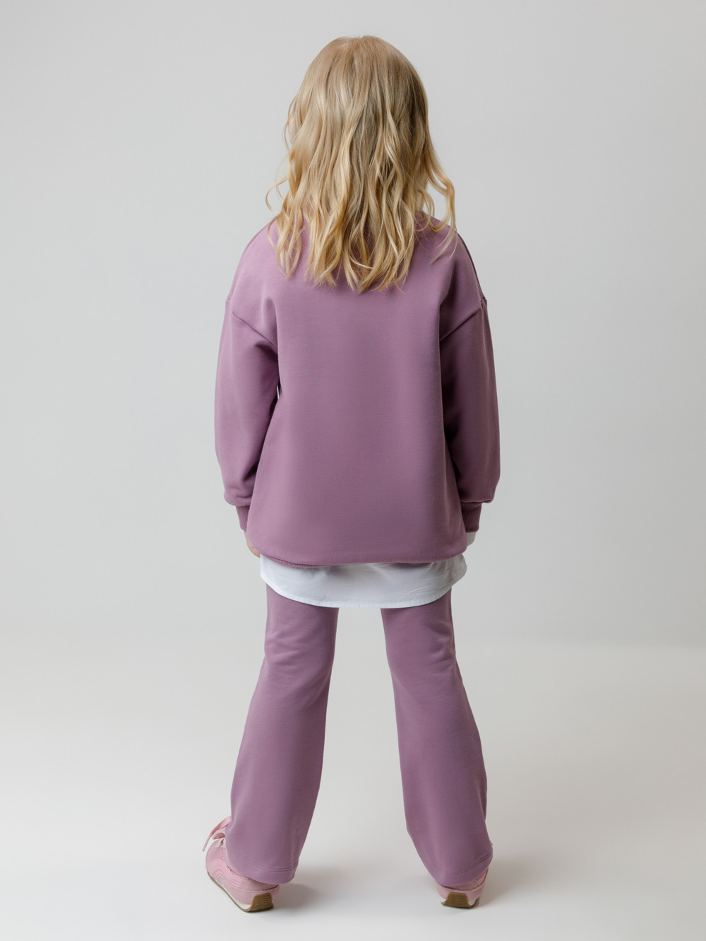 Брюки из мягкого эластичного футера для девочки. Модель с поясом на резинке. Изделие сохраняет цвет и форму после многократных стирок. Все трикотажные полотна производятся в соответствии с нормами швейцарского сертификата ЭкоТекс.