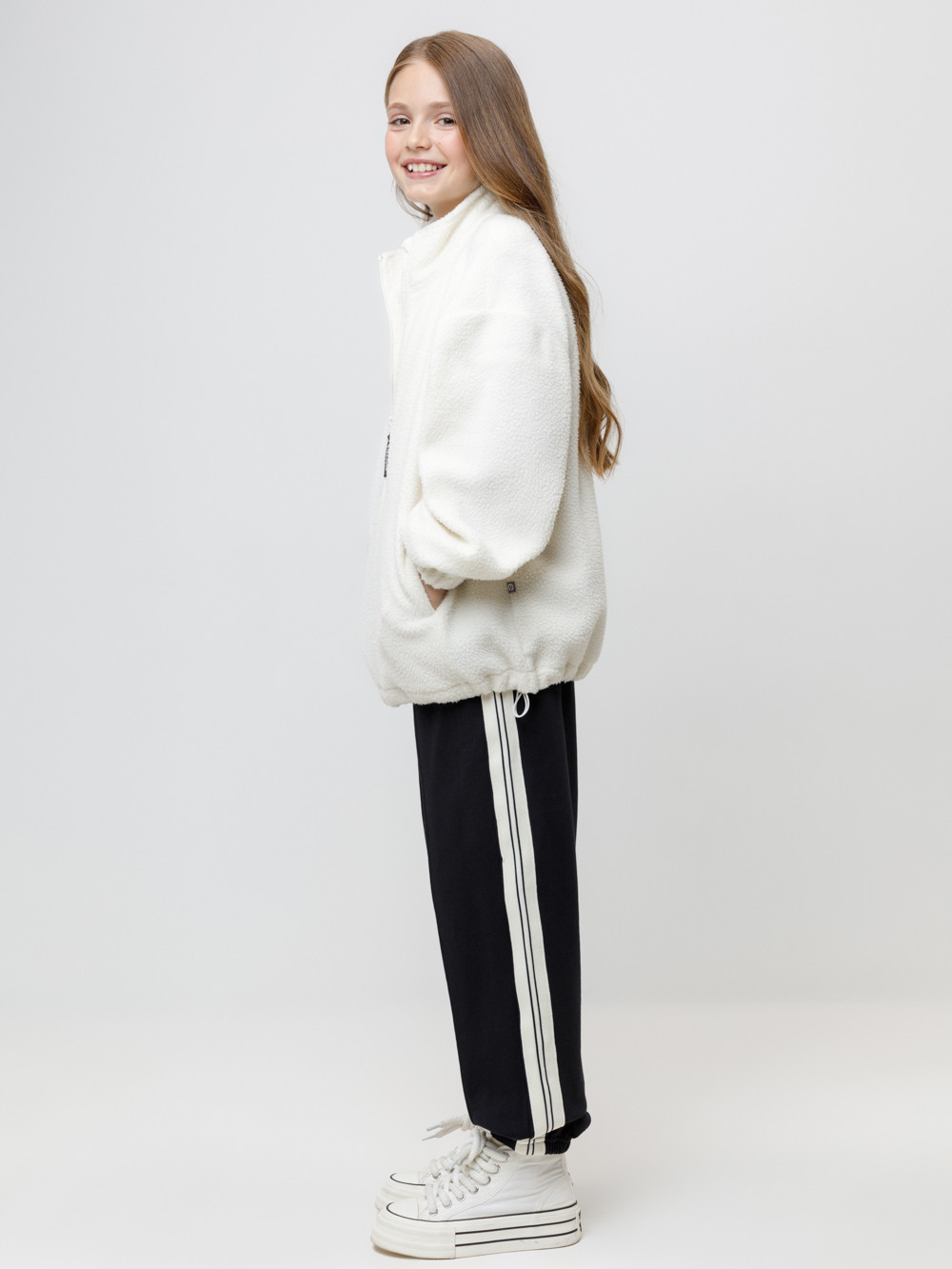Флисовая куртка детская. У изделия высокий воротник и застёжка на молнию с мягкой защитой шеи и подбородка. По бокам два кармана. Рукава собраны на резинку. Низ изделия регулируется по ширине с помощью эластичной утяжки со стопперами. Куртка сохраняет цвет и форму после многократных стирок.