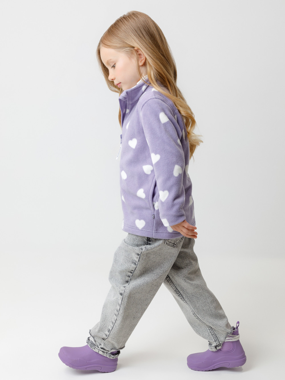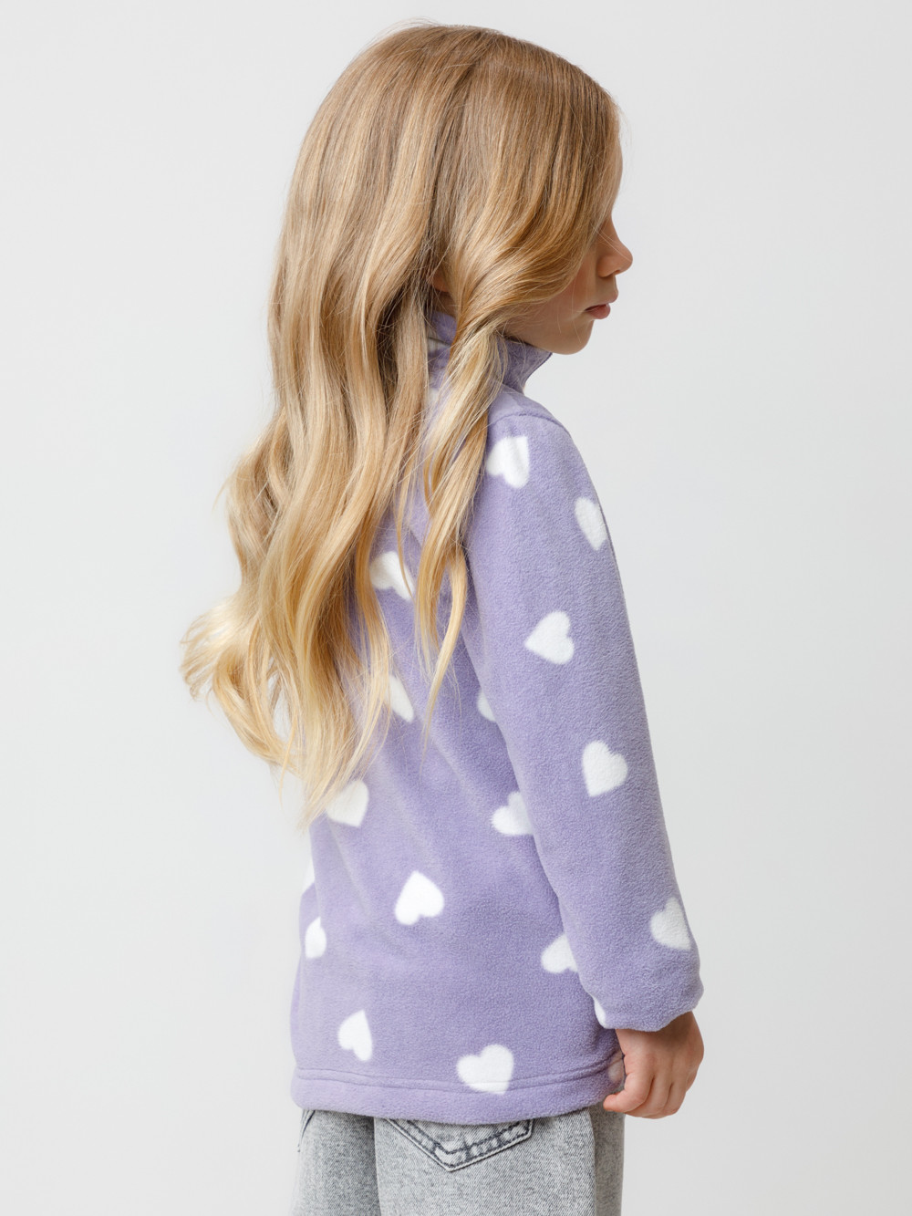 Флисовая куртка для девочки. У изделия высокий воротник и застёжка на молнию с мягкой защитой шеи и подбородка. По бокам два кармана. Оригинальная набивка выполнена из стойких гипоаллергенных текстильных красителей. Куртка сохраняет цвет и форму после многократных стирок.