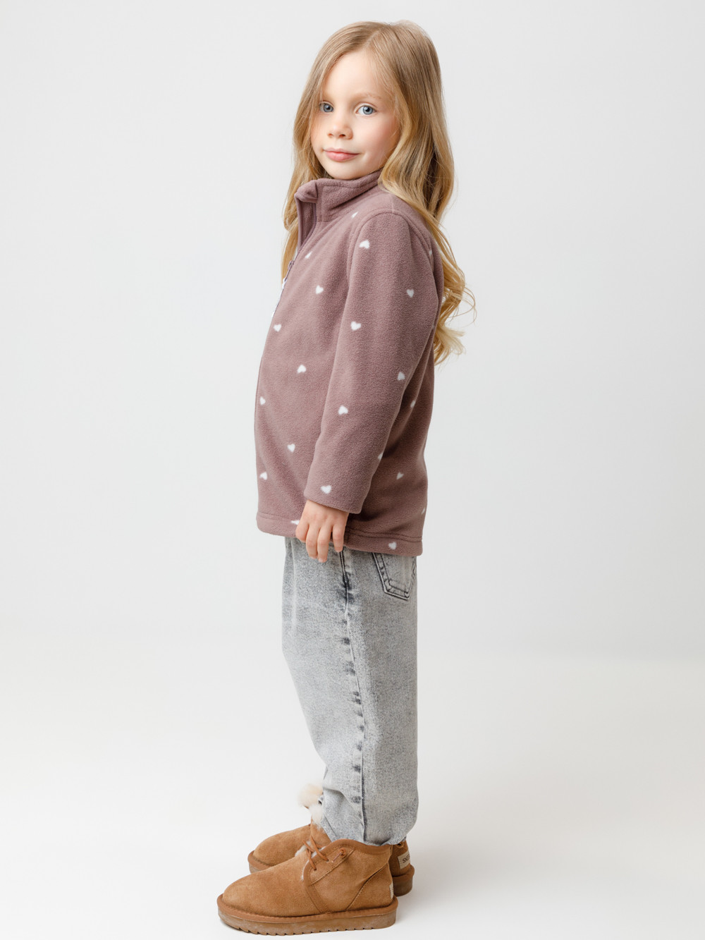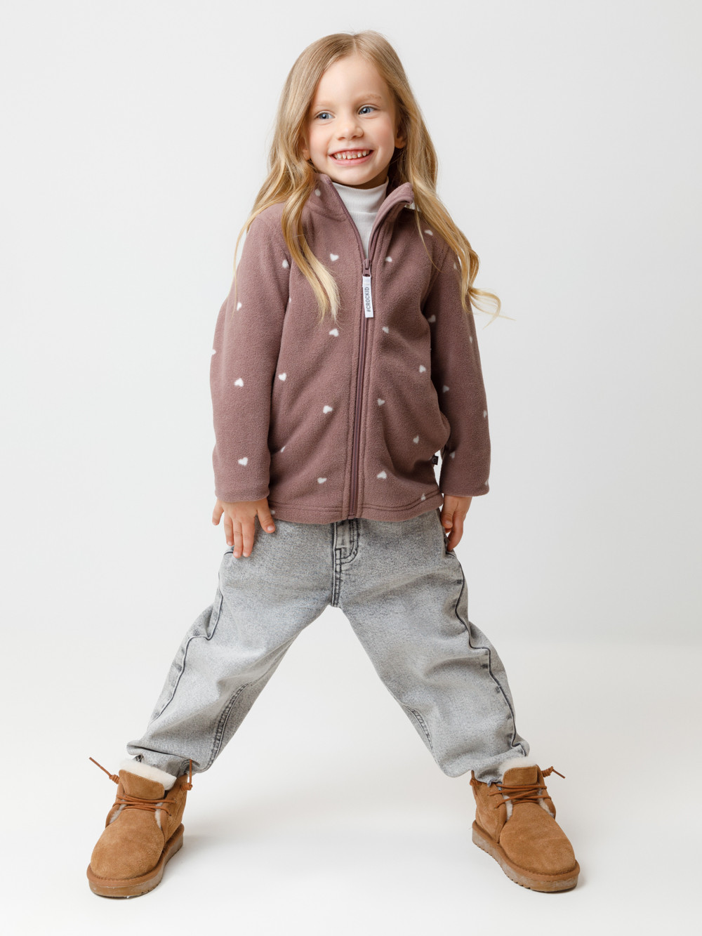 Флисовая куртка для девочки. У изделия высокий воротник и застёжка на молнию с мягкой защитой шеи и подбородка. По бокам два кармана. Оригинальная набивка выполнена из стойких гипоаллергенных текстильных красителей. Куртка сохраняет цвет и форму после многократных стирок.