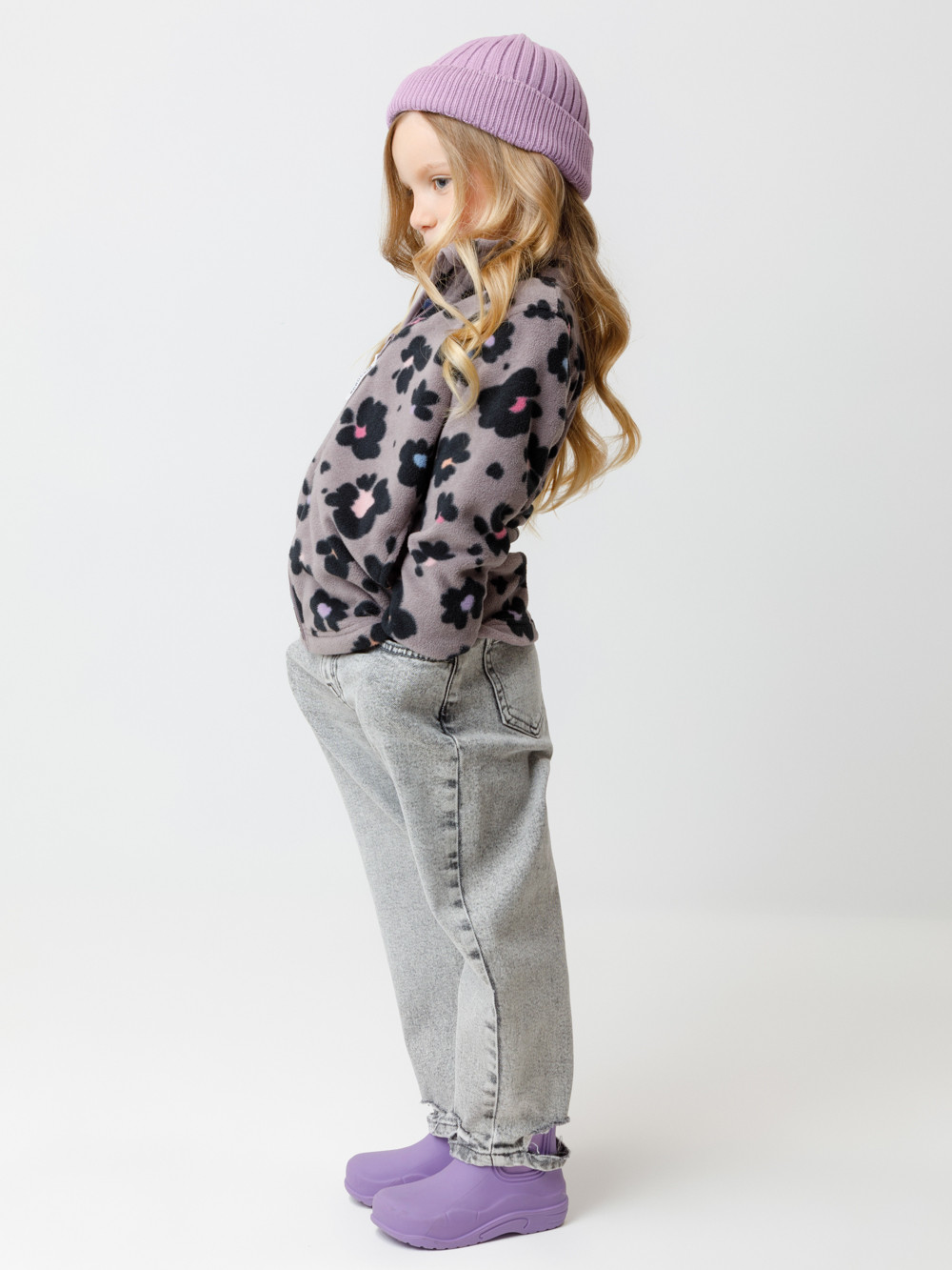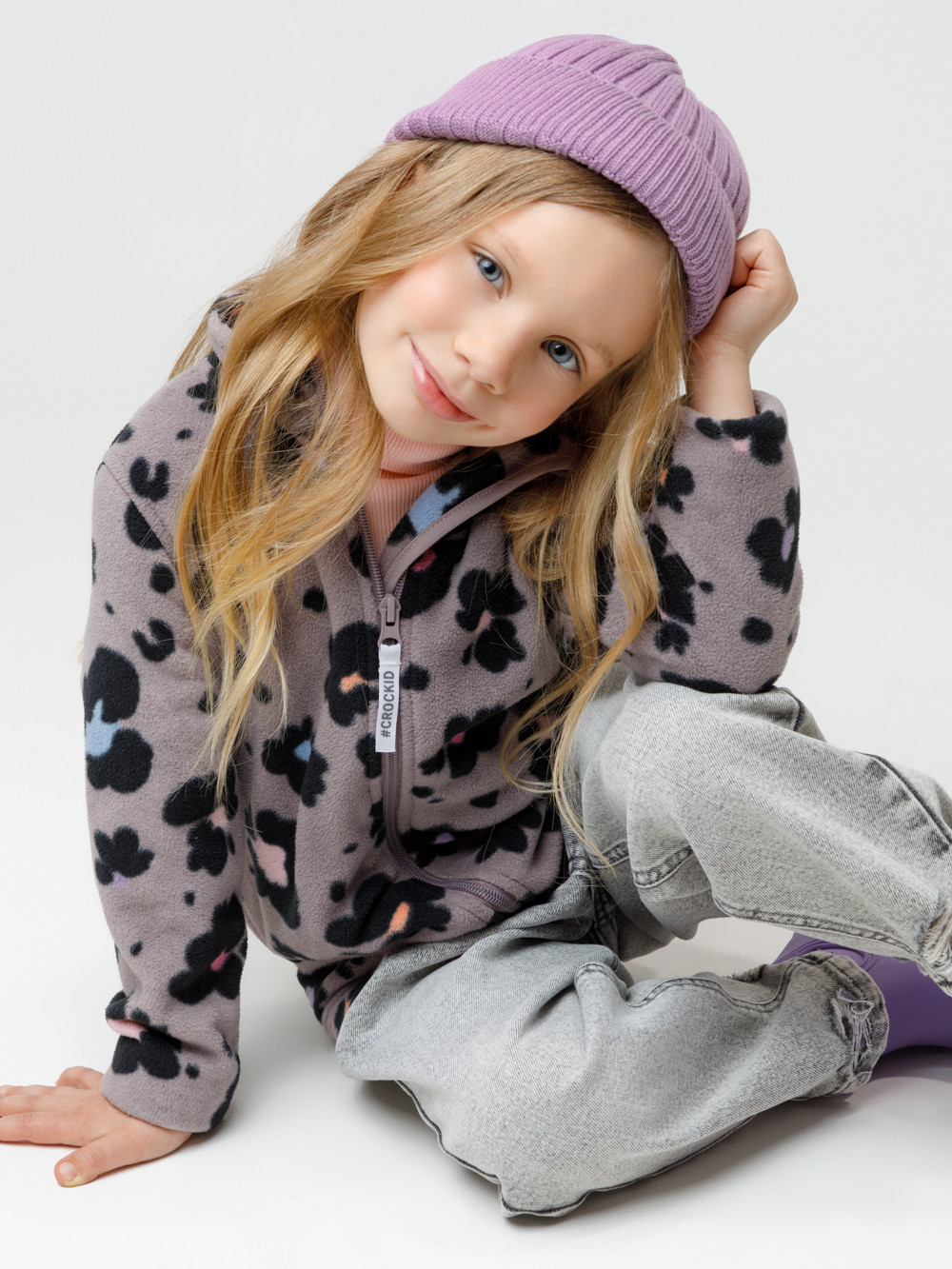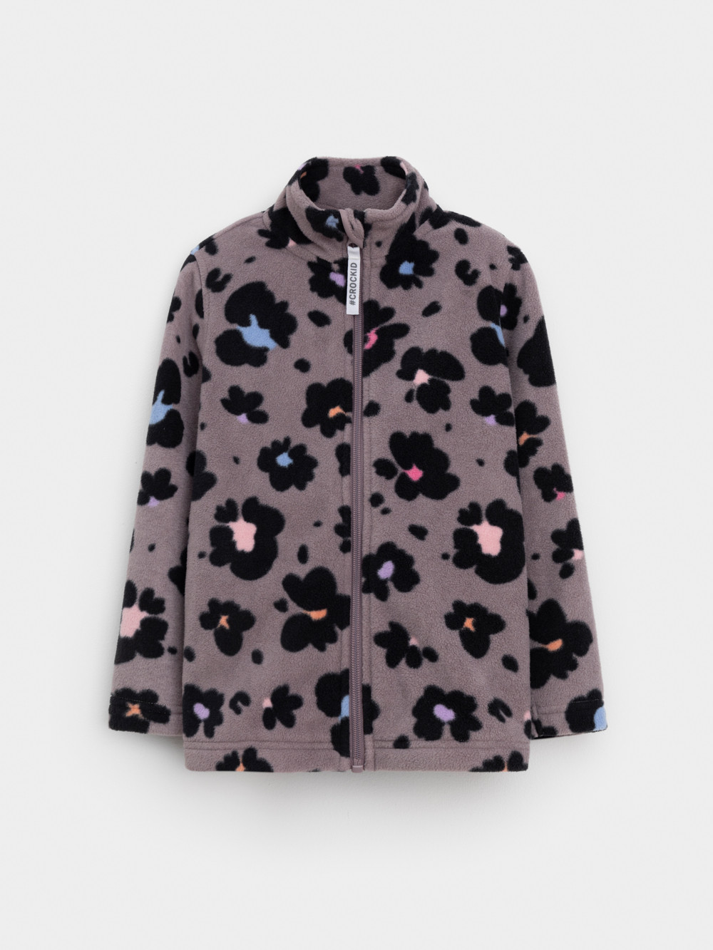 Флисовая куртка для девочки. У изделия высокий воротник и застёжка на молнию с мягкой защитой шеи и подбородка. По бокам два кармана. Оригинальная набивка выполнена из стойких гипоаллергенных текстильных красителей. Куртка сохраняет цвет и форму после многократных стирок.