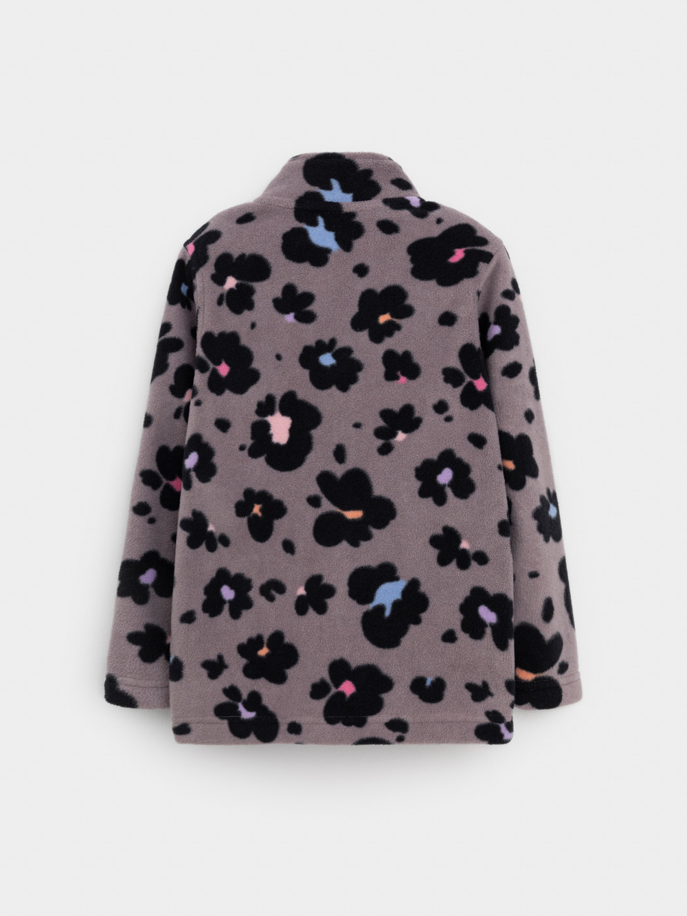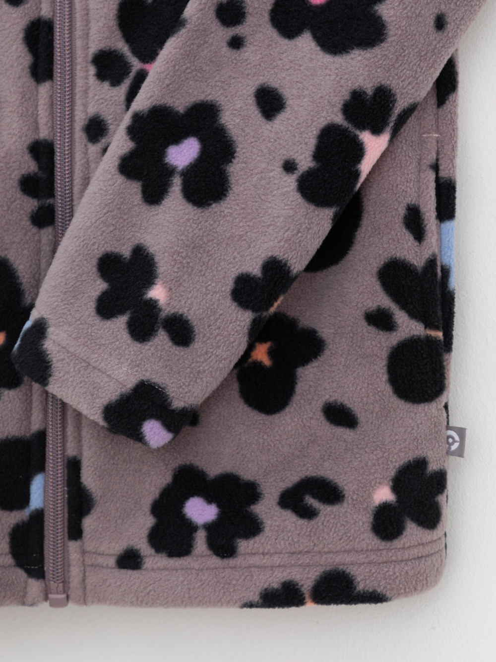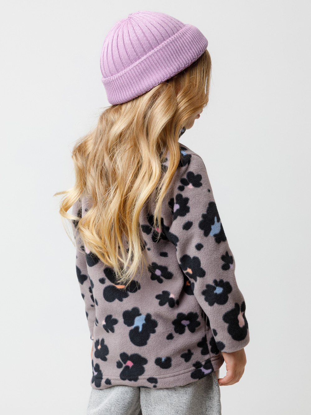 Флисовая куртка для девочки. У изделия высокий воротник и застёжка на молнию с мягкой защитой шеи и подбородка. По бокам два кармана. Оригинальная набивка выполнена из стойких гипоаллергенных текстильных красителей. Куртка сохраняет цвет и форму после многократных стирок.