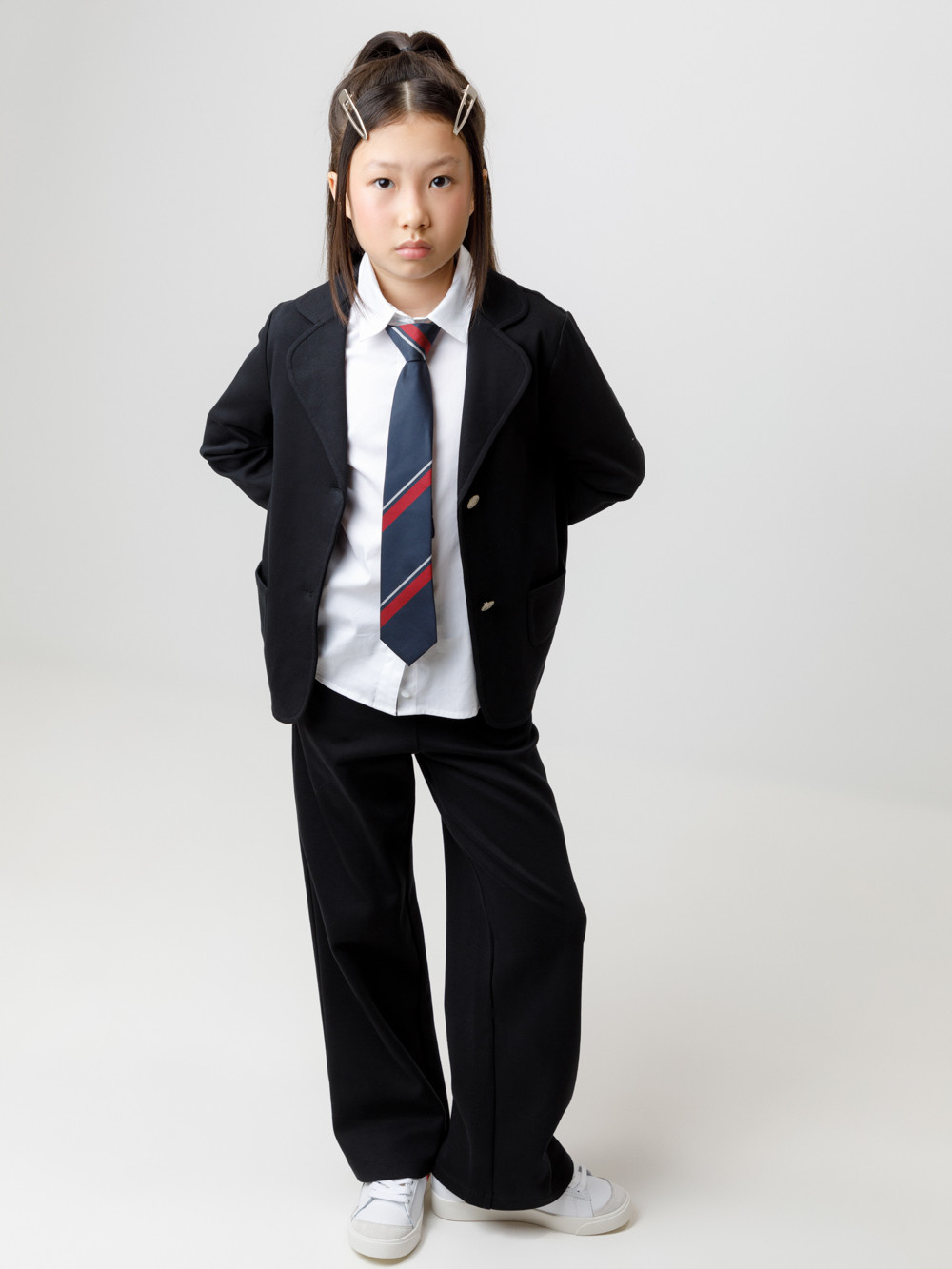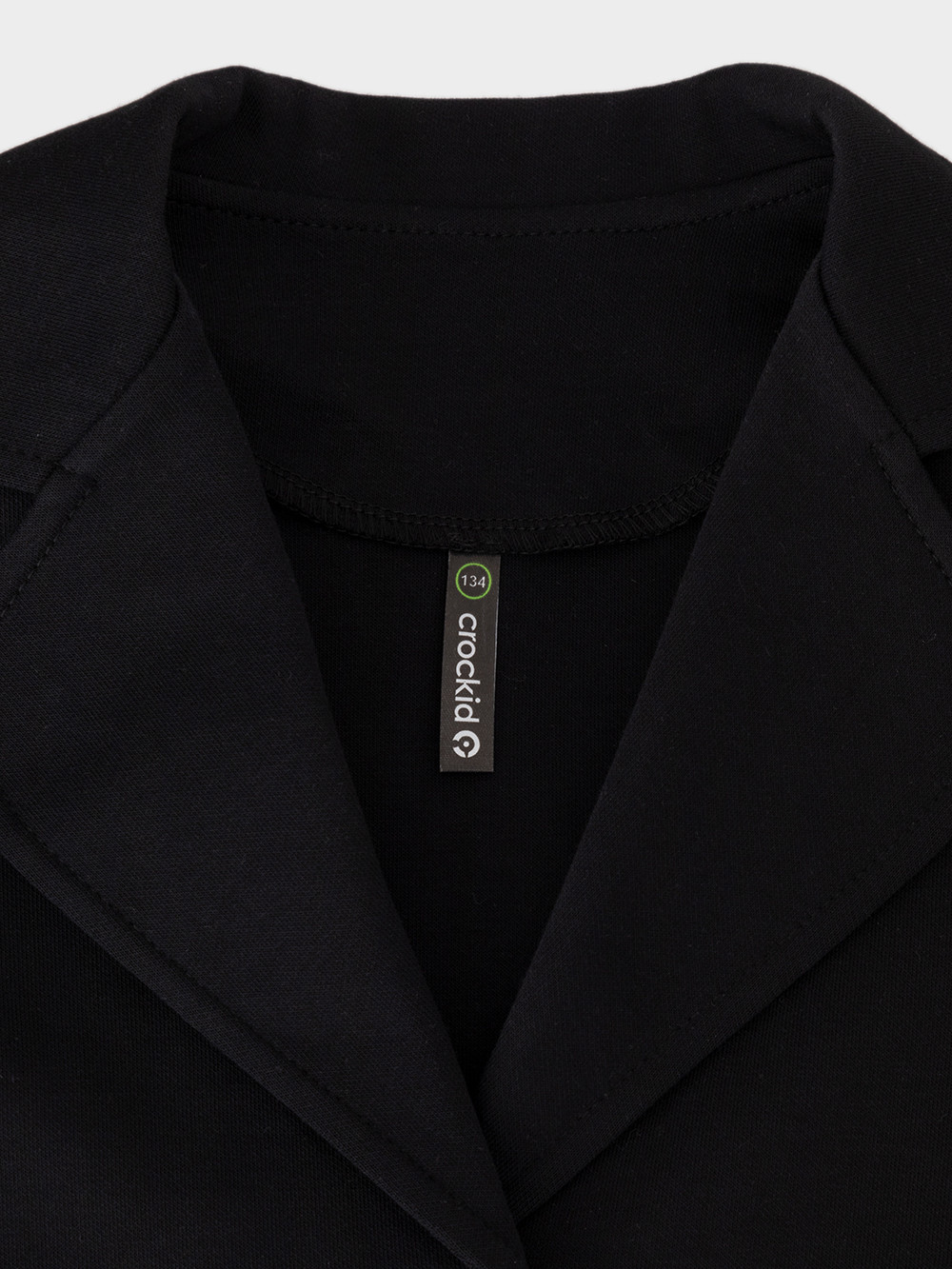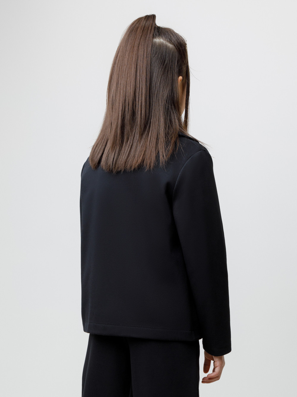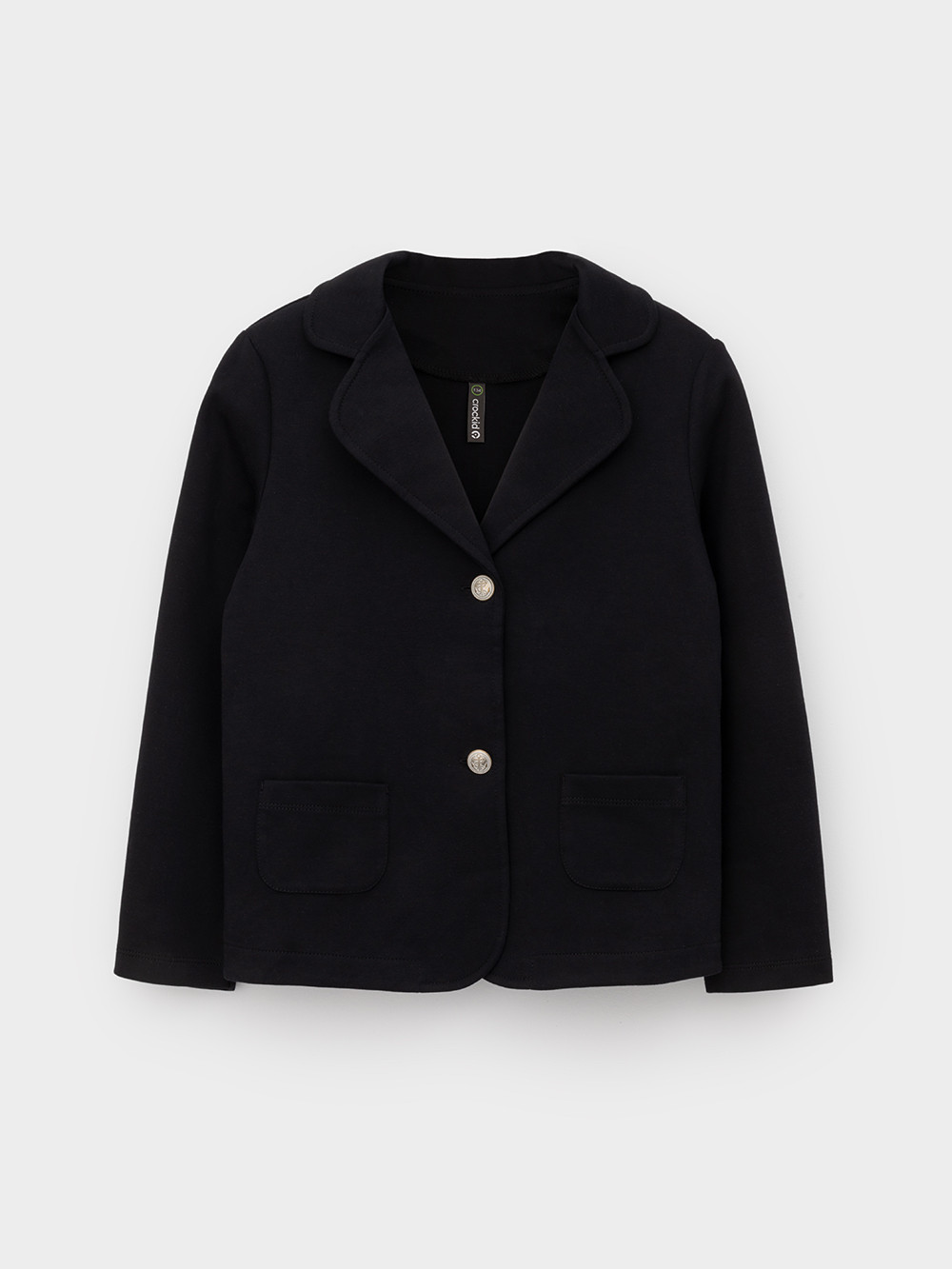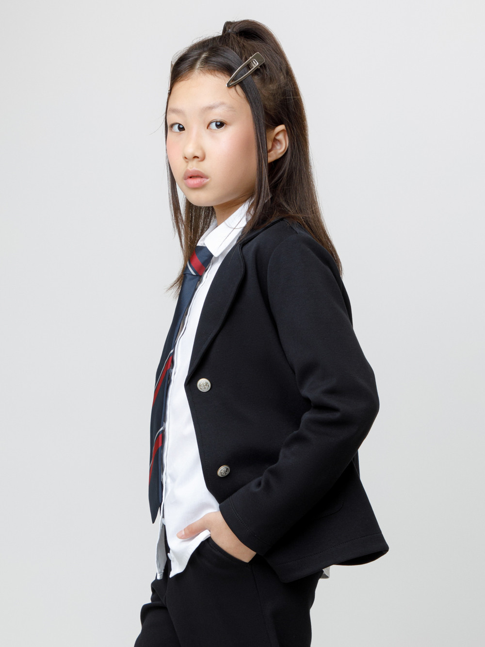 Пиджак школьный для девочки с воротником из высококачественного трикотажа интерлок DOUBLE FACE. Застёгивается на пуговицы. По бокам два накладных кармана.
