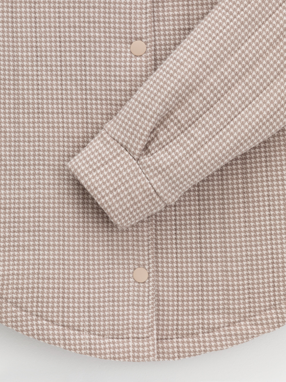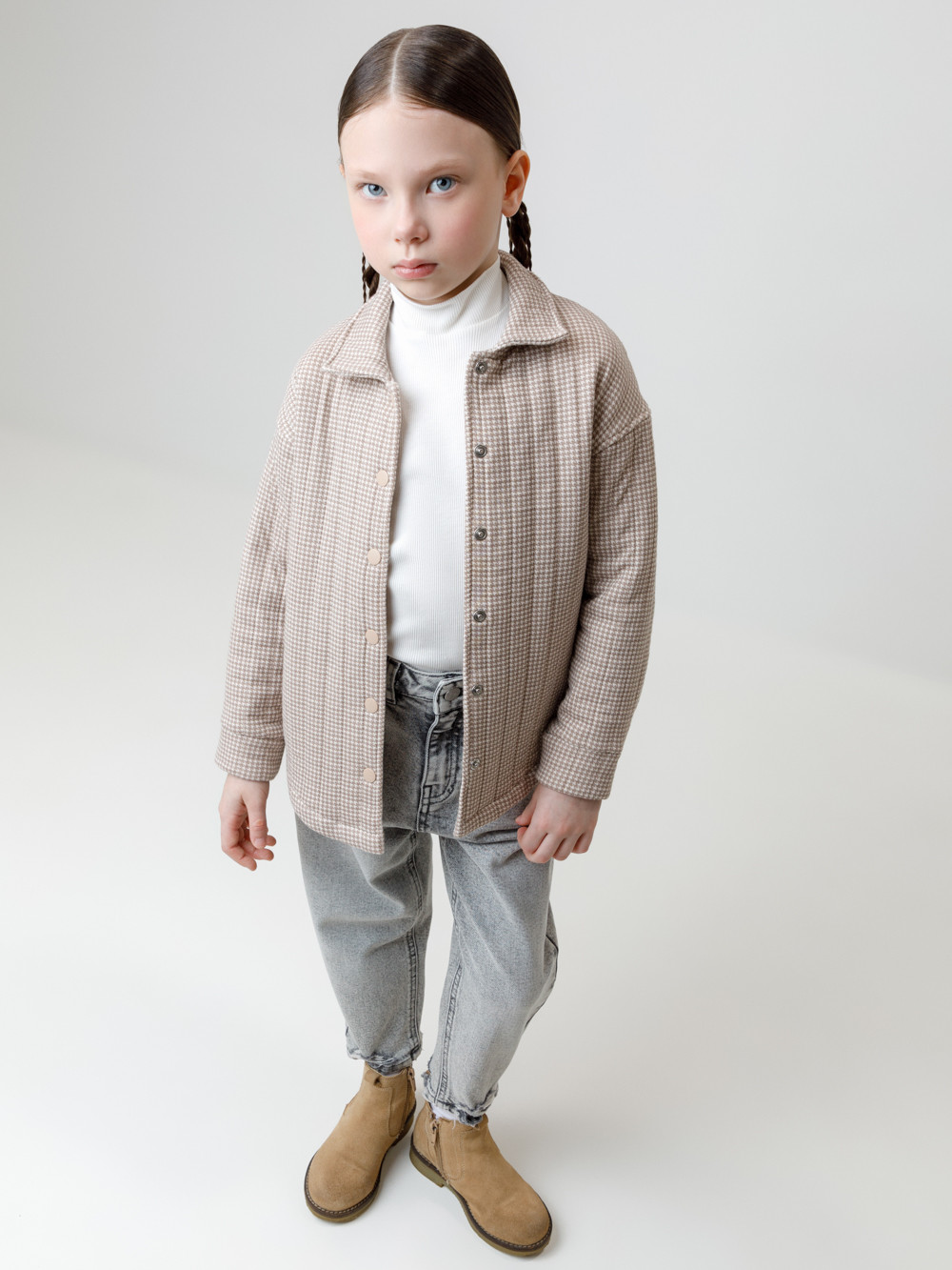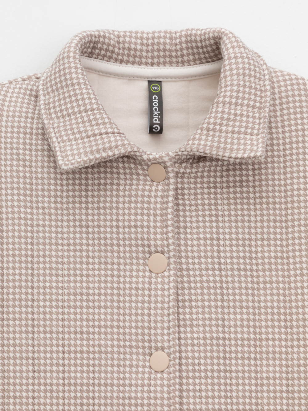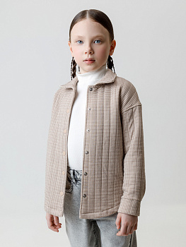 Тёплая рубашка свободного кроя для девочки из мягкого капитония. Капитоний – это стёганое трикотажное полотно с утеплителем из полиэстеровой нити. Модель с закругленным низом и спущенным плечом. Застёгивается на пуговицы. Рисунок в гусиную лапку выполнен из стойких текстильных гипоаллергенных красителей. Все трикотажные полотна производятся в соответствии с нормами швейцарского сертификата ЭкоТекс.