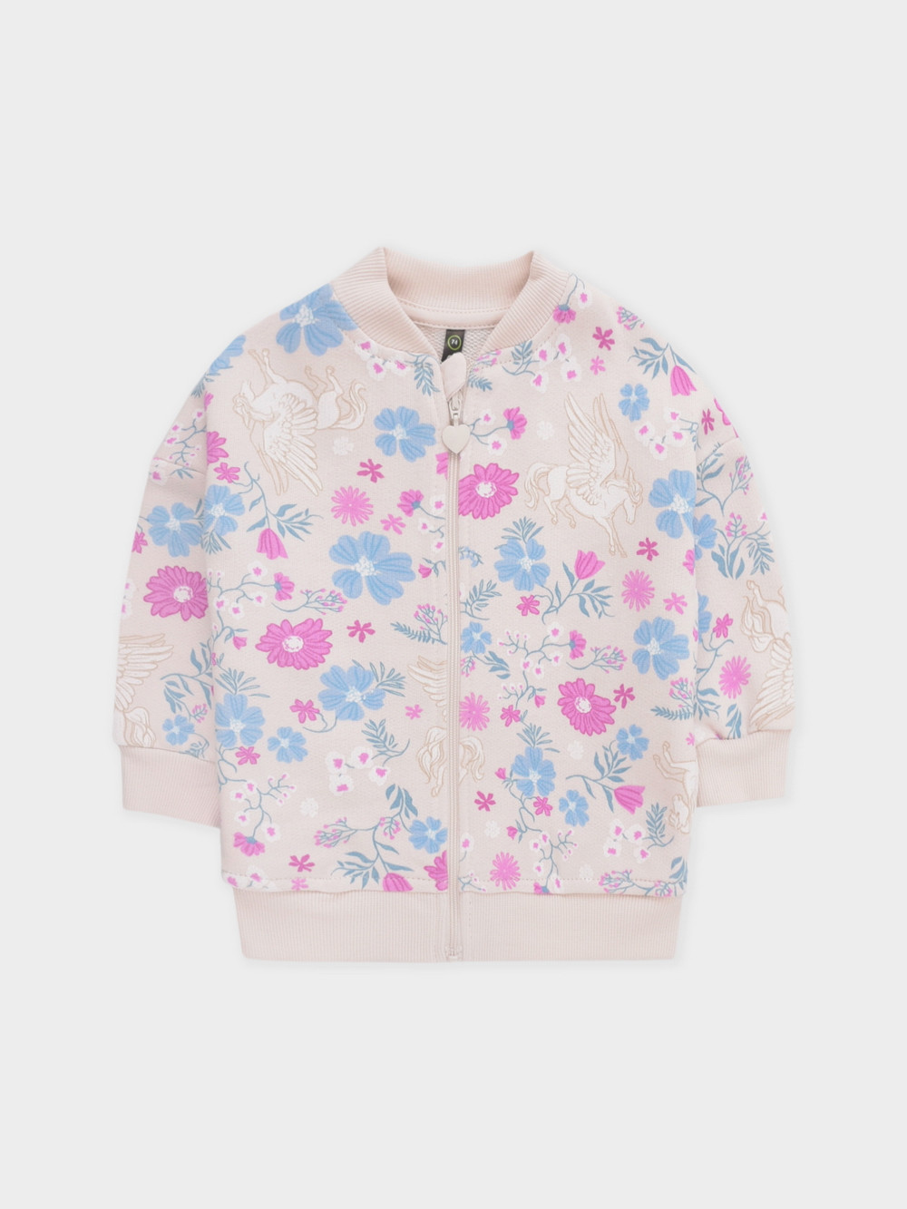 Трикотажная куртка-бомбер для девочки. Изготовлена из мягкого футера петли трёхнитки. Застёгивается на молнию с мягкой защитой шеи и подбородка. По бокам два кармана. Воротничок, манжеты и пояс выполнены из эластичного трикотажа в рубчик. Изделие сохраняет цвет и форму после многократных стирок. Все трикотажные полотна производятся в соответствии с нормами швейцарского сертификата ЭкоТекс.