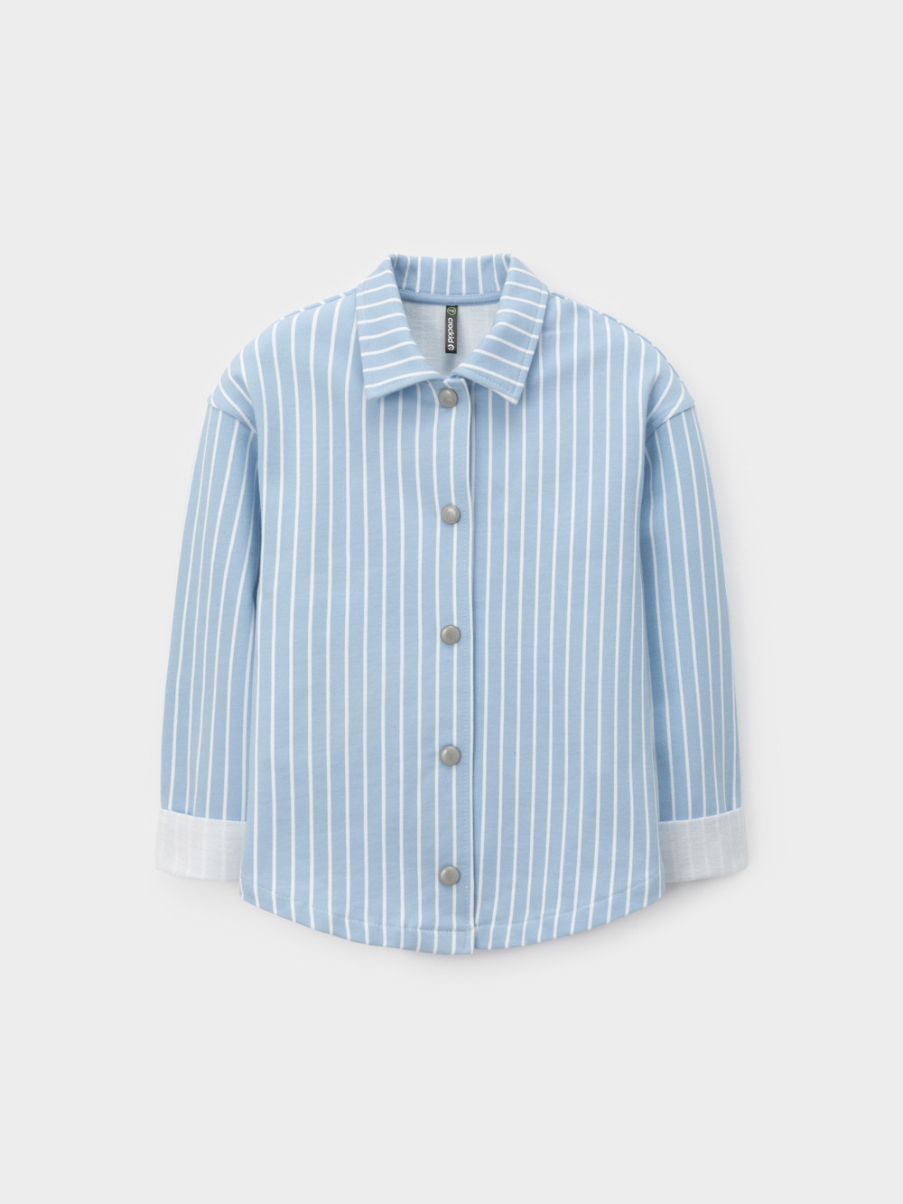 Свободная трикотажная рубашка для девочки из мягкого петельчатого футера. Застёгивается на кнопки. Модель с закруглённым низом и спущенным плечом. Рисунок в полоску выполнен из стойких текстильных гипоаллергенных красителей. Изделие сохраняет цвет и форму после многократных стирок. Все трикотажные полотна производятся в соответствии с нормами швейцарского сертификата ЭкоТекс.