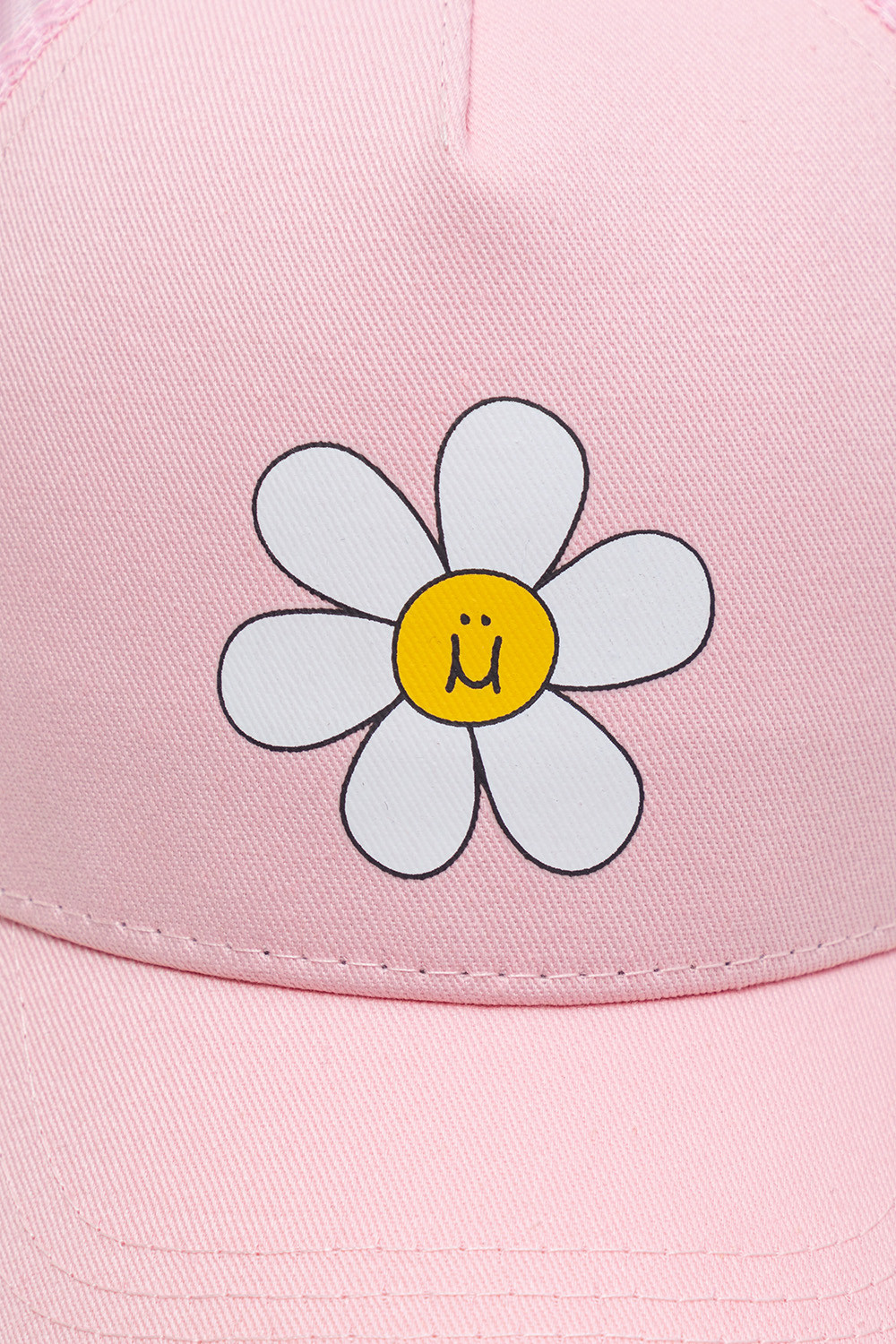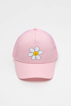 Кепка для девочки из текстиля и сетки. Спереди оригинальный принт. Регулируется по ширине и фиксируется на затылке с помощью пластиковой застежки.