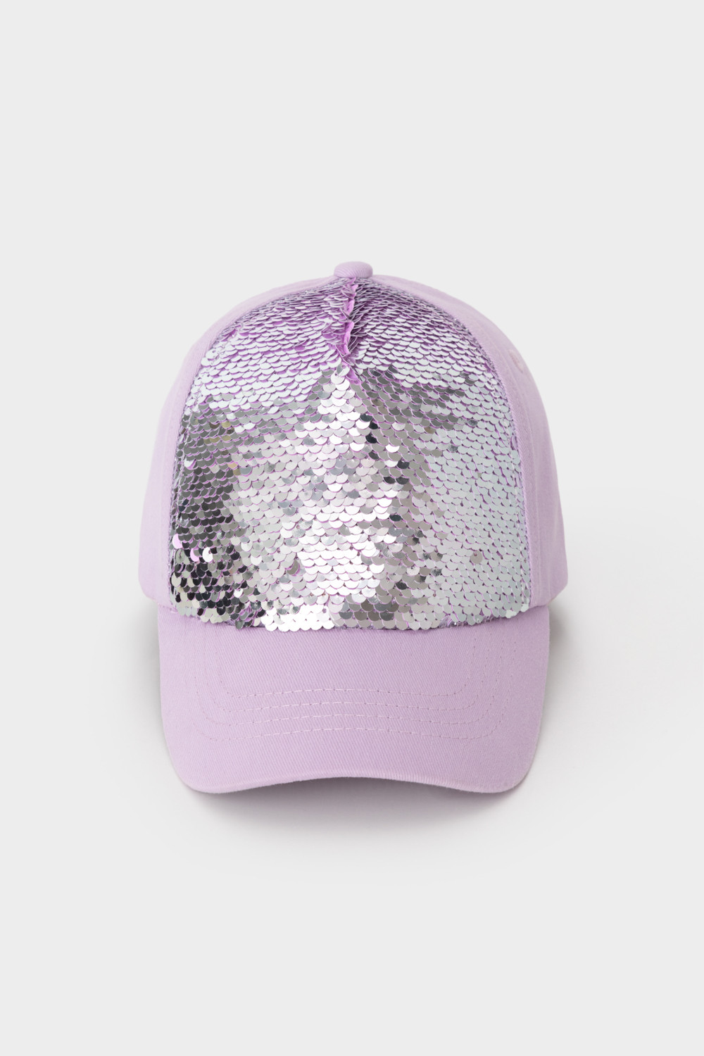 Кепка для девочки из натурального хлопка. Спереди украшена пайетками. Регулируется по ширине головы и фиксируется на затылке с помощью металлического зажима.