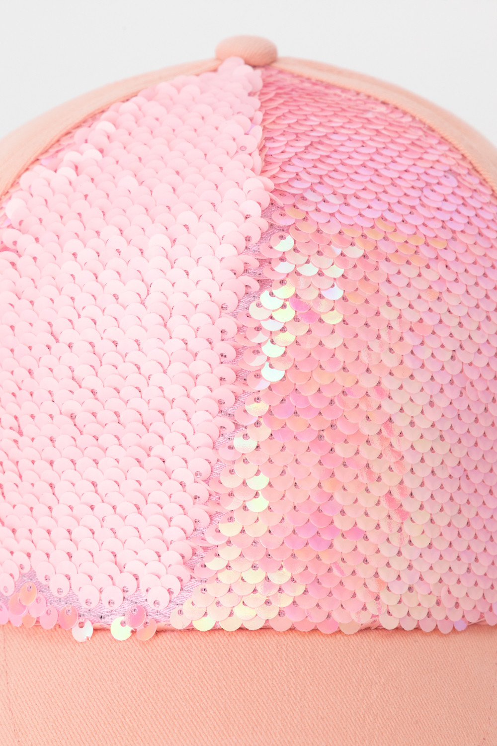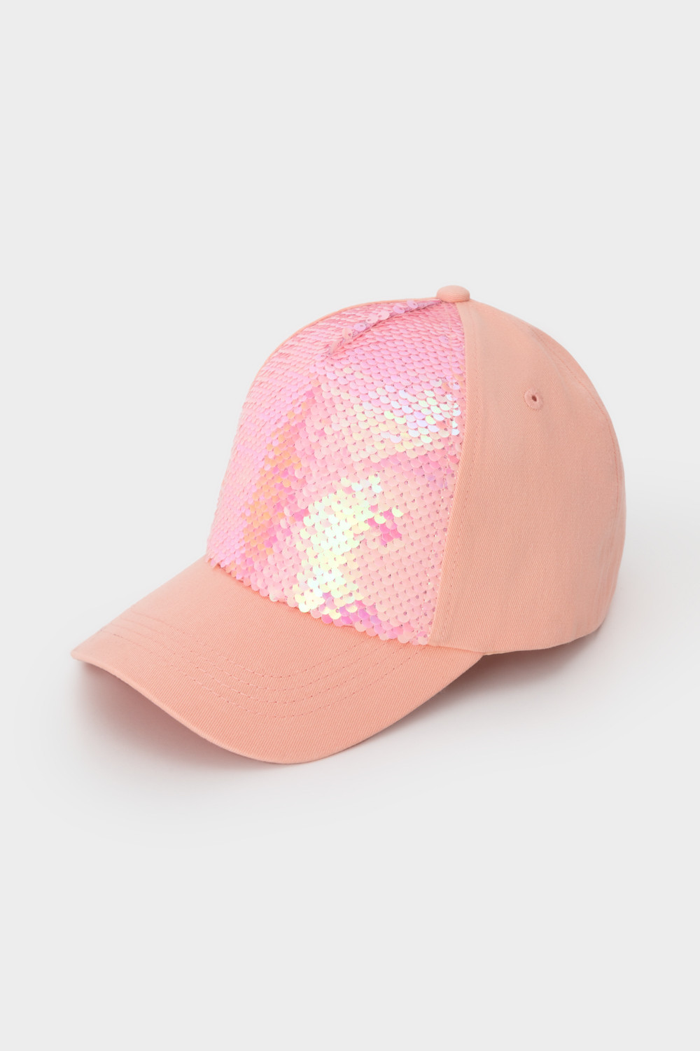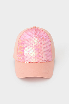 Кепка для девочки из натурального хлопка. Спереди украшена пайетками. Регулируется по ширине головы и фиксируется на затылке с помощью металлического зажима.