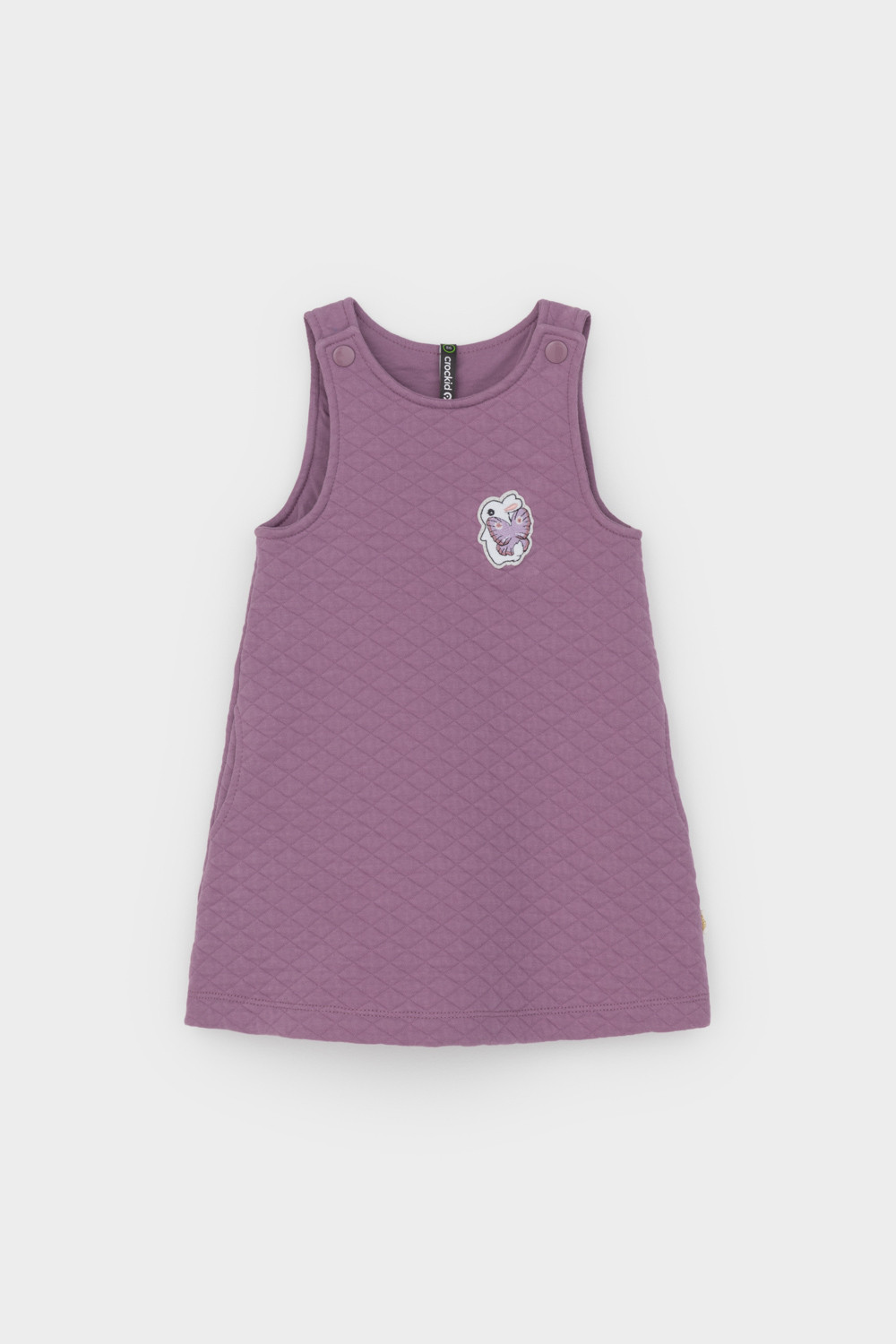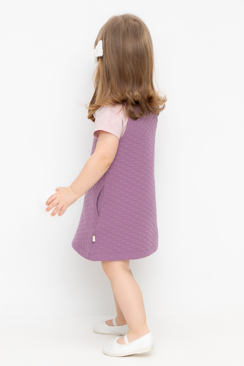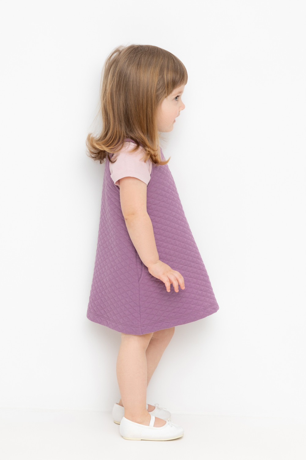 Сарафан из стеганого трикотажного полотна с двумя карманами. Застегивает сверху на кнопки.