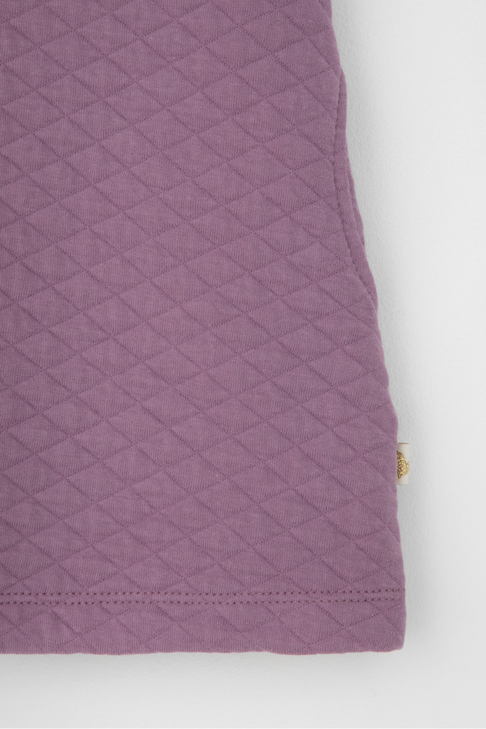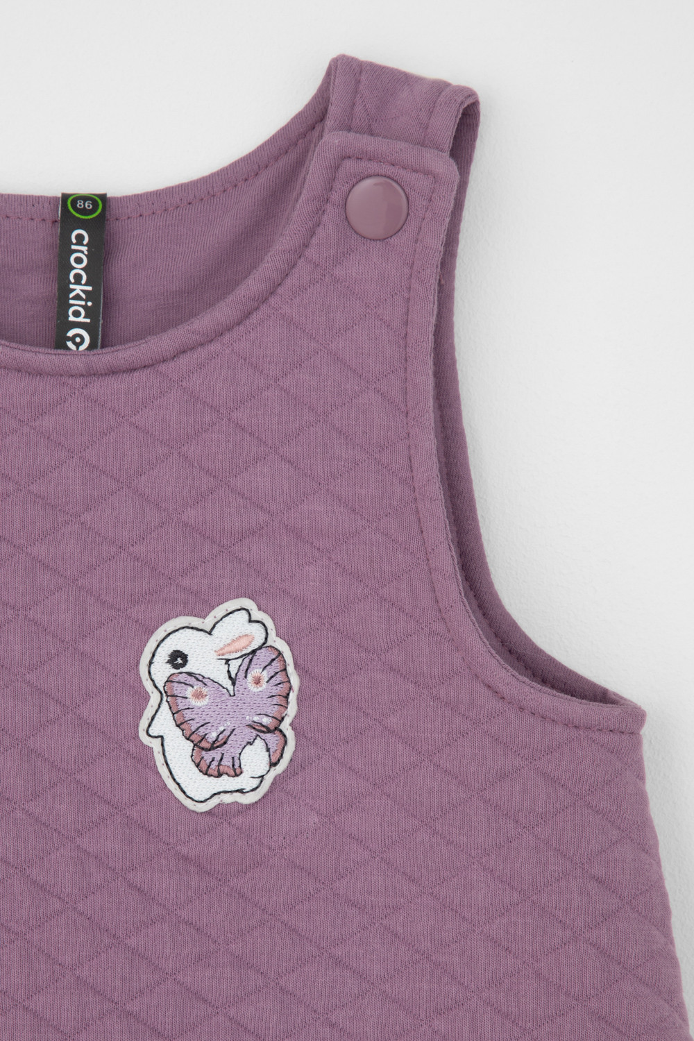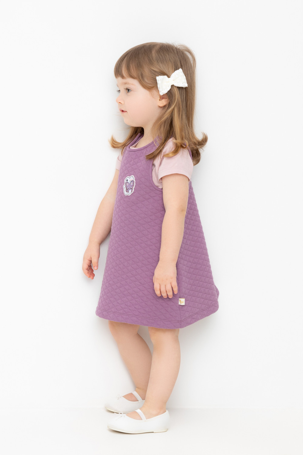 Сарафан из стеганого трикотажного полотна с двумя карманами. Застегивает сверху на кнопки.