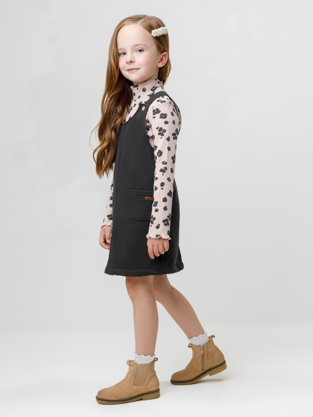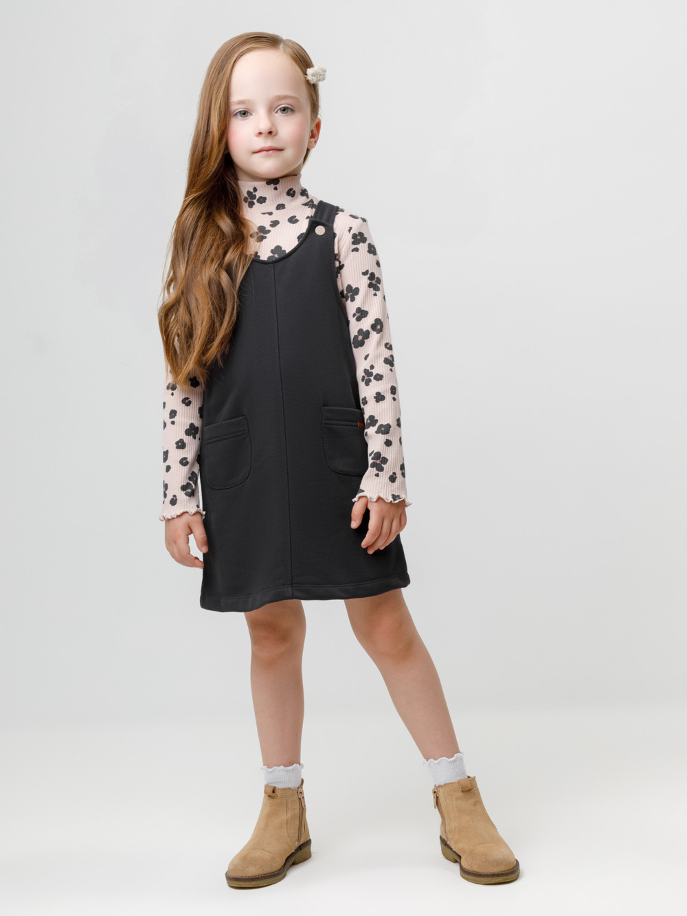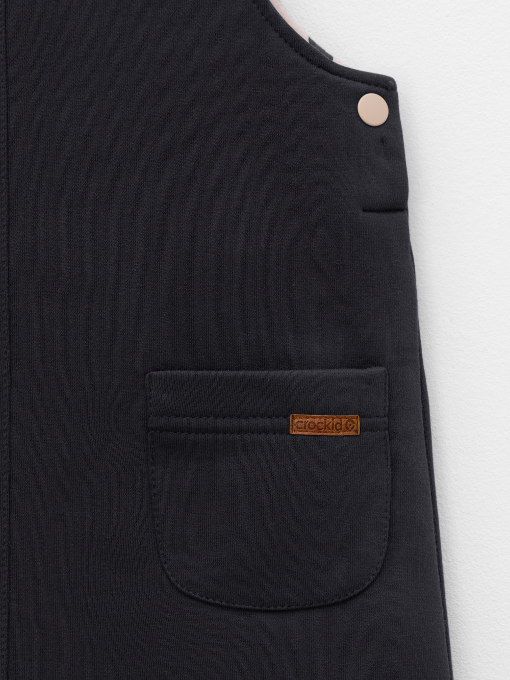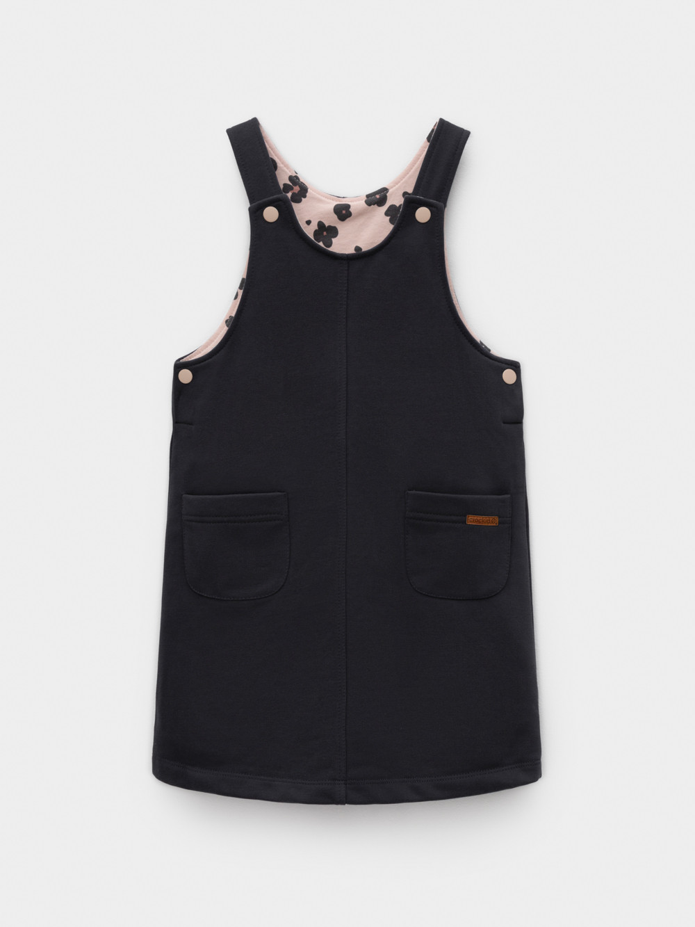 Сарафан на лямках из мягкого петельчатого футера. В составе 80% натурального хлопка и 20% полиэстера, при этом полиэстер ввязан внутрь по особой технологии и не соприкасается с кожей. Модель с двумя накладными карманами и застёжкой на кнопки. Все трикотажные полотна производятся в соответствии с нормами швейцарского сертификата ЭкоТекс.