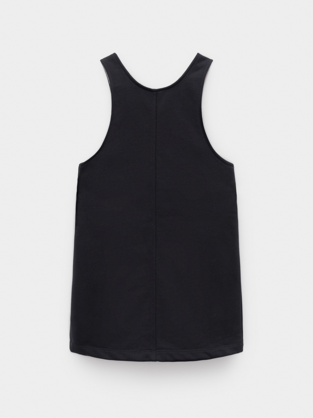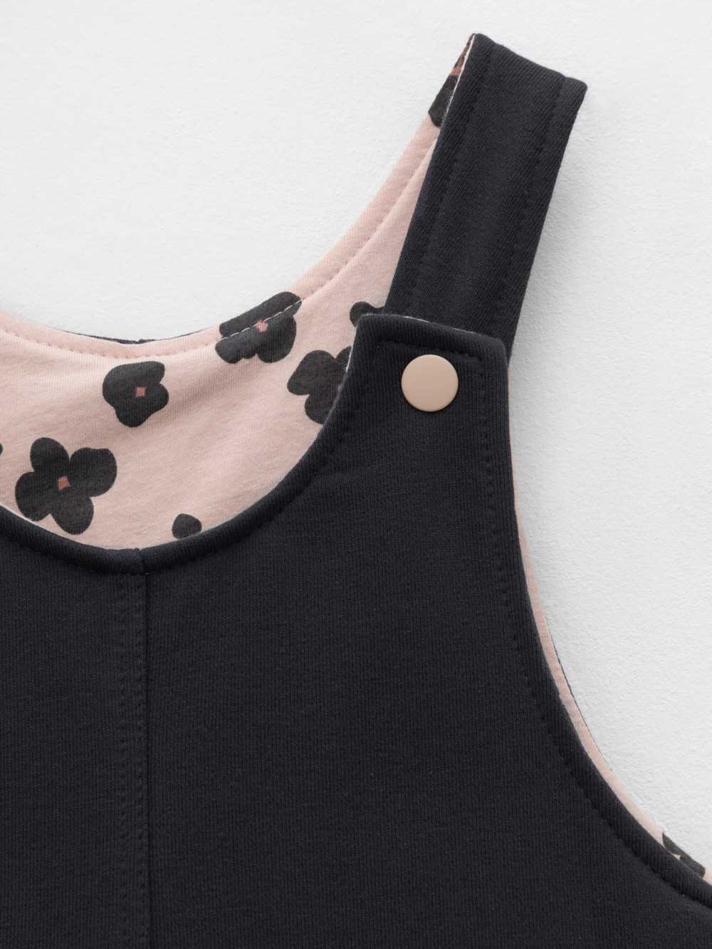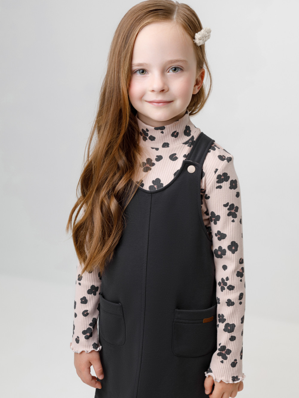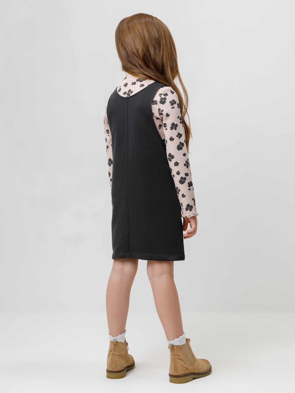 Сарафан на лямках из мягкого петельчатого футера. В составе 80% натурального хлопка и 20% полиэстера, при этом полиэстер ввязан внутрь по особой технологии и не соприкасается с кожей. Модель с двумя накладными карманами и застёжкой на кнопки. Все трикотажные полотна производятся в соответствии с нормами швейцарского сертификата ЭкоТекс.