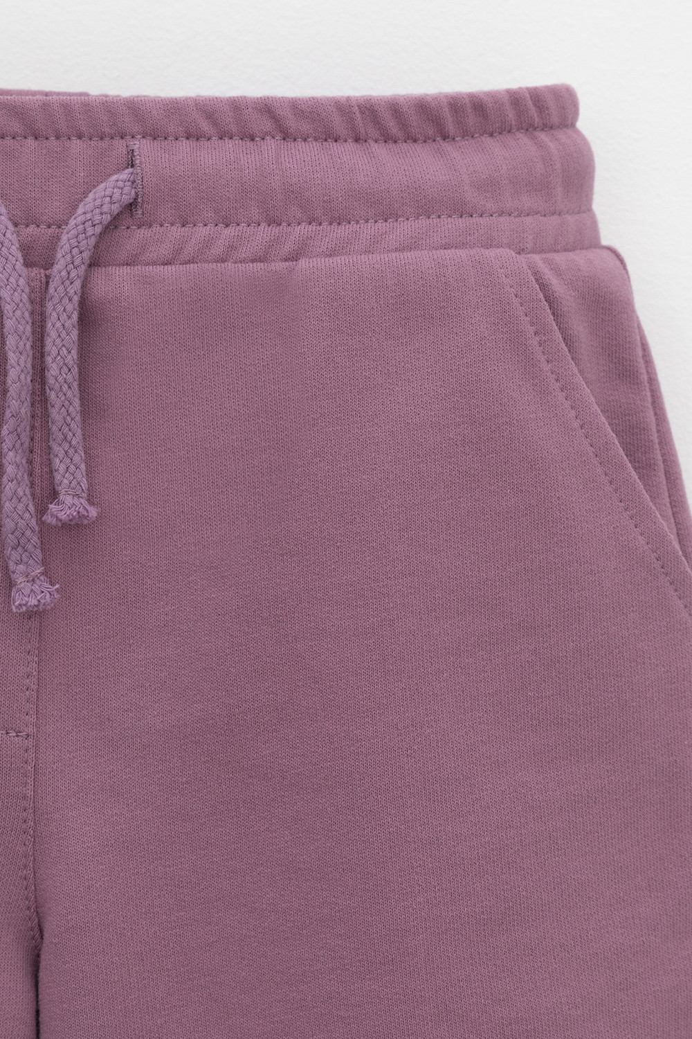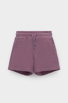 Трикотажные шорты для девочки из петельчатого футера. Эластичный пояс на резинке регулируется по ширине с помощью шнурка, по бокам два удобных кармана.