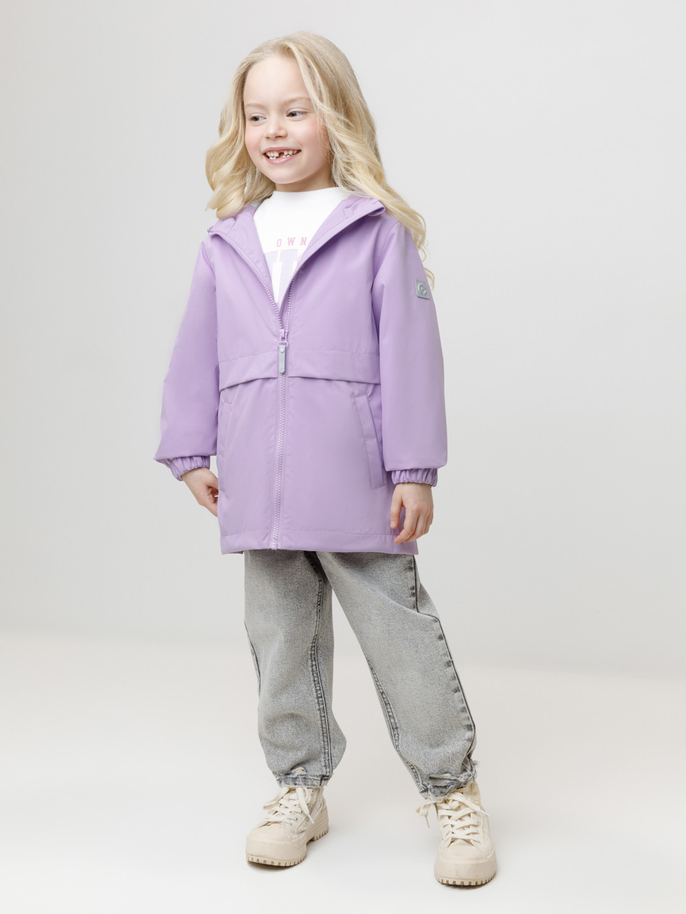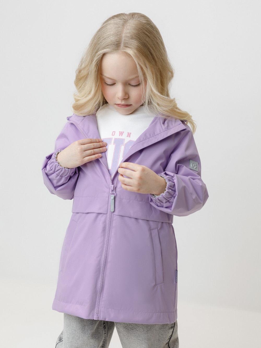 Ветровка для девочки из мембранной ткани с дополнительной тефлоновой обработкой. Верхняя мембранная ткань 1000/1000 с тефлоновым покрытием отталкивает воду и грязь и обладает «дышащими» свойствами. Подкладка выполнена из флиса. У изделия предусмотрена защита подбородка. Несъёмный капюшон регулируется с помощью эластичного шнура со стопперами. Низ рукавов имеет эластичную резинку для лучшего прилегания. Во всех изделиях верхнего ассортимента для безопасности ребёнка предусмотрены светоотражающие элементы.