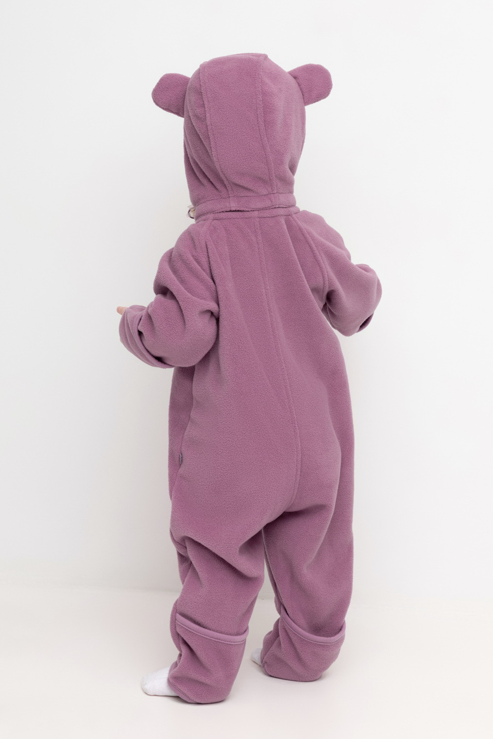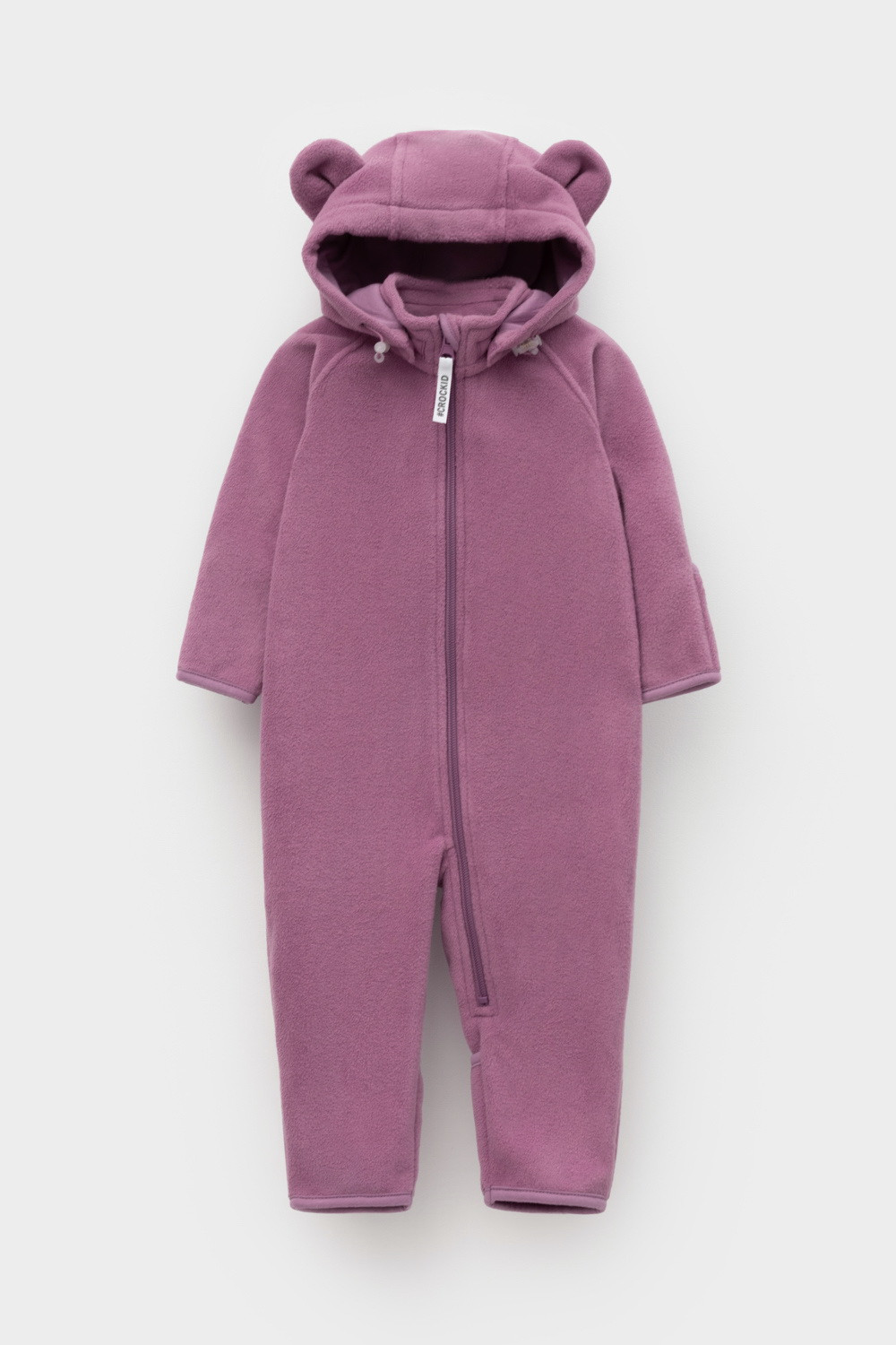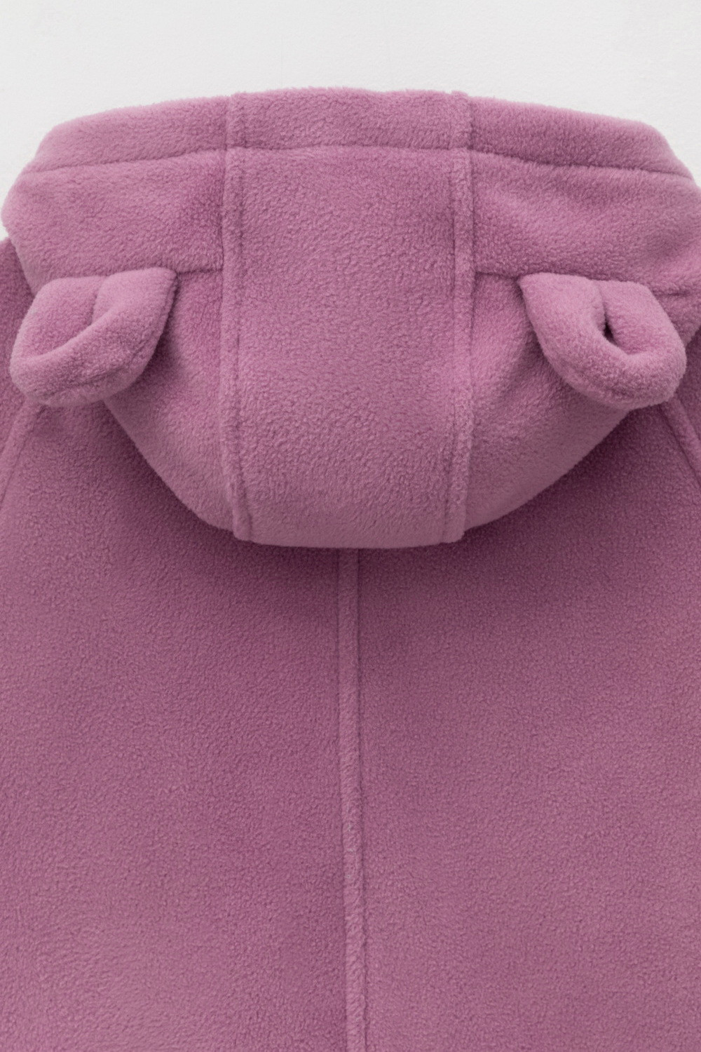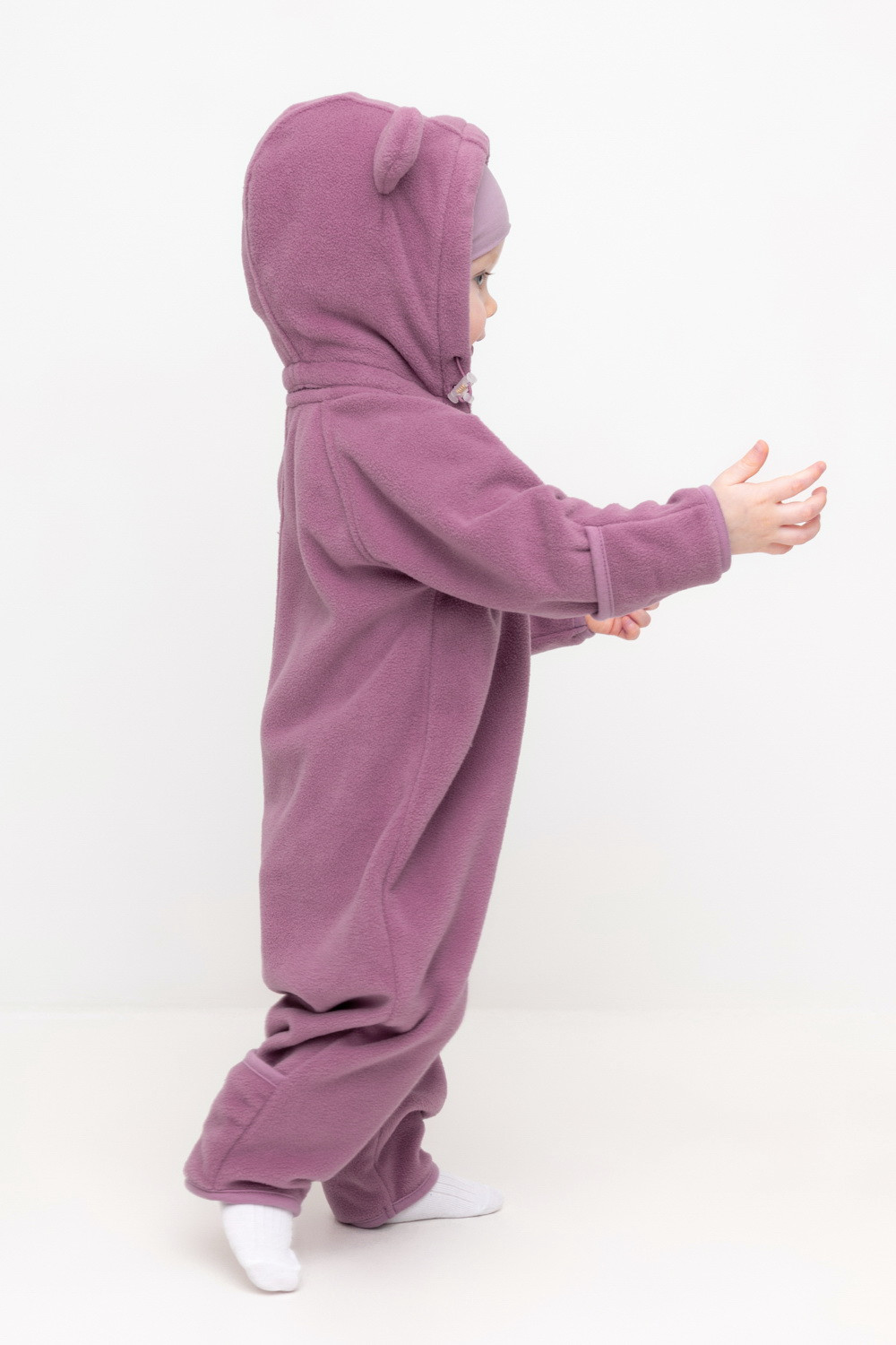 Флисовый комбинезон со съёмным капюшоном для девочки. У изделия высокий воротник и съёмный капюшон на кнопках с декоративными ушками и подкладом из супрема. Застёгивается на удлинённую молнию. Предусмотрена защита шеи и подбородка. В размерах 40/62 - 48/74 на рукавах и штанинах есть удобные отвороты. Комбинезон сохраняет цвет и форму после многократных стирок.