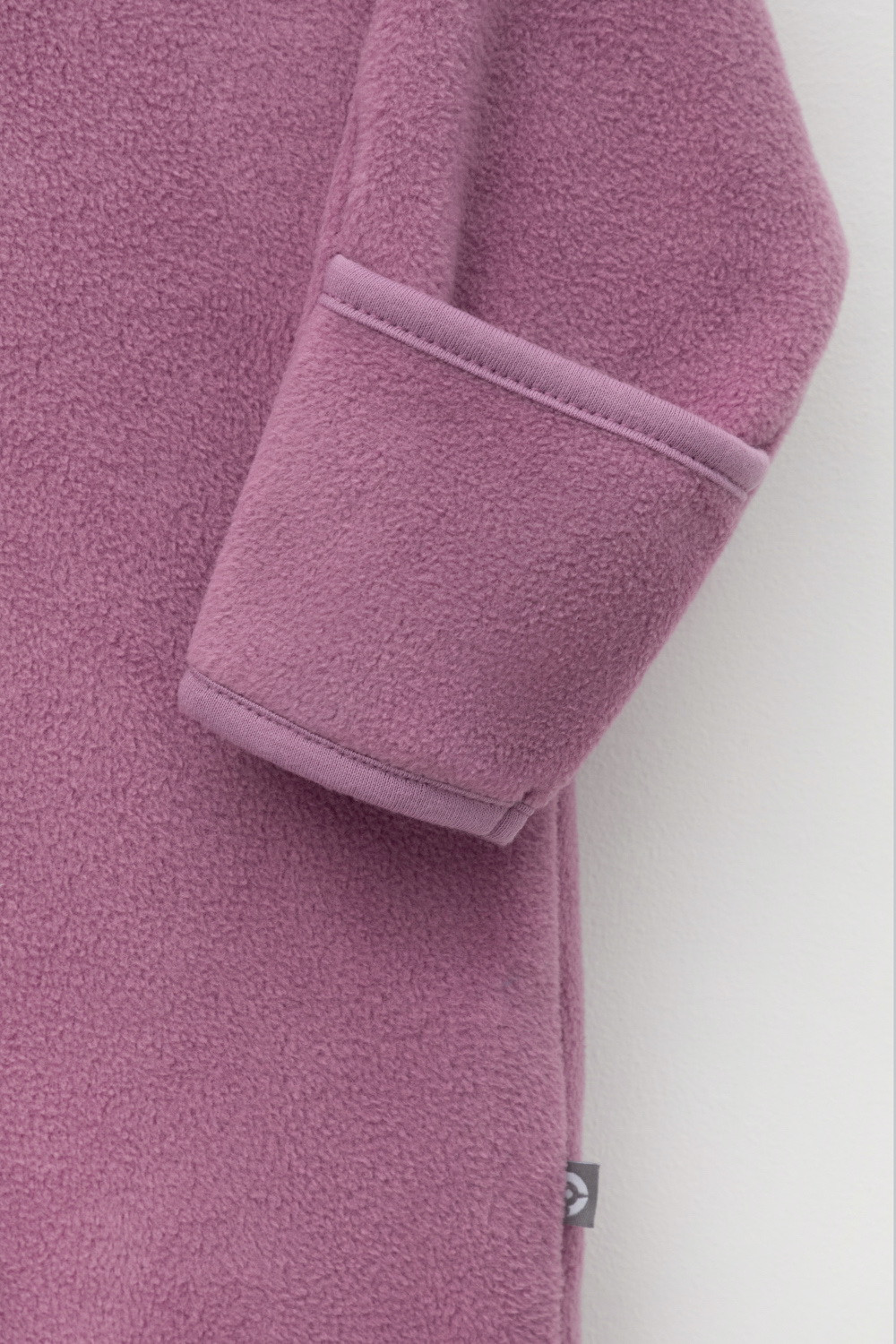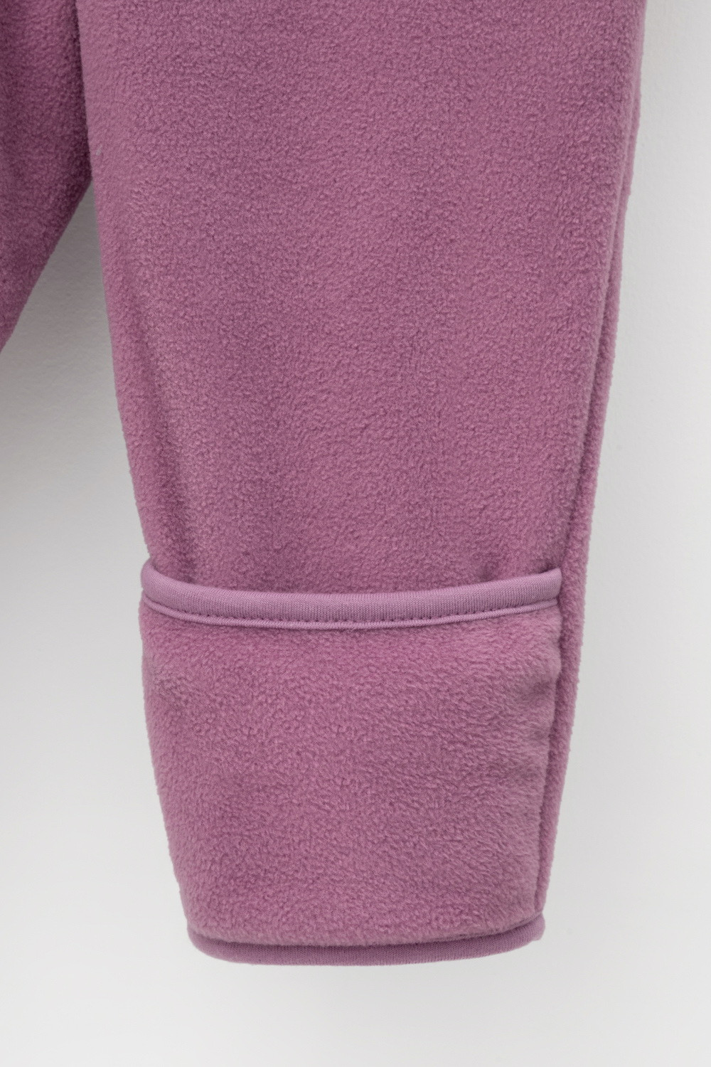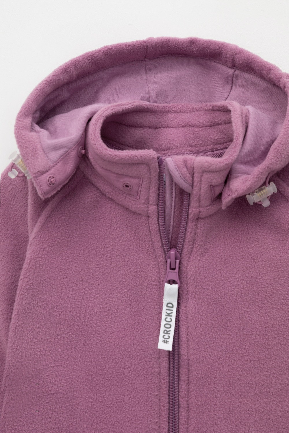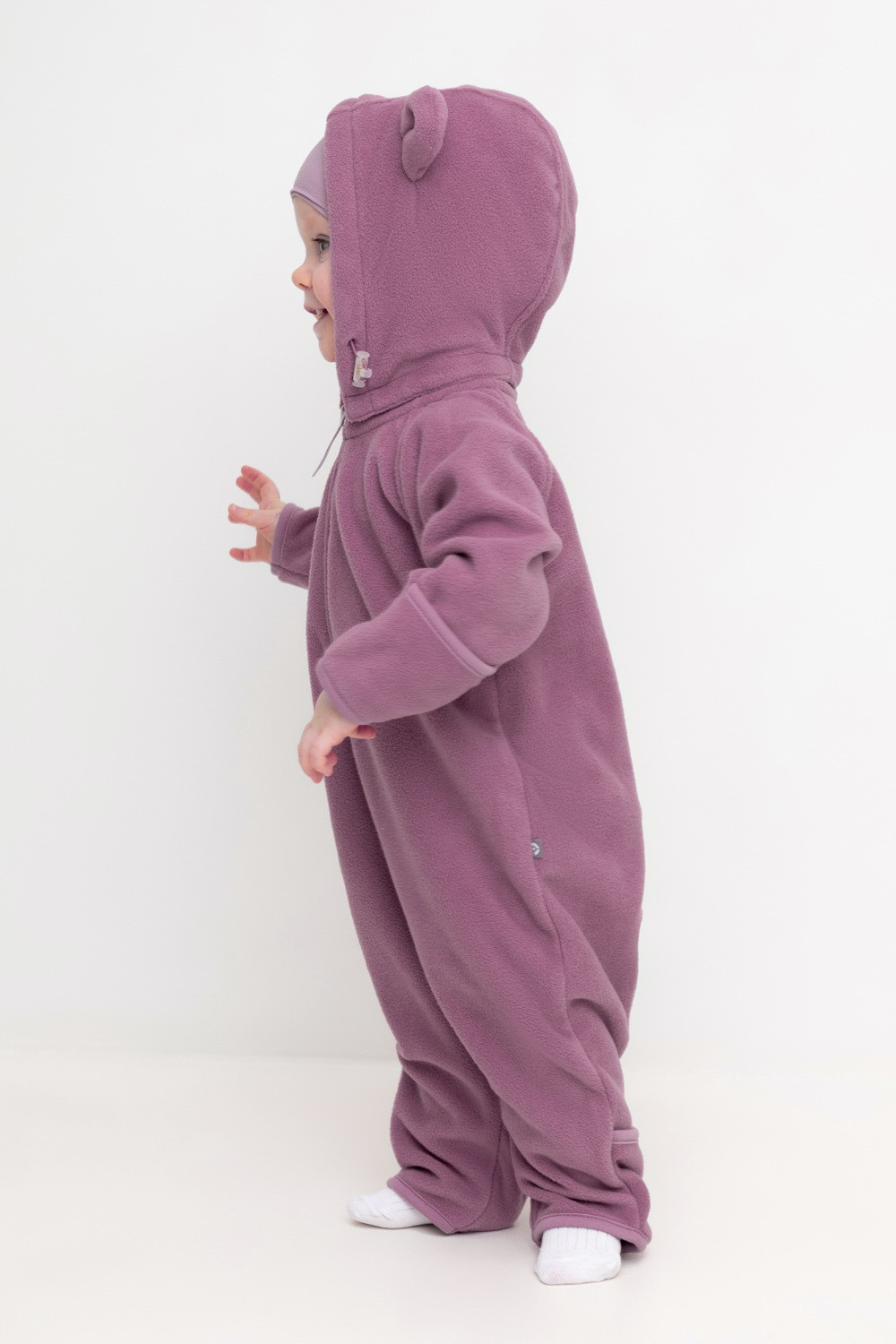Флисовый комбинезон со съёмным капюшоном для девочки. У изделия высокий воротник и съёмный капюшон на кнопках с декоративными ушками и подкладом из супрема. Застёгивается на удлинённую молнию. Предусмотрена защита шеи и подбородка. В размерах 40/62 - 48/74 на рукавах и штанинах есть удобные отвороты. Комбинезон сохраняет цвет и форму после многократных стирок.