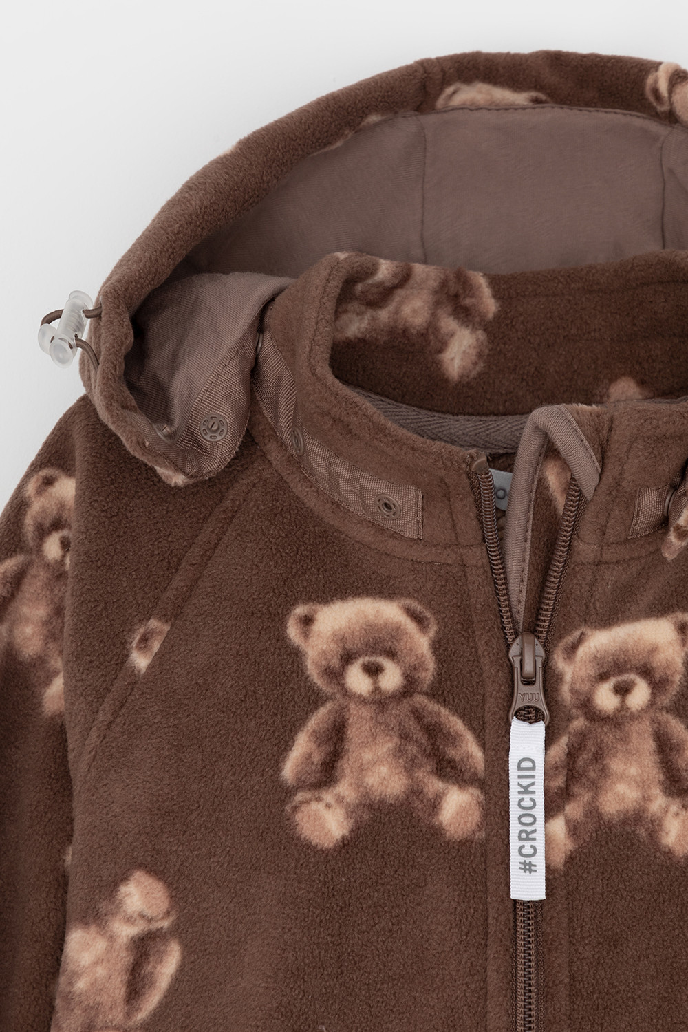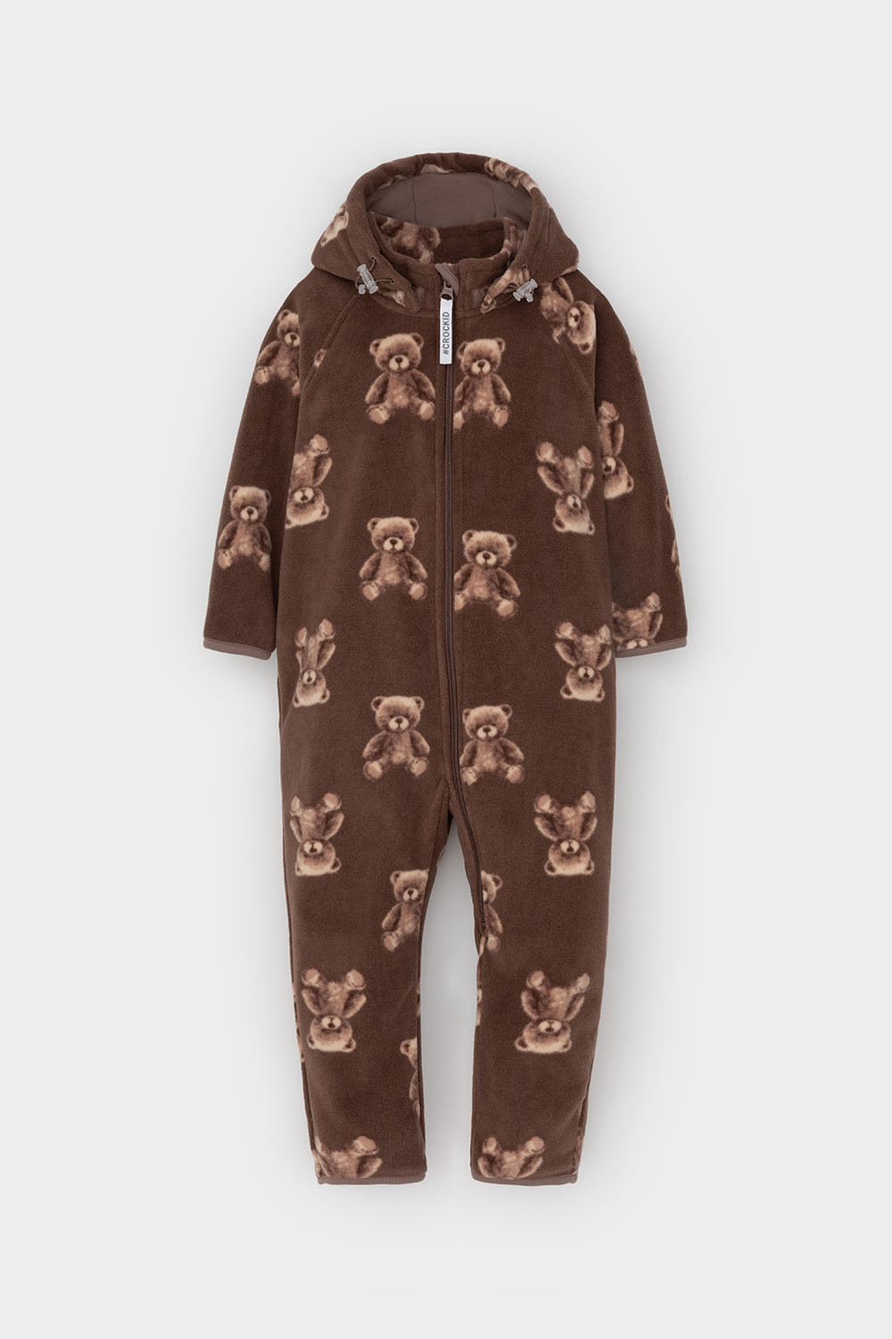 Флисовый комбинезон со съёмным капюшоном для девочки. У изделия высокий воротник и съёмный капюшон на кнопках. Застёгивается на удлинённую молнию. Предусмотрена защита шеи и подбородка. На рукавах и штанинах есть удобные отвороты. Оригинальная набивка выполнена из стойких, гипоаллергенных текстильных красителей. Комбинезон сохраняет цвет и форму после многократных стирок.