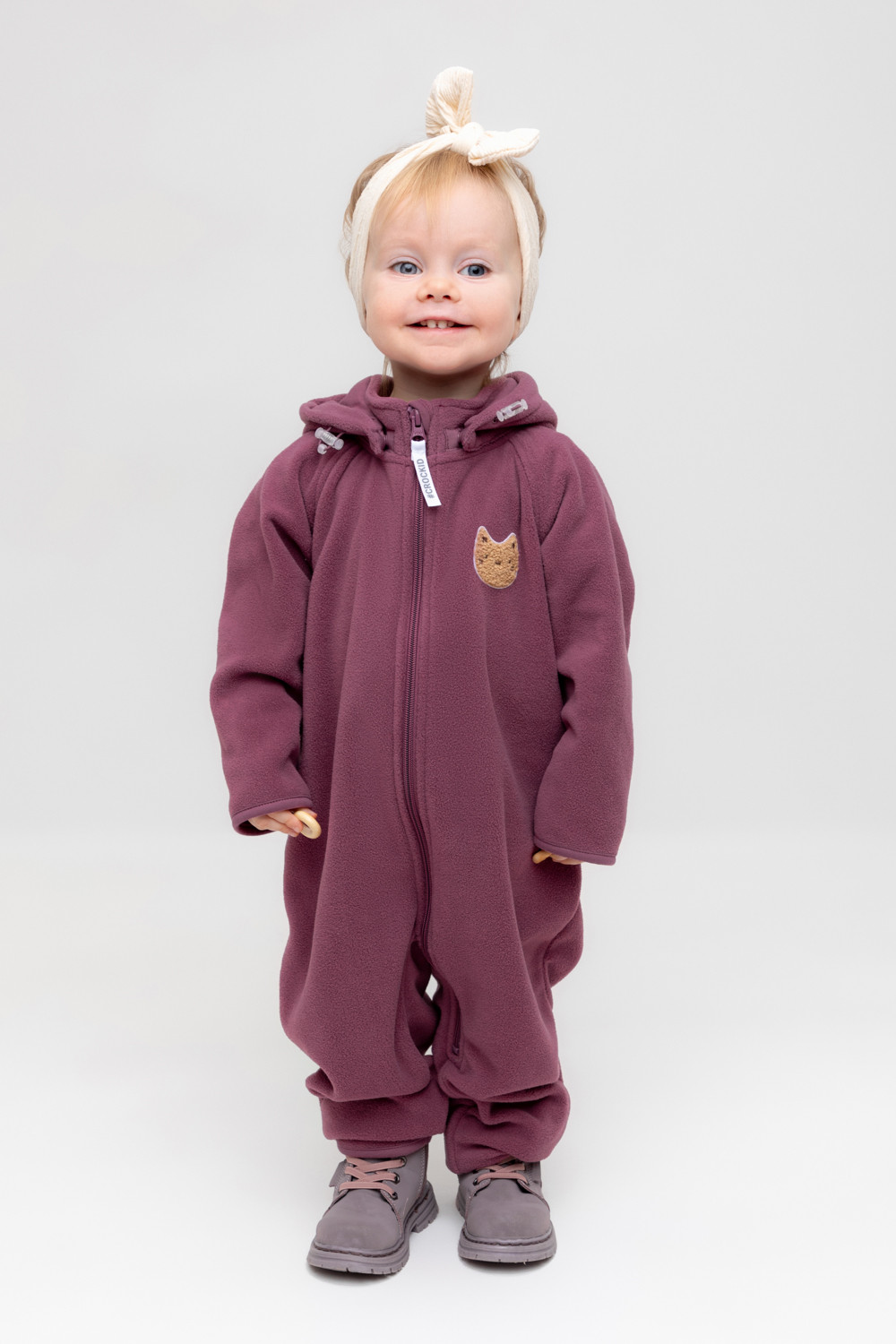 Флисовый комбинезон со съёмным капюшоном для девочки. У изделия высокий воротник и съёмный капюшон на кнопках. Застёгивается на удлинённую молнию. Предусмотрена защита шеи и подбородка. В размерах 40/62 - 48/74 на рукавах и штанинах есть удобные отвороты. Комбинезон сохраняет цвет и форму после многократных стирок.