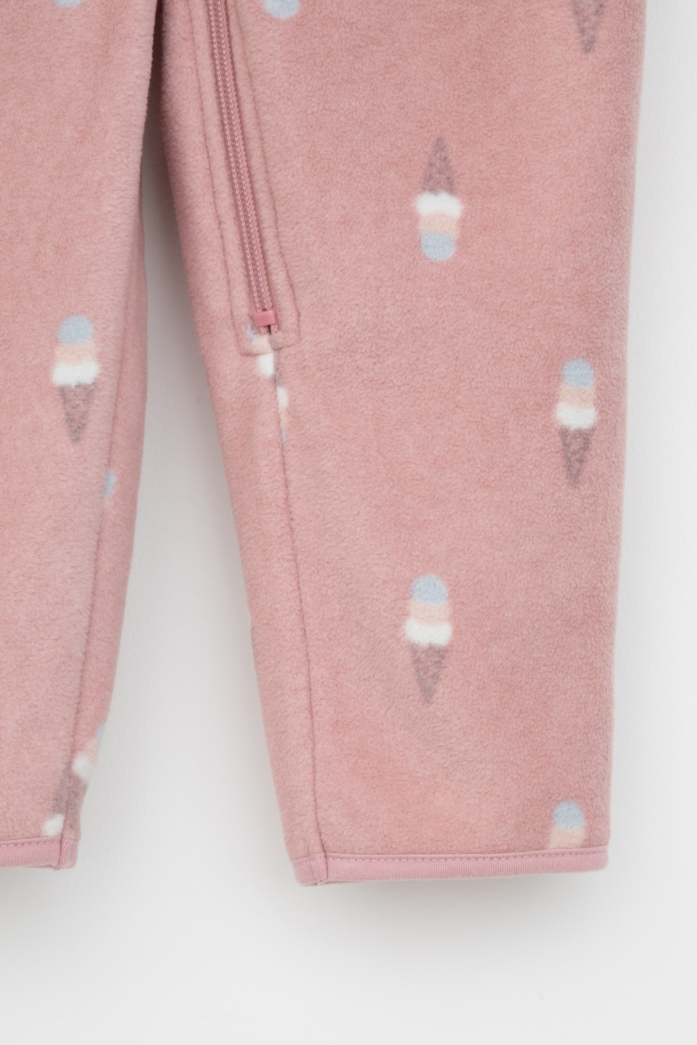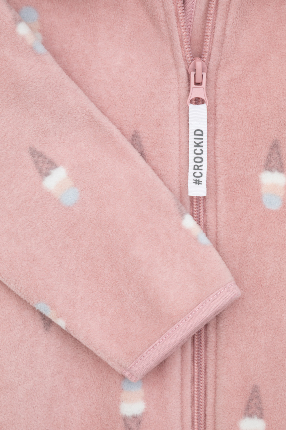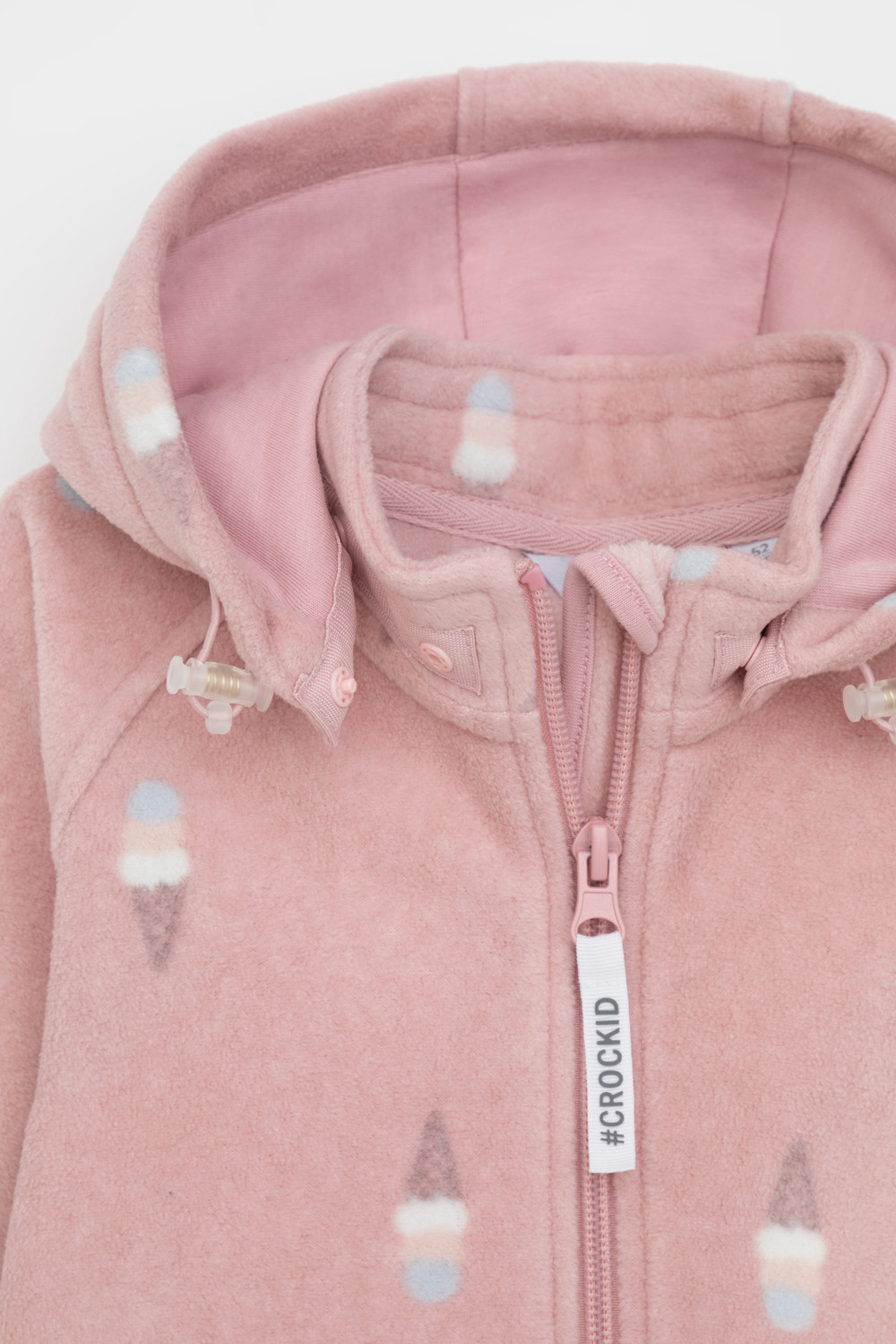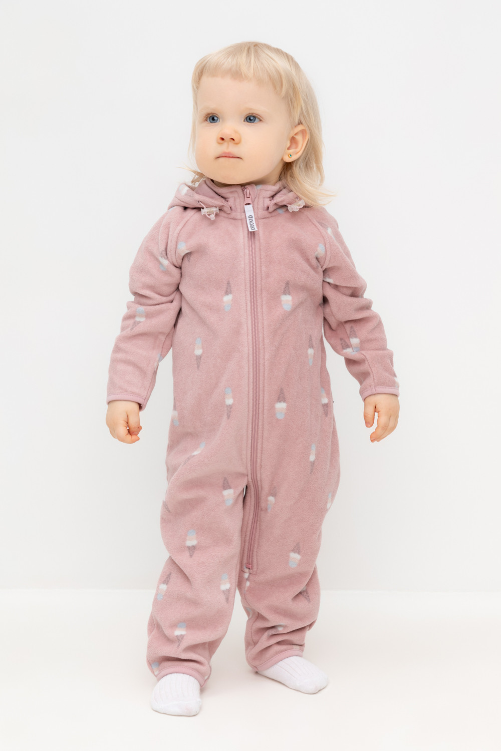 Флисовый комбинезон со съёмным капюшоном для девочки. У изделия высокий воротник и съёмный капюшон на кнопках с подкладом из супрема. Застёгивается на удлинённую молнию. Предусмотрена защита шеи и подбородка. В размерах 40/62 - 48/74 на рукавах и штанинах есть удобные отвороты. Оригинальная набивка выполнена из стойких, гипоаллергенных текстильных красителей. Комбинезон сохраняет цвет и форму после многократных стирок.