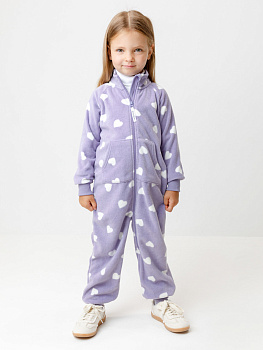 Флисовый комбинезон для девочки с высоким воротником. Застёгивается на удлинённую молнию с мягкой защитой шеи и подбородка. Рукава и низ изделия на манжетах из  трикотажа в рубчик. Эластичная резинка по спинке обеспечивает идеальную посадку. Спереди удобный карман-кенгуру. Оригинальная набивка выполнена из стойких гипоаллергенных текстильных красителей. Комбинезон сохраняет цвет и форму после многократных стирок.