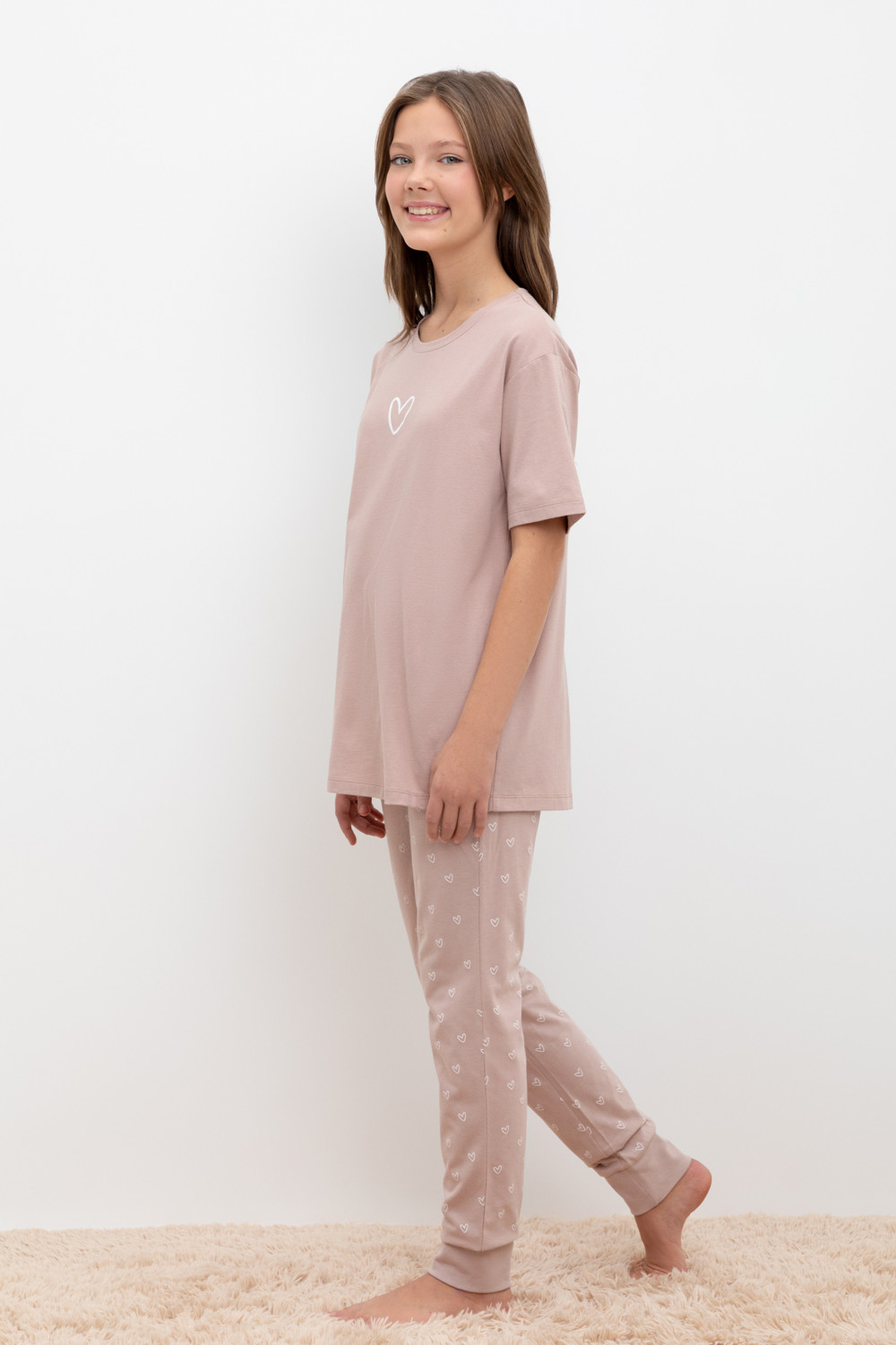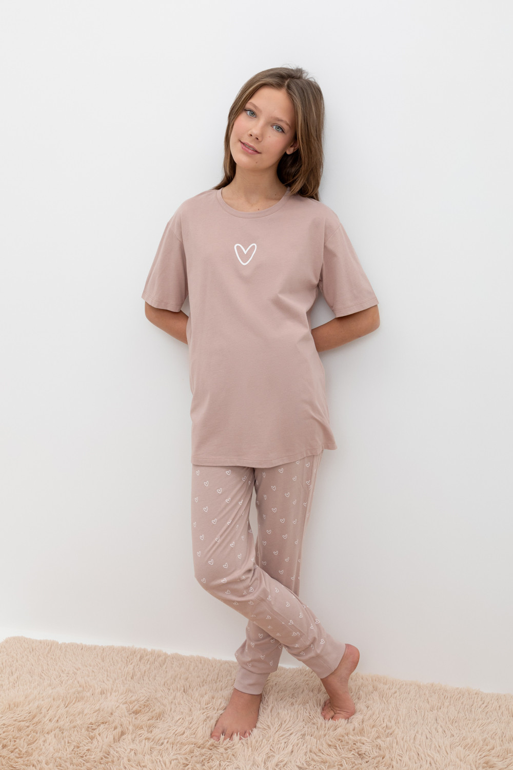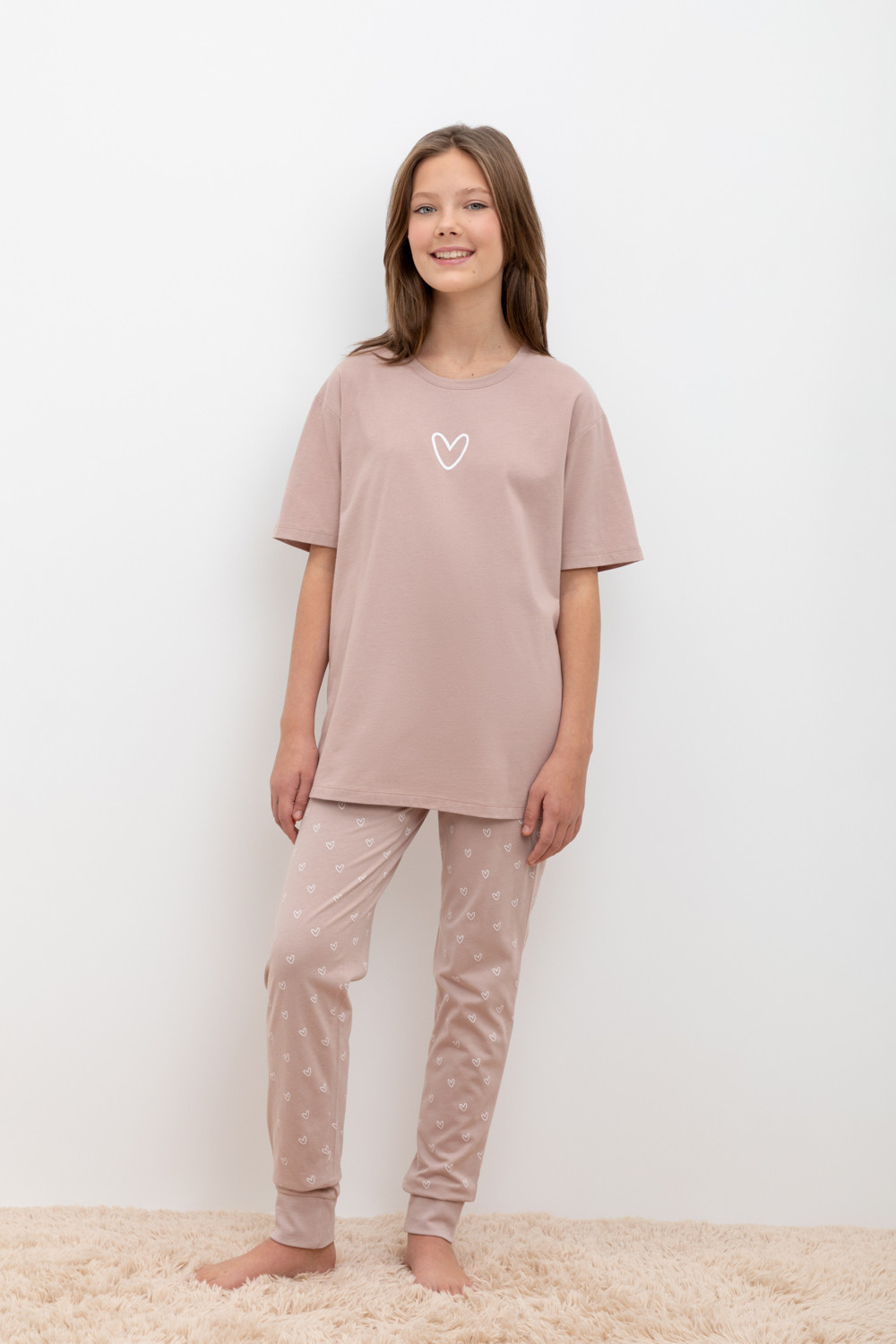Трикотажный пижамный комплект из натурального хлопка. У футболки короткие рукава со спущенными плечами. Брюки с удобным поясом на резинке и эластичными манжетами. Оригинальная набивка и принт выполнены из стойких, гипоаллергенных текстильных красителей. Все трикотажные полотна производятся в соответствии с нормами Швейцарского сертификата ЭкоТекс.