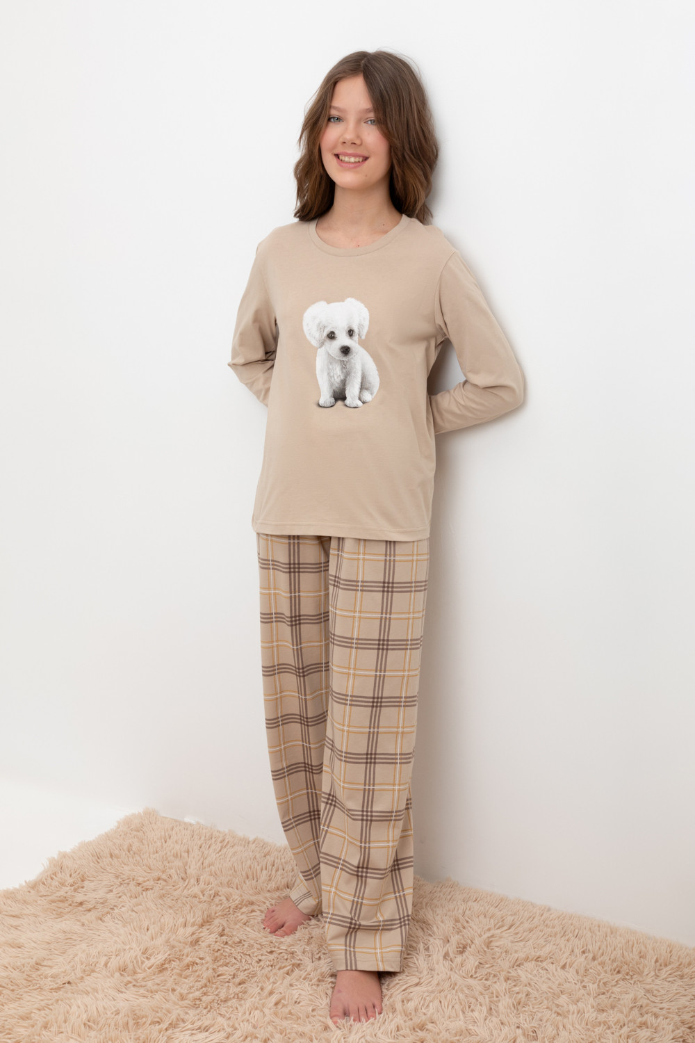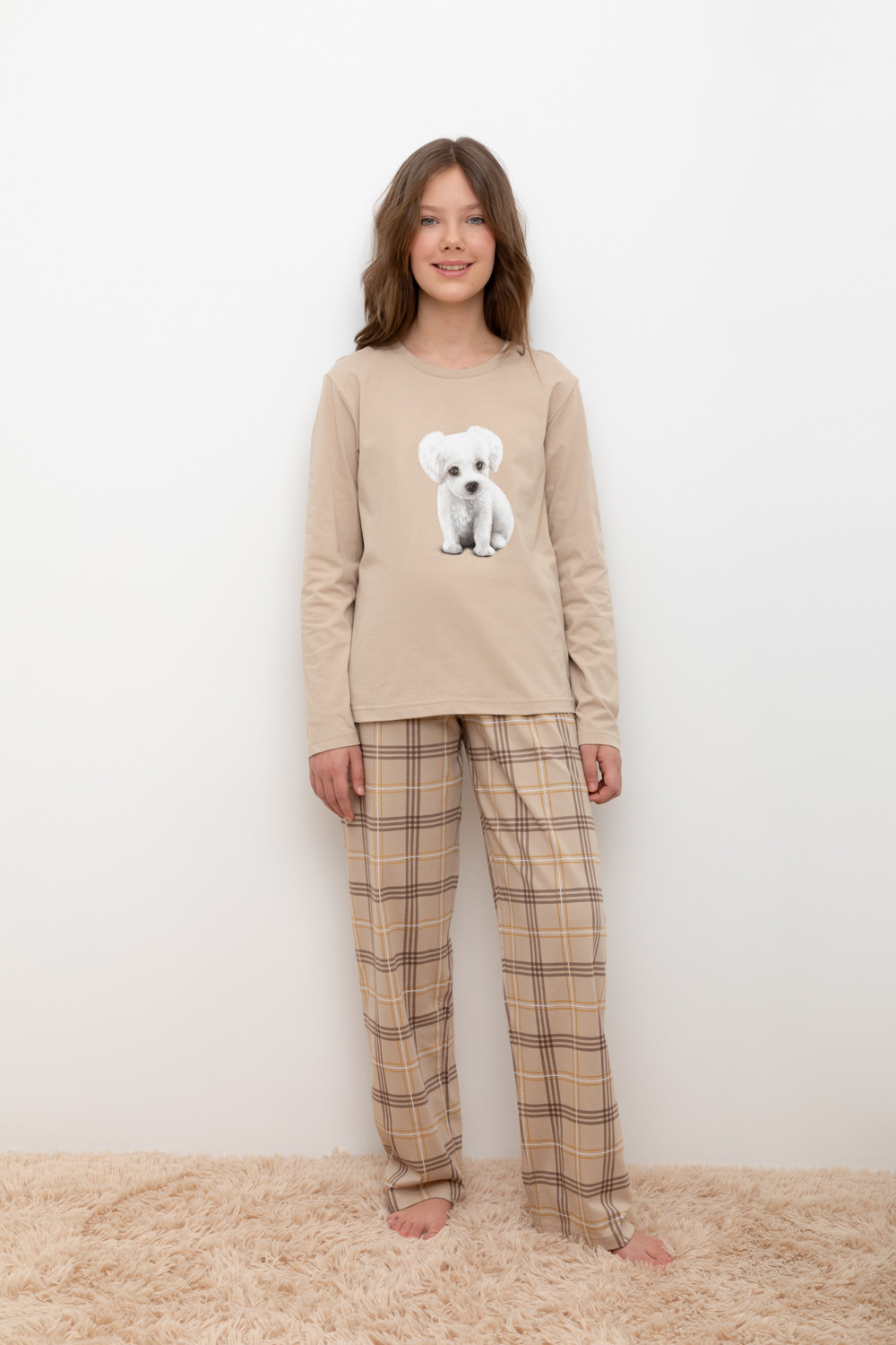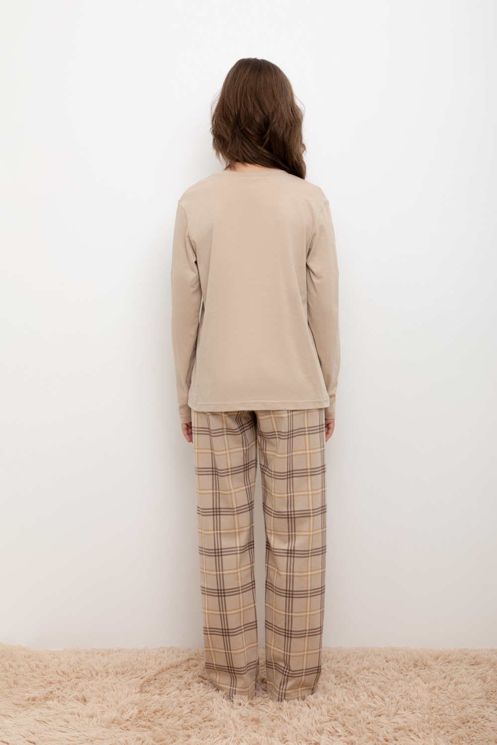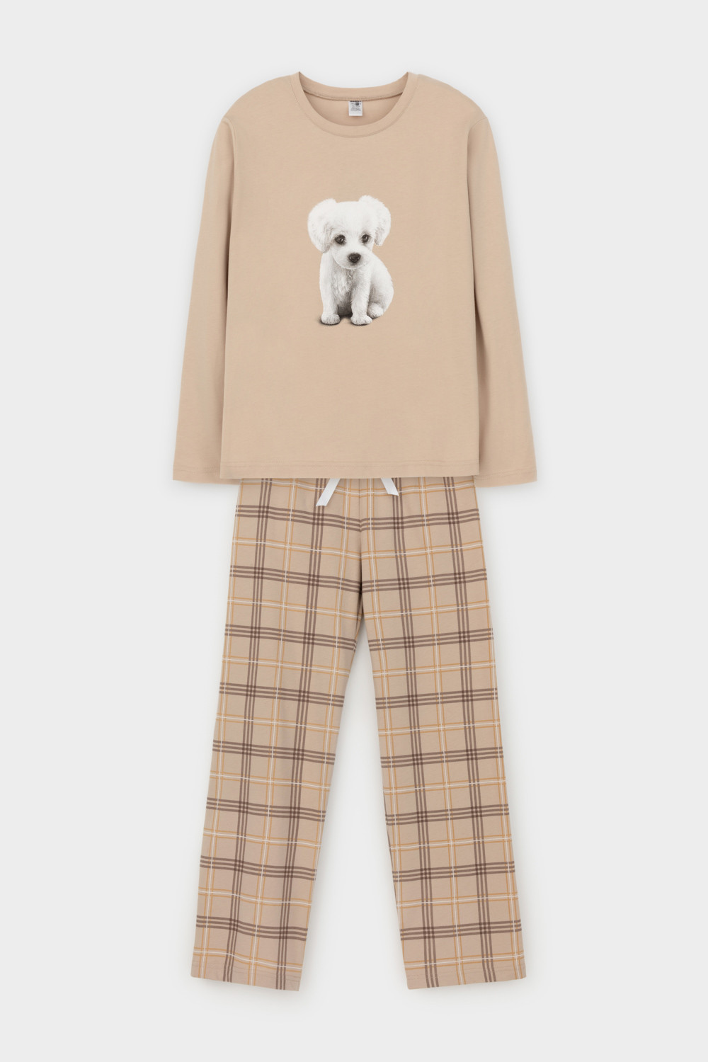 Трикотажный пижамный комплект из натурального хлопка. У джемпера длинные втачные рукава. Брюки с удобным поясом на резинке и атласной лентой . Оригинальная набивка и принт выполнены из стойких, гипоаллергенных текстильных красителей. Все трикотажные полотна производятся в соответствии с нормами Швейцарского сертификата ЭкоТекс.