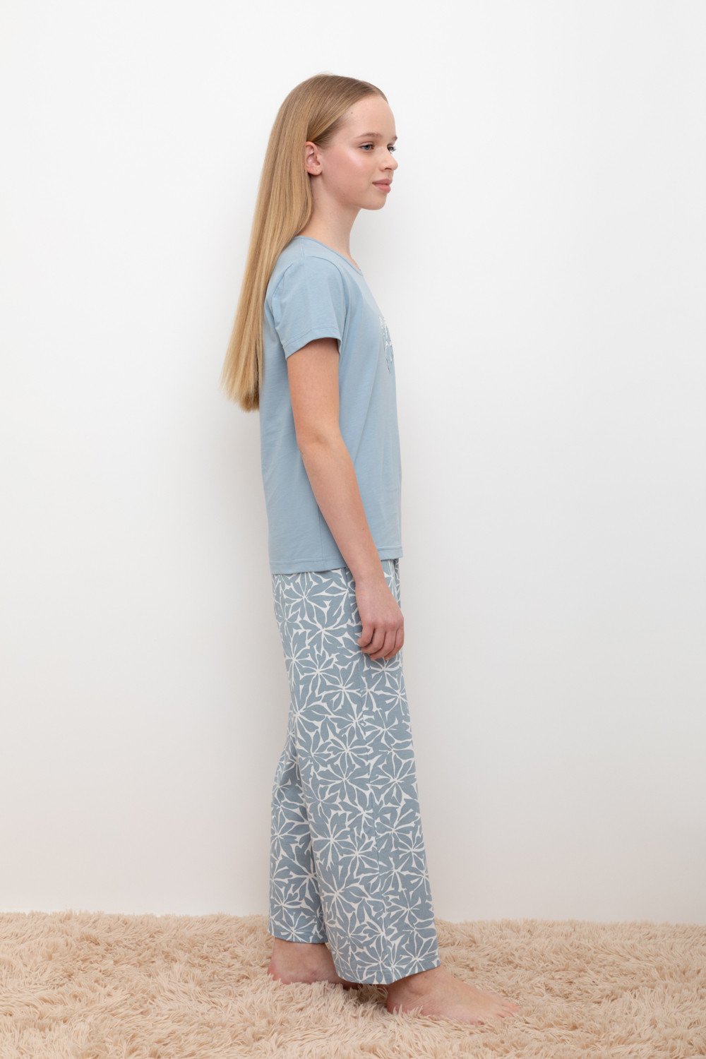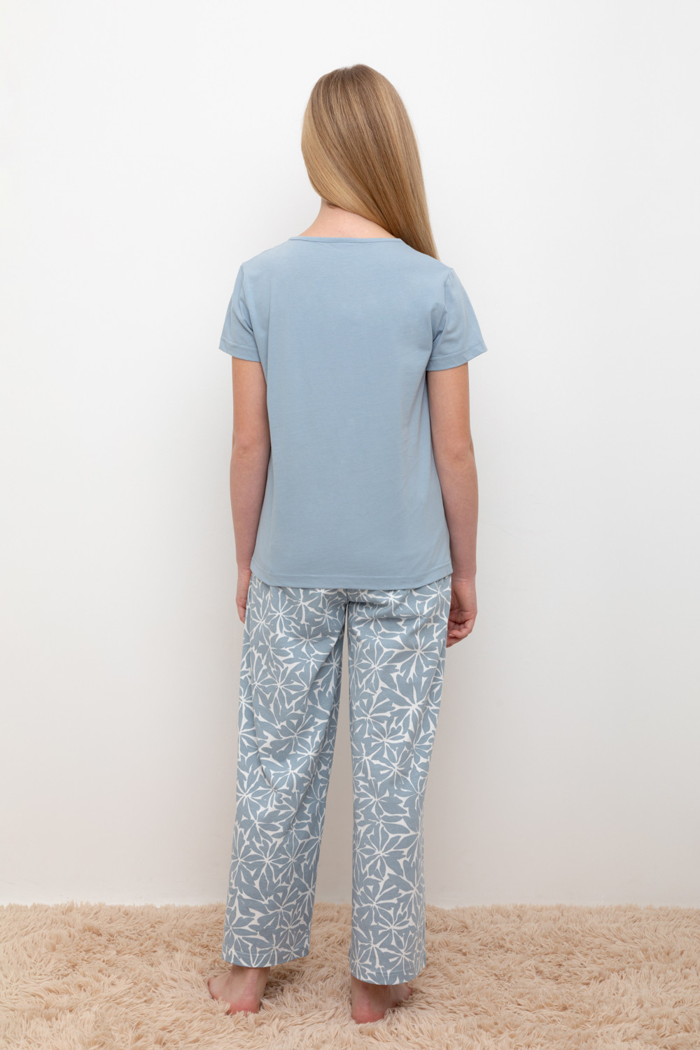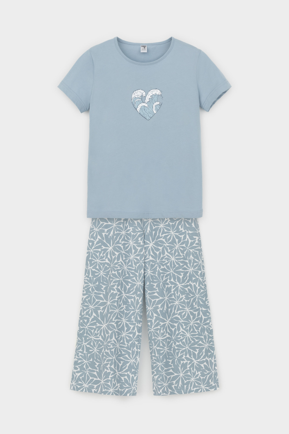 Трикотажный пижамный комплект из натурального хлопка. В комплекте футболка с короткими рукавами и  со спущенными плечами. Укороченные брюки с удобным поясом на резинке. Оригинальная набивка и принт выполнены из стойких, гипоаллергенных текстильных красителей. Все трикотажные полотна производятся в соответствии с нормами Швейцарского сертификата ЭкоТекс.