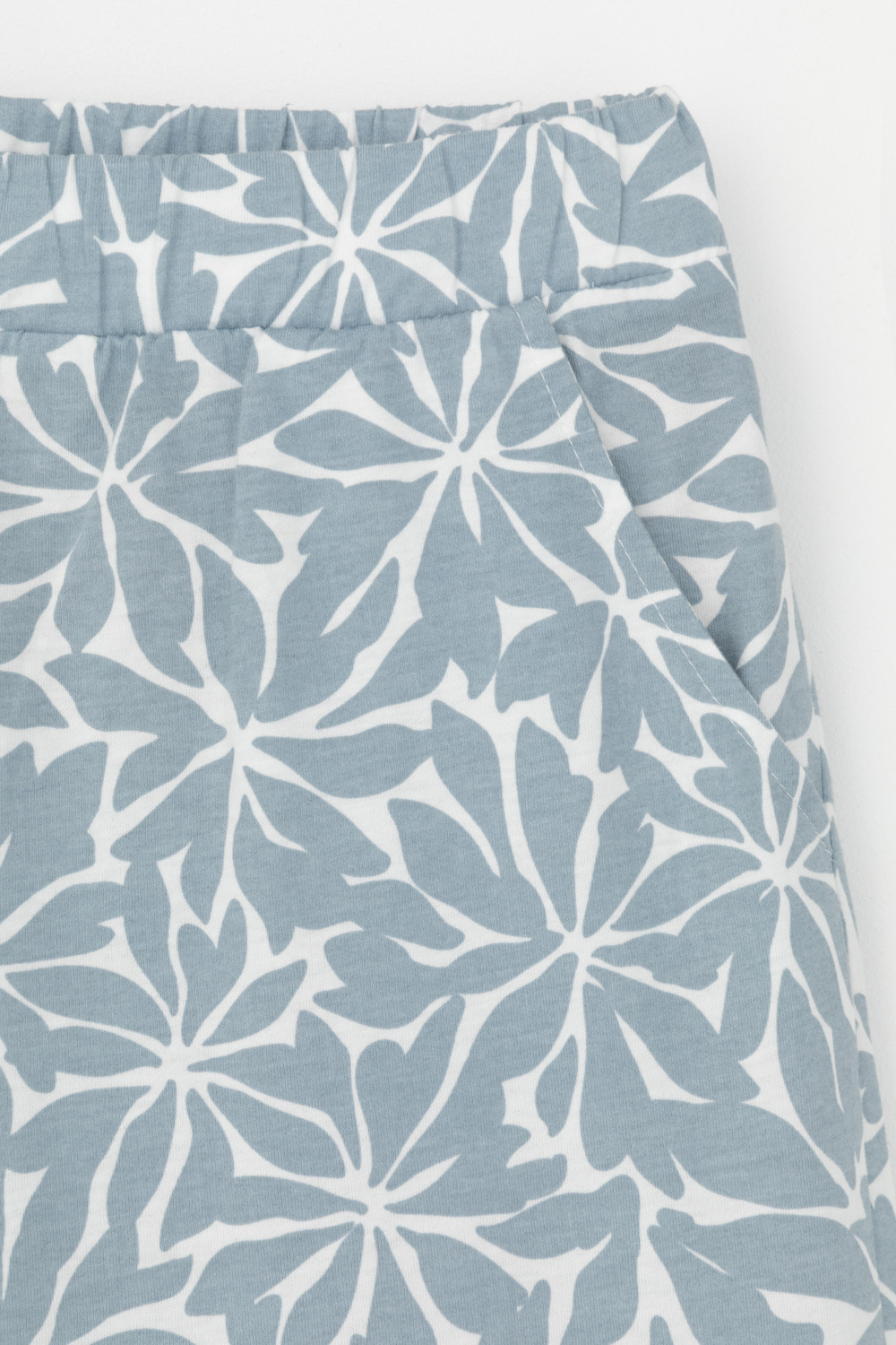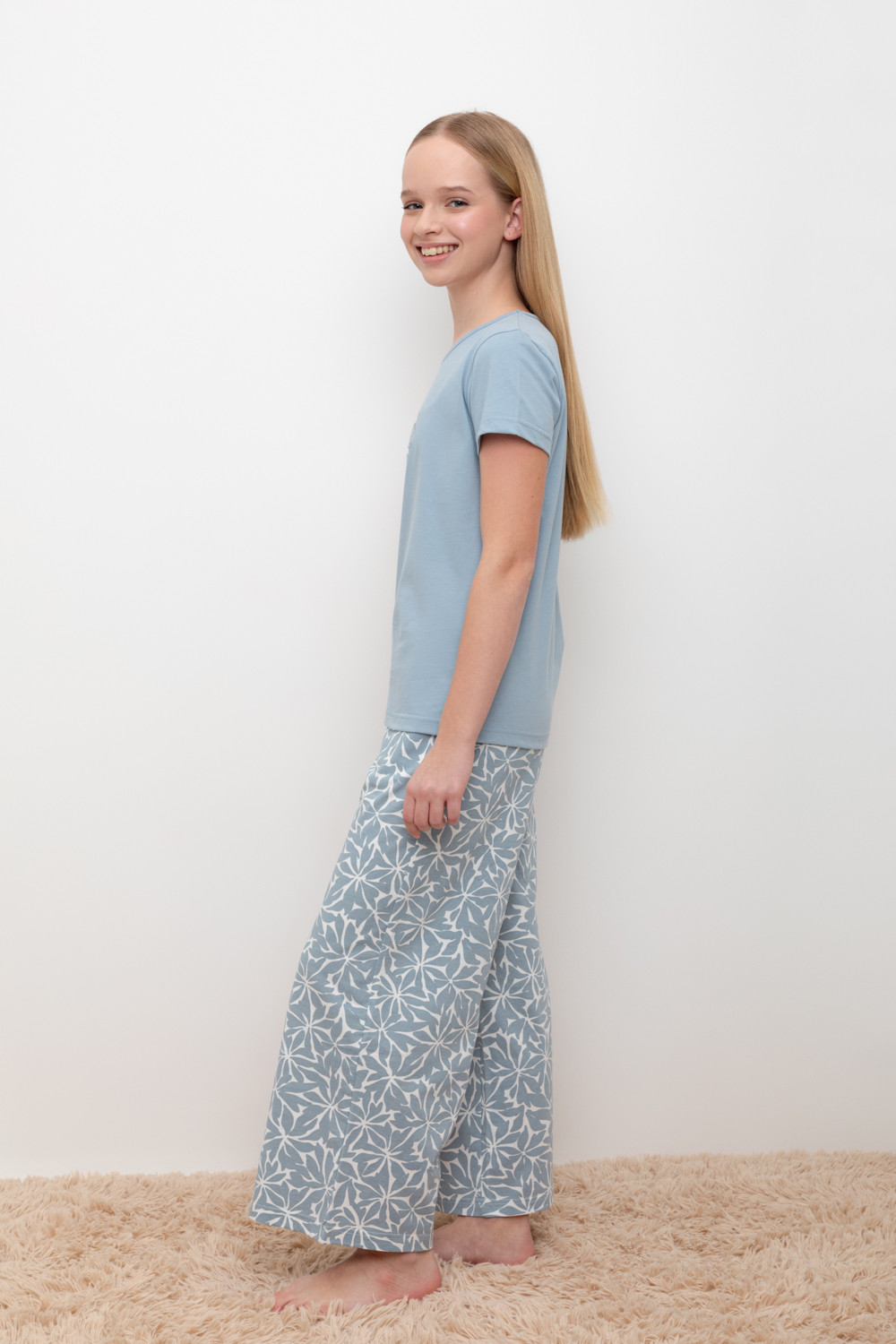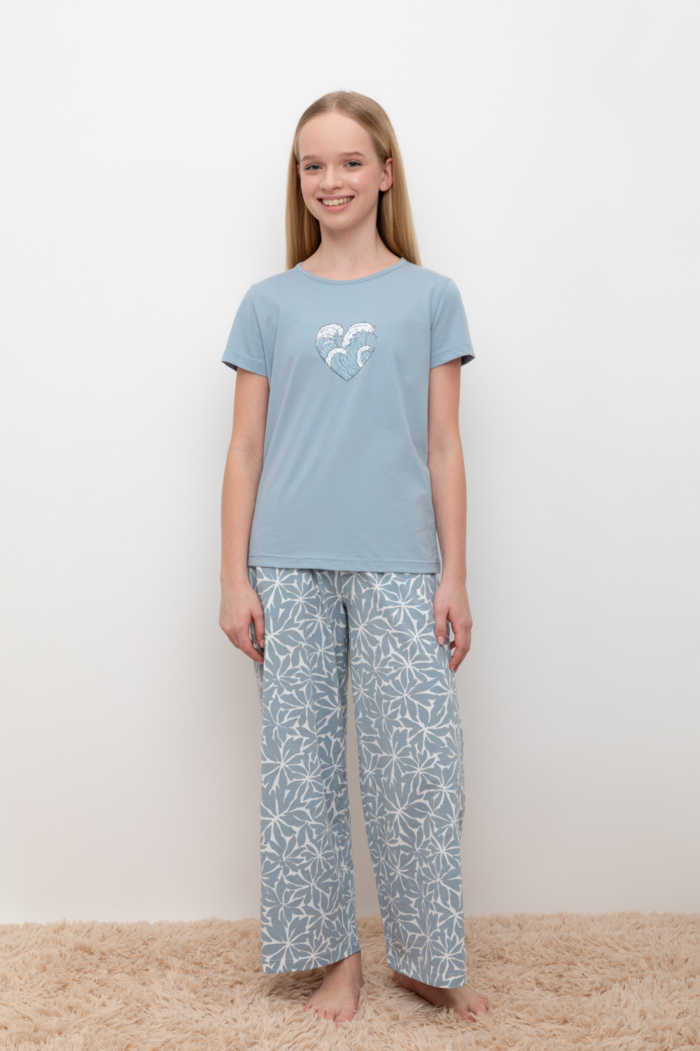 Трикотажный пижамный комплект из натурального хлопка. В комплекте футболка с короткими рукавами и  со спущенными плечами. Укороченные брюки с удобным поясом на резинке. Оригинальная набивка и принт выполнены из стойких, гипоаллергенных текстильных красителей. Все трикотажные полотна производятся в соответствии с нормами Швейцарского сертификата ЭкоТекс.