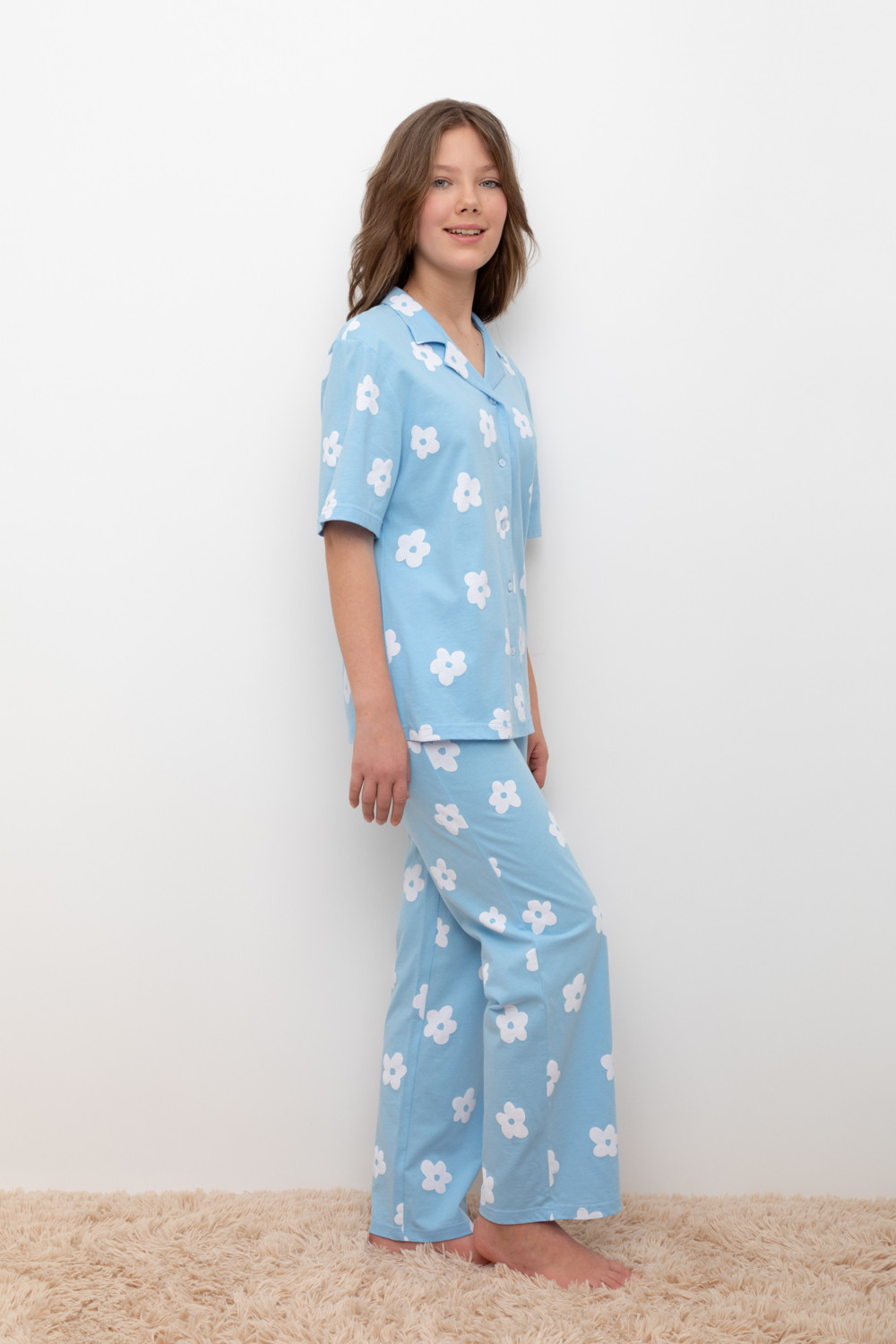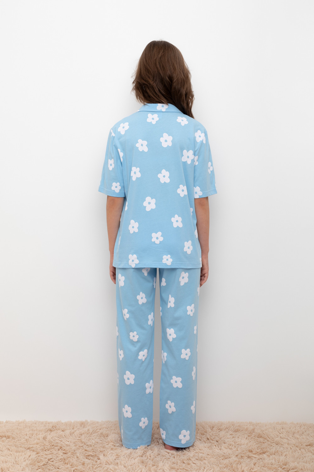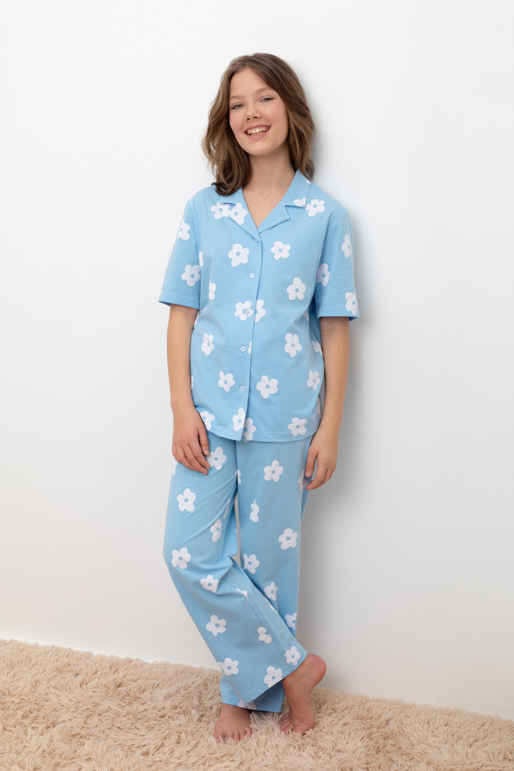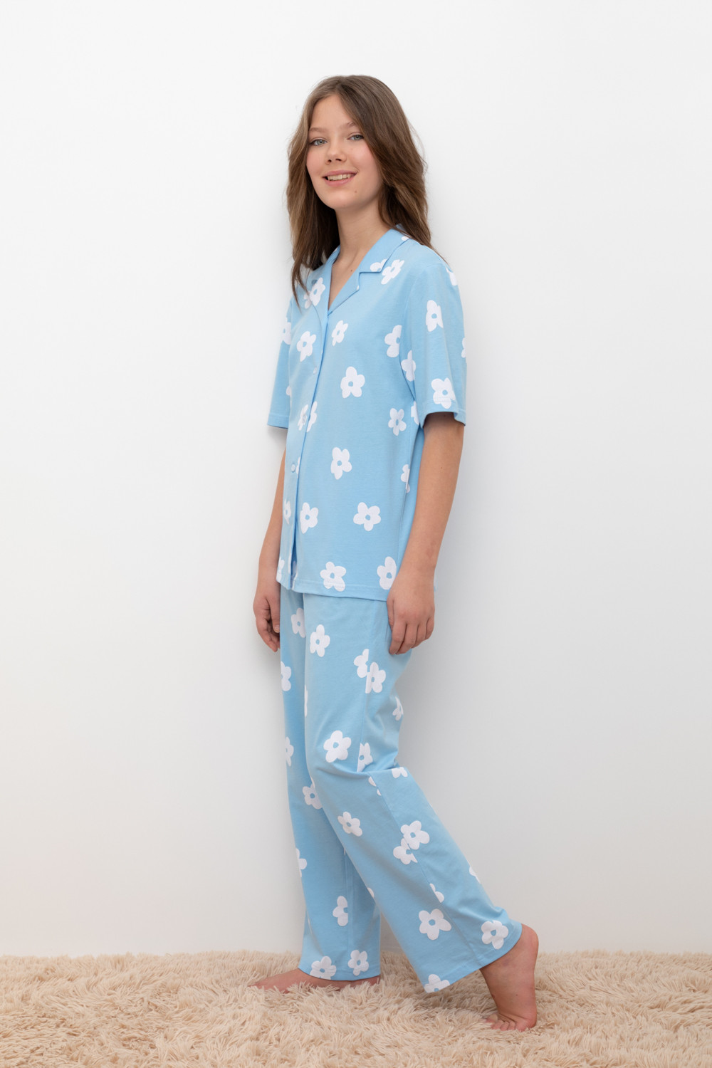 Трикотажный пижамный комплект из натурального хлопка. В комплекте рубашка с короткими рукавами и застежкой на пуговицы. Прямые брюки с удобным поясом на резинке. Оригинальная набивка выполнена из стойких, гипоаллергенных текстильных красителей. Все трикотажные полотна производятся в соответствии с нормами Швейцарского сертификата ЭкоТекс.