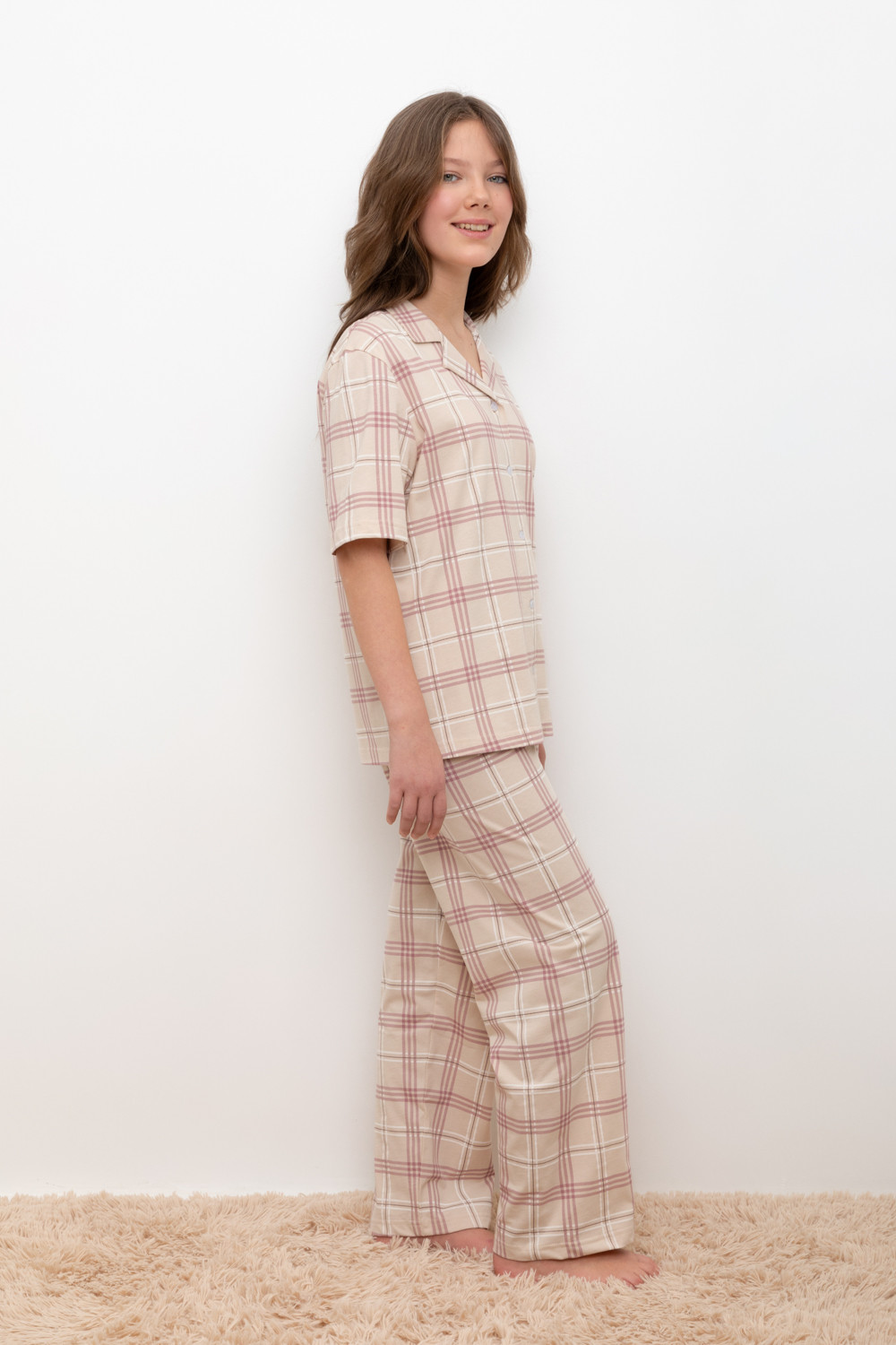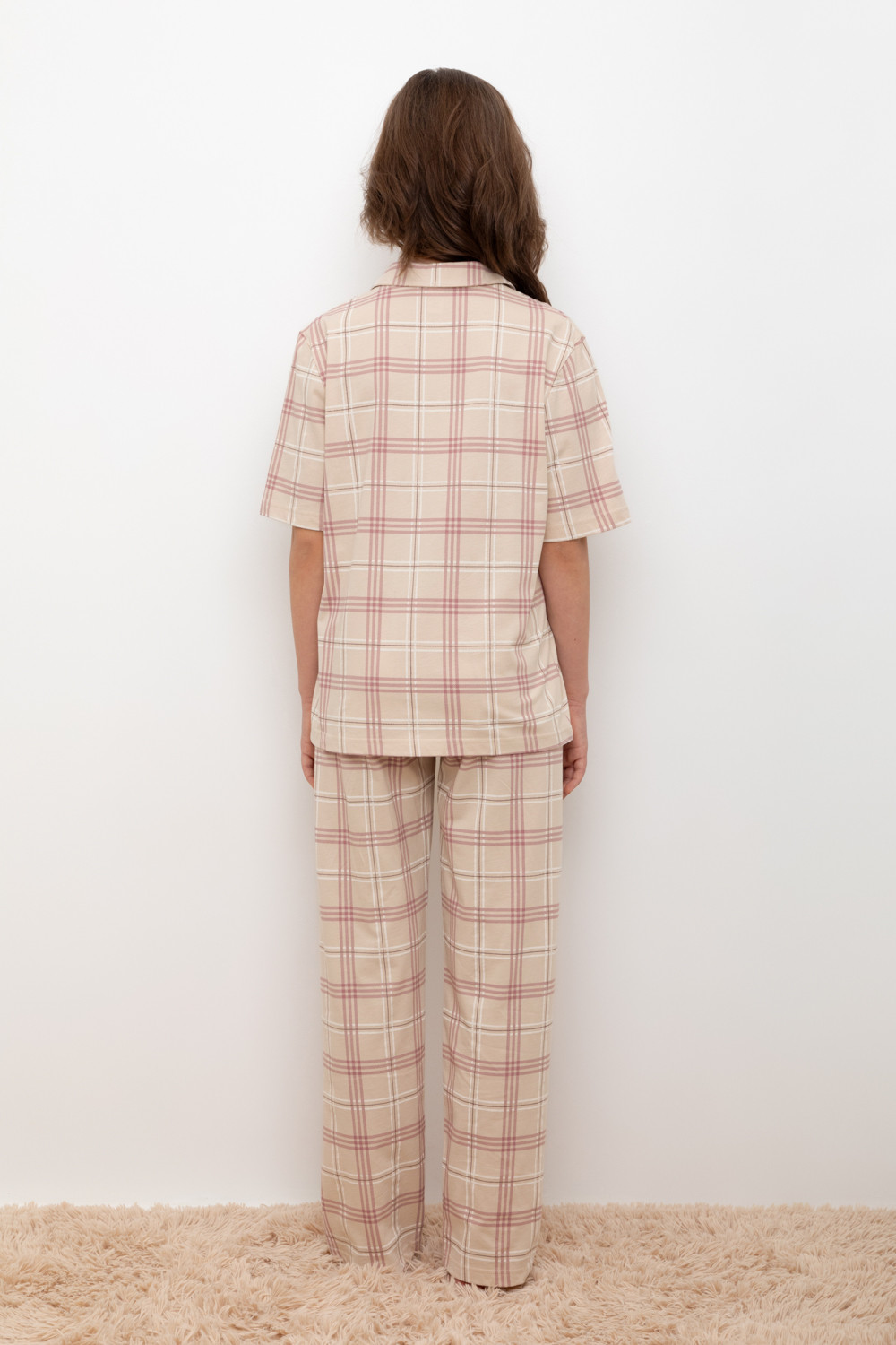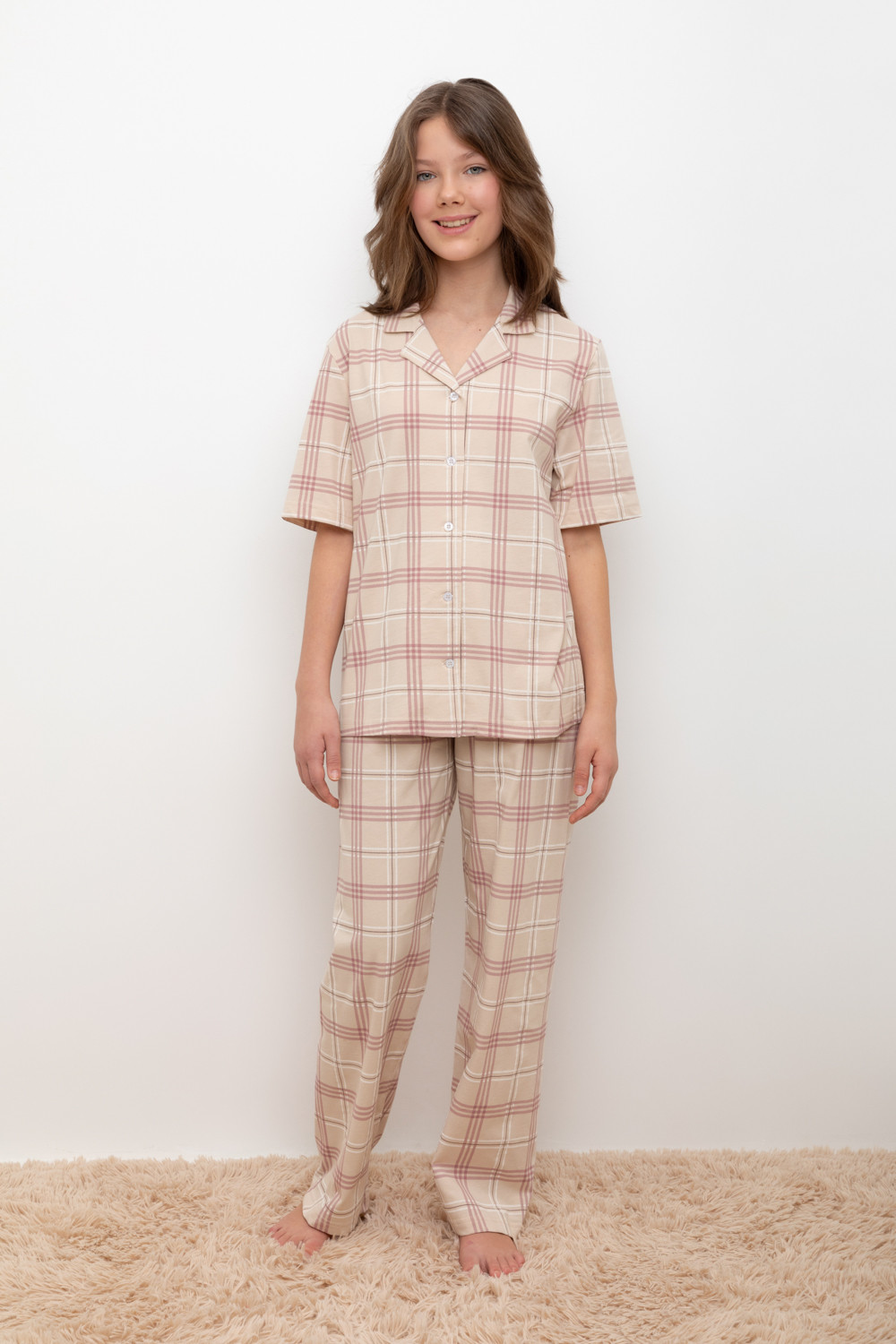 Трикотажный пижамный комплект из натурального хлопка. В комплекте рубашка с короткими рукавами и  застежкой на пуговицы. Прямые  брюки с удобным поясом на резинке. Оригинальная набивка выполнена из стойких, гипоаллергенных текстильных красителей. Все трикотажные полотна производятся в соответствии с нормами Швейцарского сертификата ЭкоТекс.