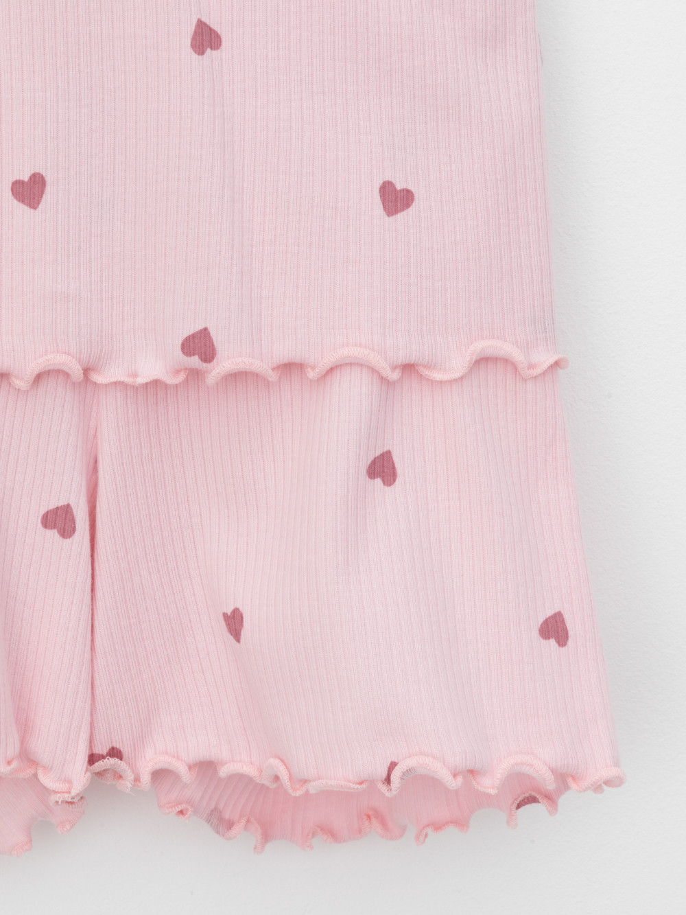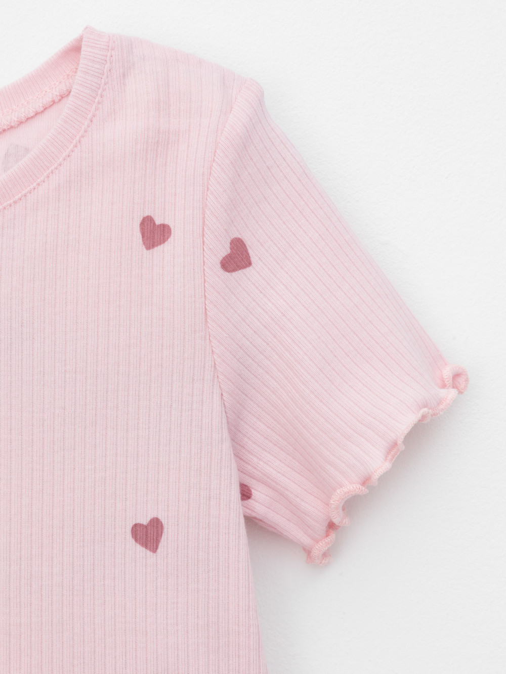 Трикотажная пижама в рубчик из натурального хлопка. Футболка с короткими втачными рукавами и шорты с эластичной резинкой в поясе. Оригинальная набивка выполнена из стойких текстильных гипоаллергенных красителей. Изделие сохраняет цвет и форму после многократных стирок. Все трикотажные полотна производятся в соответствии с нормами швейцарского сертификата ЭкоТекс.