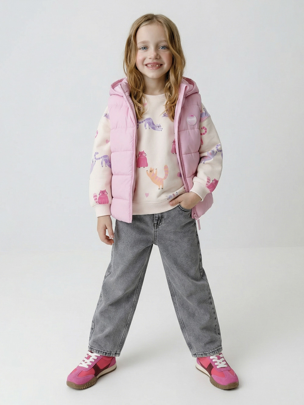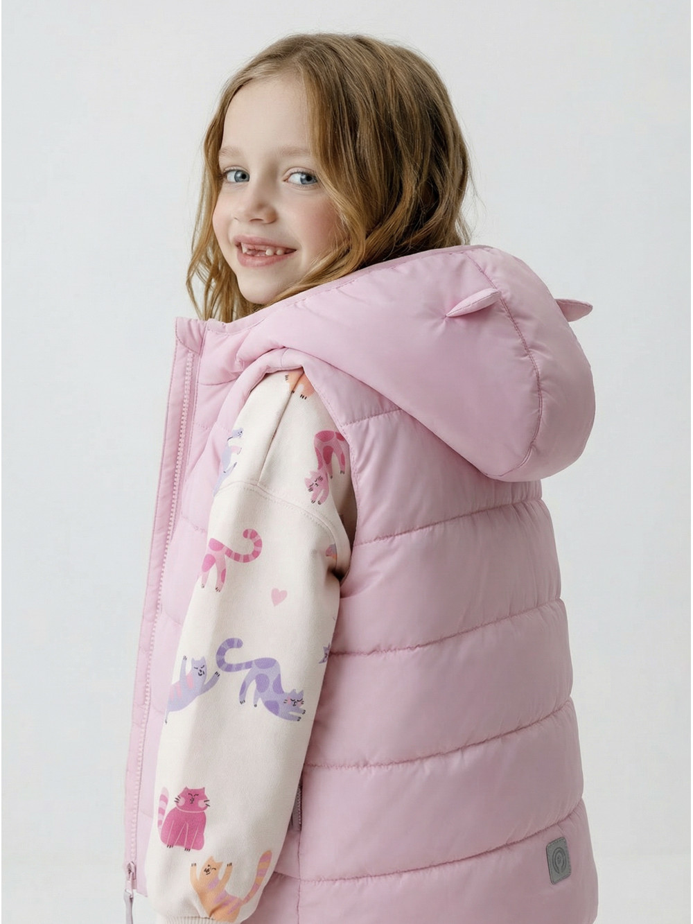 Стёганый жилет с капюшоном для девочки с утеплителем Fellex®, 120 г/м2. Выполнен из мембранной ткани с дополнительной тефлоновой обработкой. Данный вид обработки предохраняет изделие от загрязнения и лучше отводит влагу. Подклад из хлопка в размерах 86-92 и 92-98 и из полиэстера в размерах от 98-104 до 122-128. Капюшон не снимается, обработан по краю эластичным кантом для лучшего прилегания. Изделие застёгивается на молнию, предусмотрена защита подбородка. Два кармана по бокам без застёжек. Во всех изделиях верхнего ассортимента для безопасности ребёнка предусмотрены светоотражающие элементы.