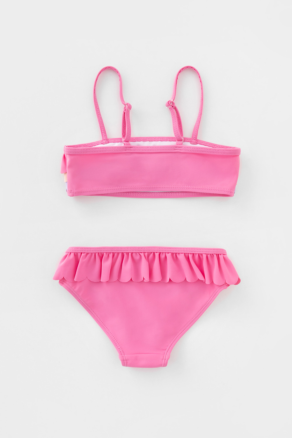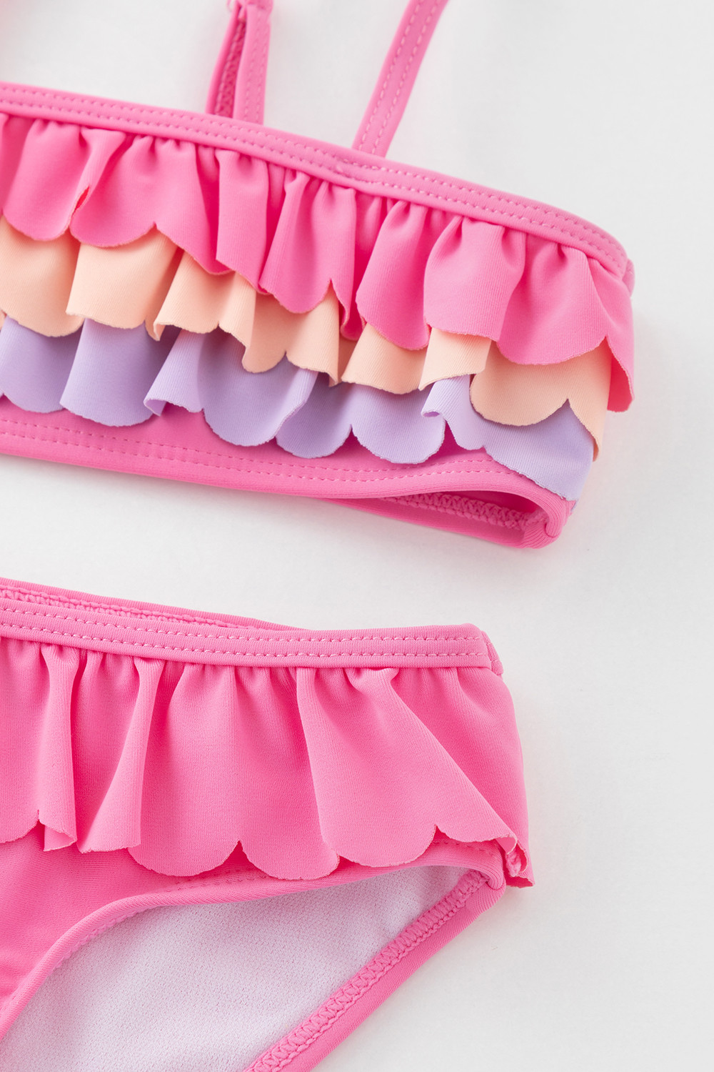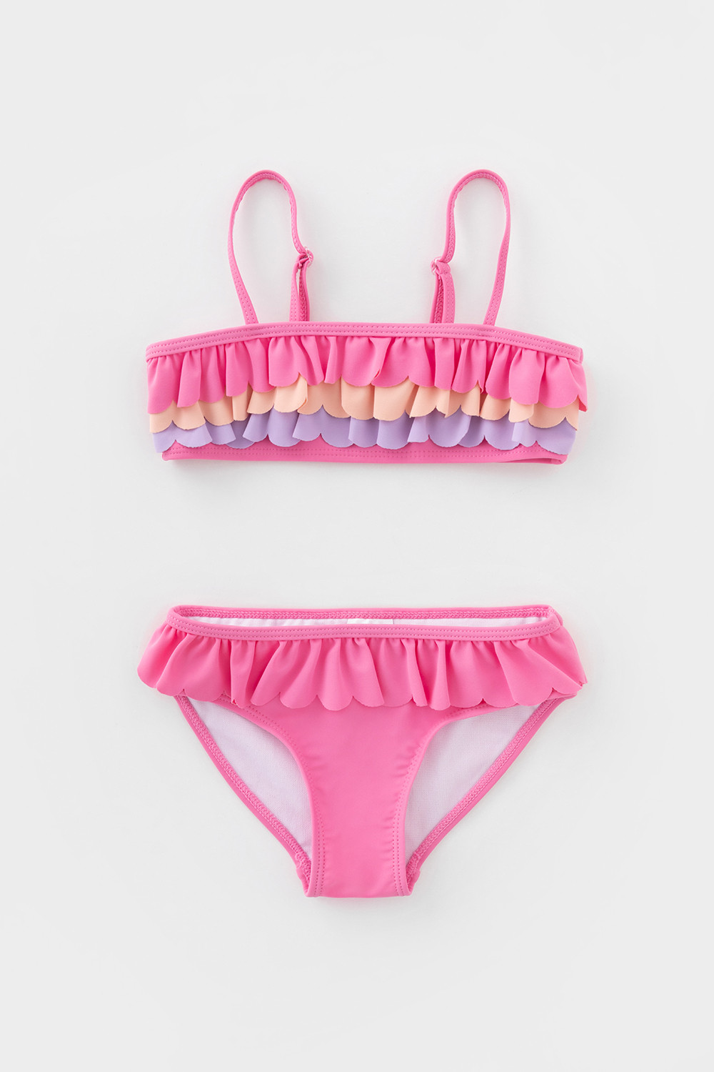 Раздельный купальник для девочки. Топ на эластичных бретелях. Плавки с оборкой на резинке. На груди и спинке воздушные оборки.
