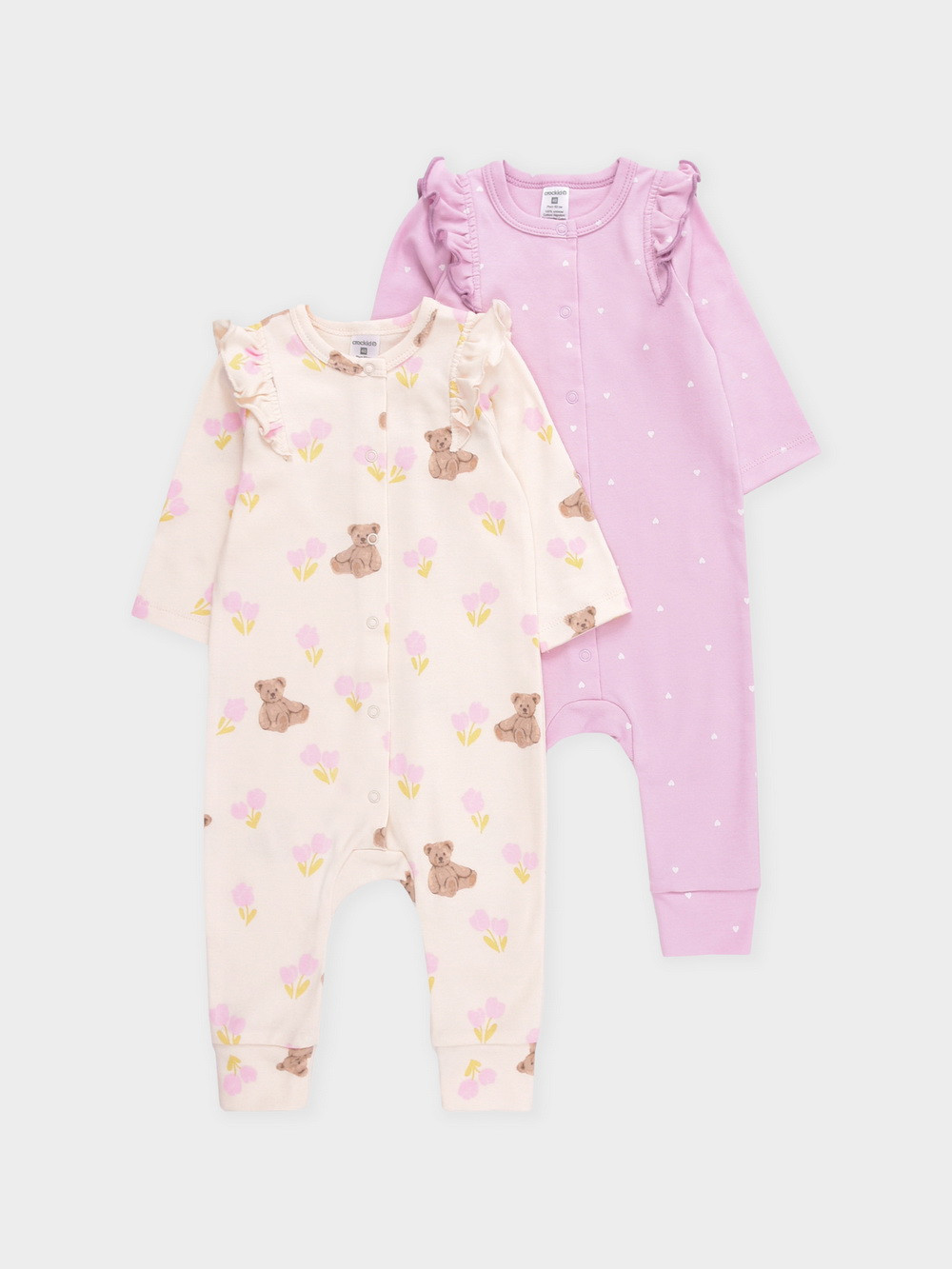 Комбинезоны для новорождённых из мягкого эластичного трикотажа, произведённого из натурального хлопка. В упаковке 2 штуки. Застёгиваются спереди на кнопки. Украшены воздушными крылышками. Оригинальная набивка выполнена из стойких гипоаллергенных текстильных красителей. Все трикотажные полотна производятся в соответствии с нормами швейцарского сертификата ЭкоТекс.