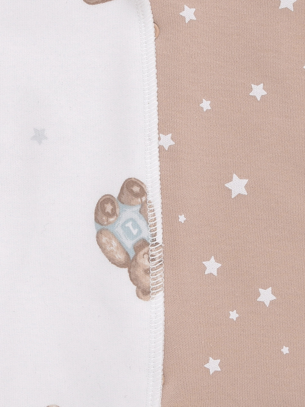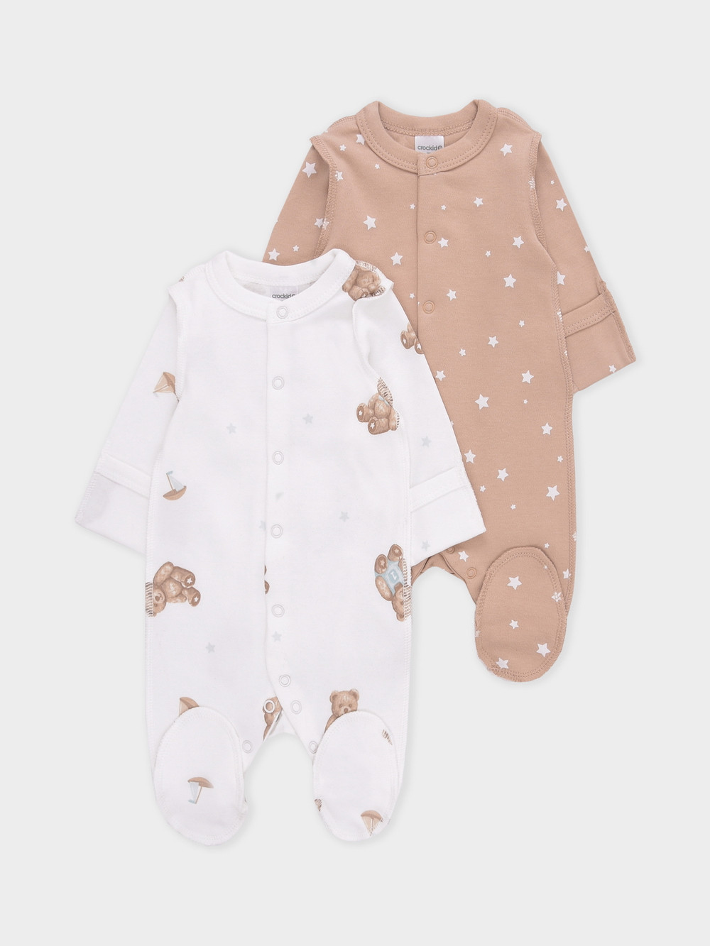 Комбинезоны для новорождённых из мягкого эластичного трикотажа, произведённого из натурального хлопка. В упаковке 2 штуки. Застёгиваются спереди на кнопки. В размере 56 на рукавах предусмотрены антицарапки, швы выполнены наружу. Оригинальная набивка выполнена из стойких гипоаллергенных текстильных красителей. Все трикотажные полотна производятся в соответствии с нормами швейцарского сертификата ЭкоТекс.