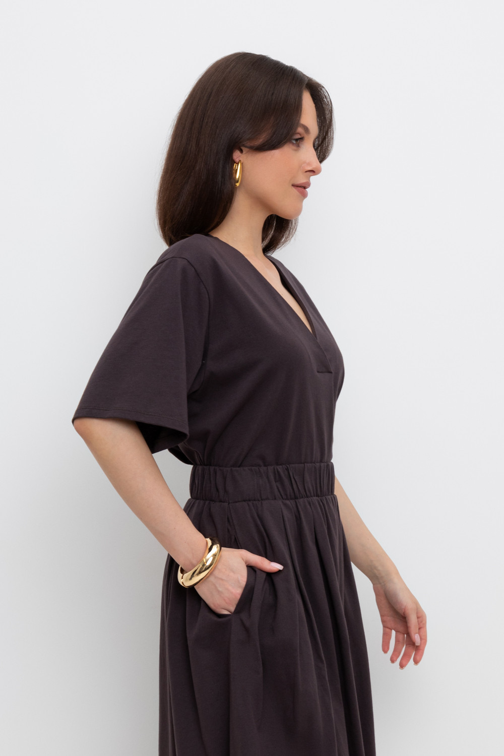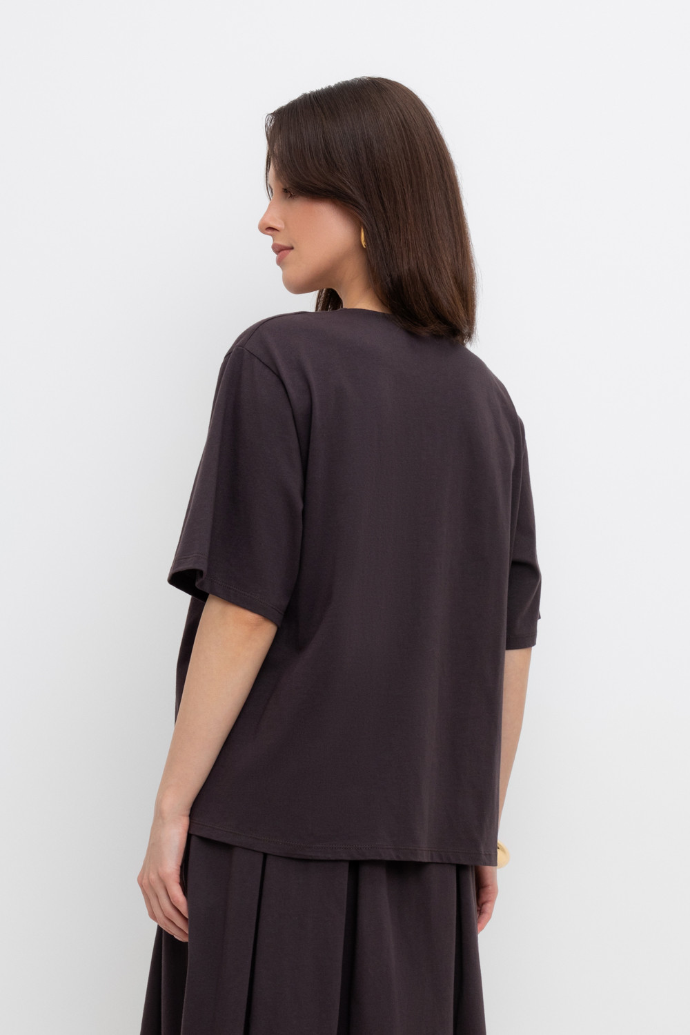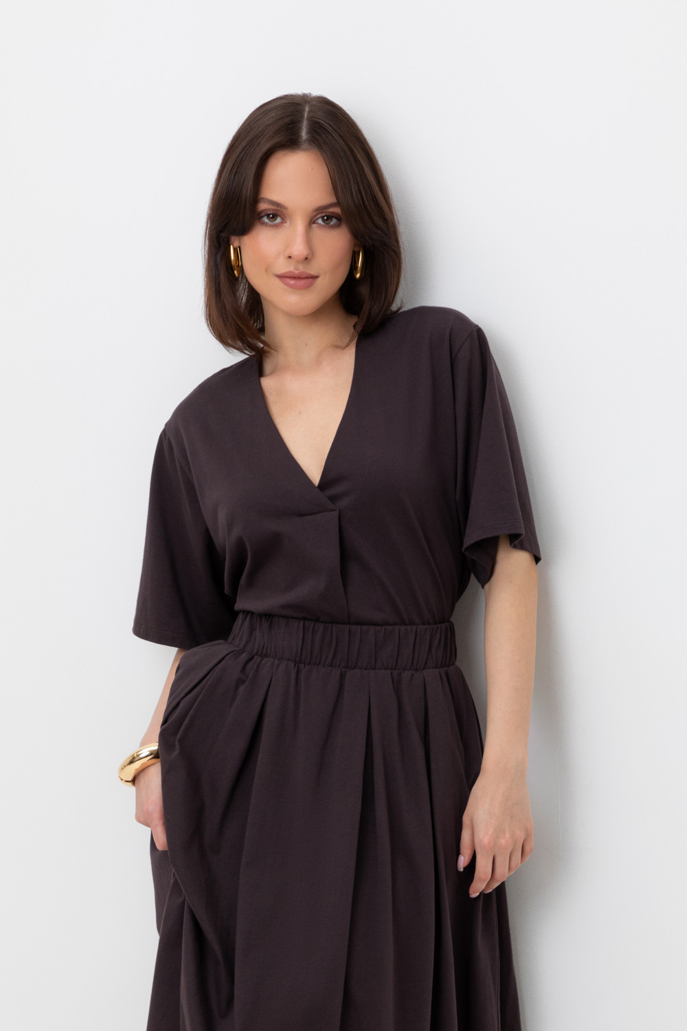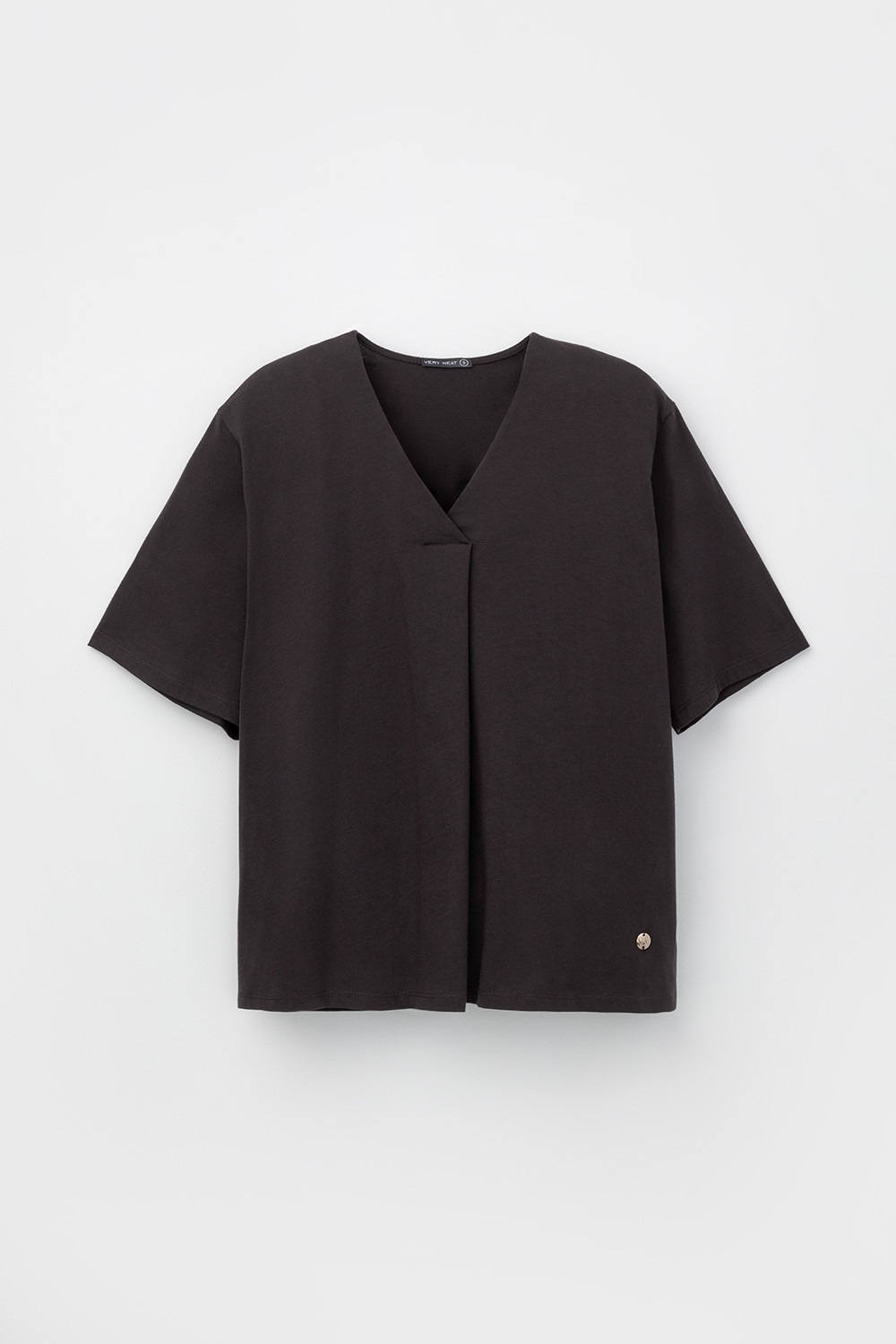 Легкая свободная блуза с короткими рукавами из длинноволокнистого гребенного хлопка. По полочке декоративная складка с эффектом запаха.