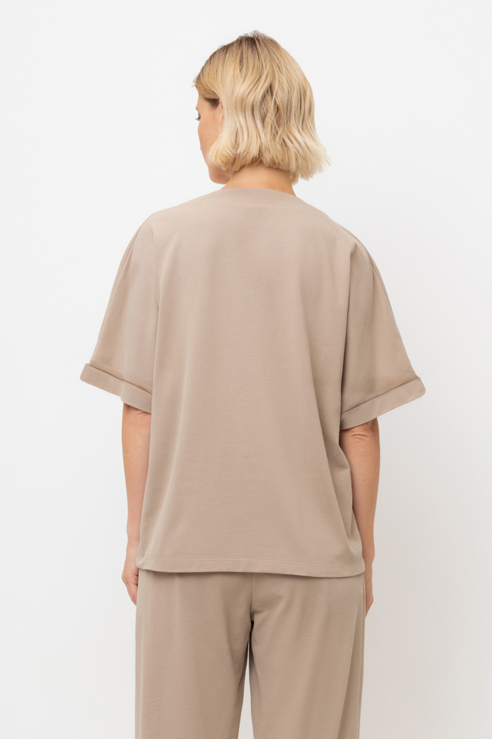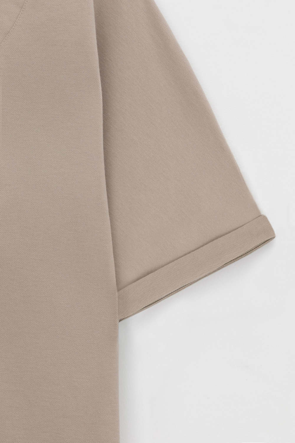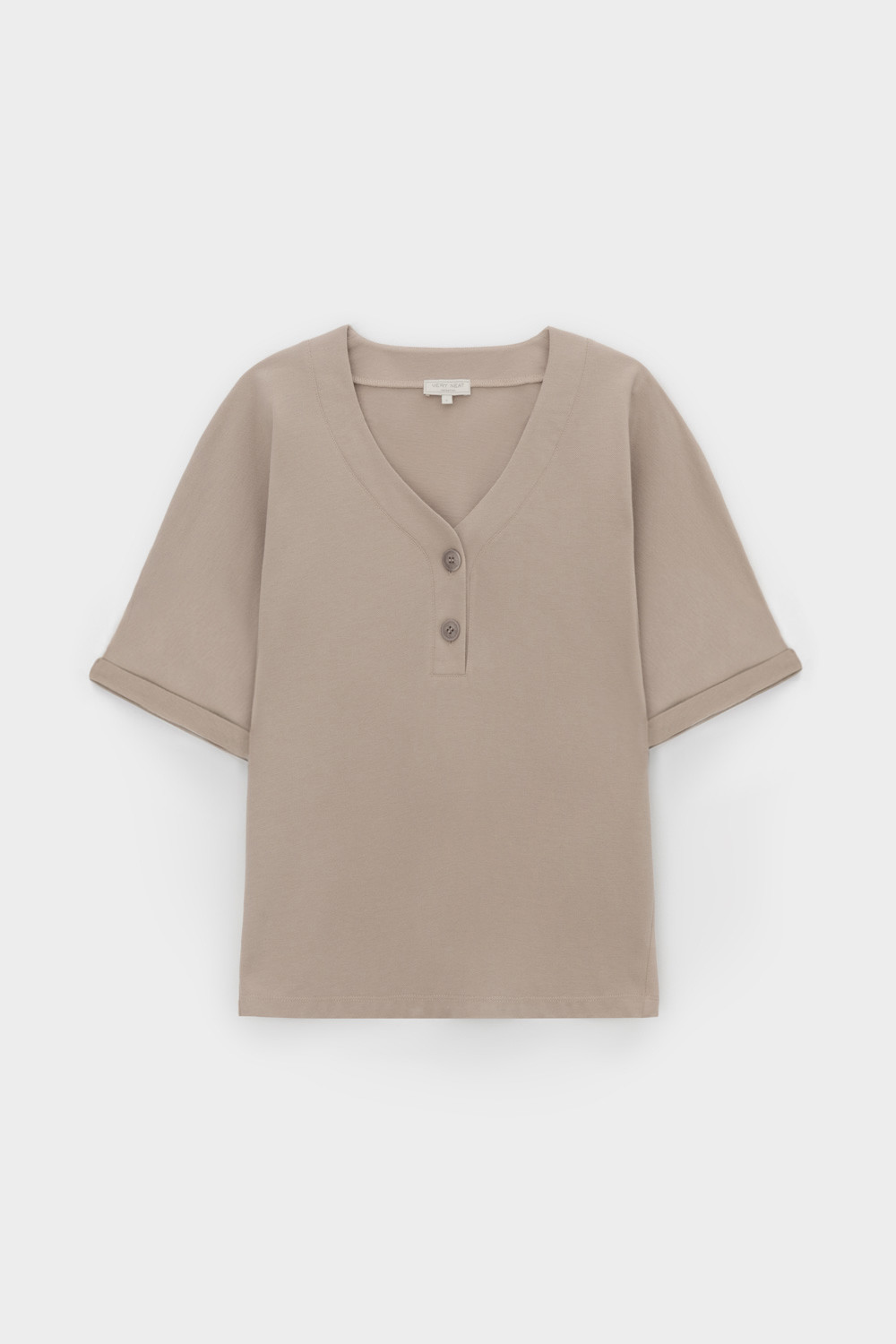 Трикотажная футболка с удлиненными рукавами изготовлена из легкого хлопка с рельефной текстурой пике. Широкие манжеты и V-вырез с пуговицами в тон изделия позволяют сочетать ее как с классическими, так и с более спортивными стилями.